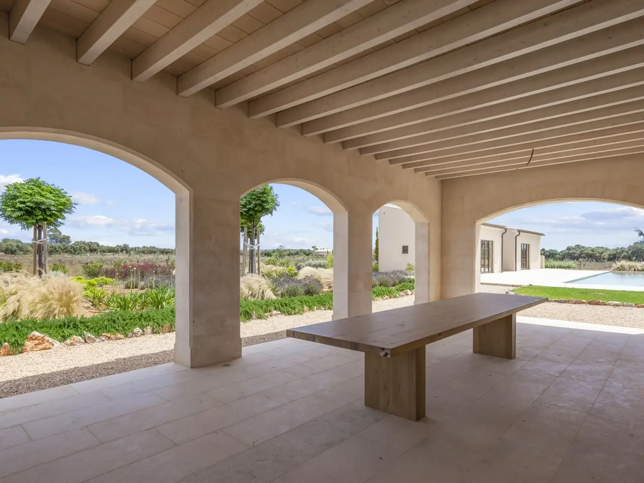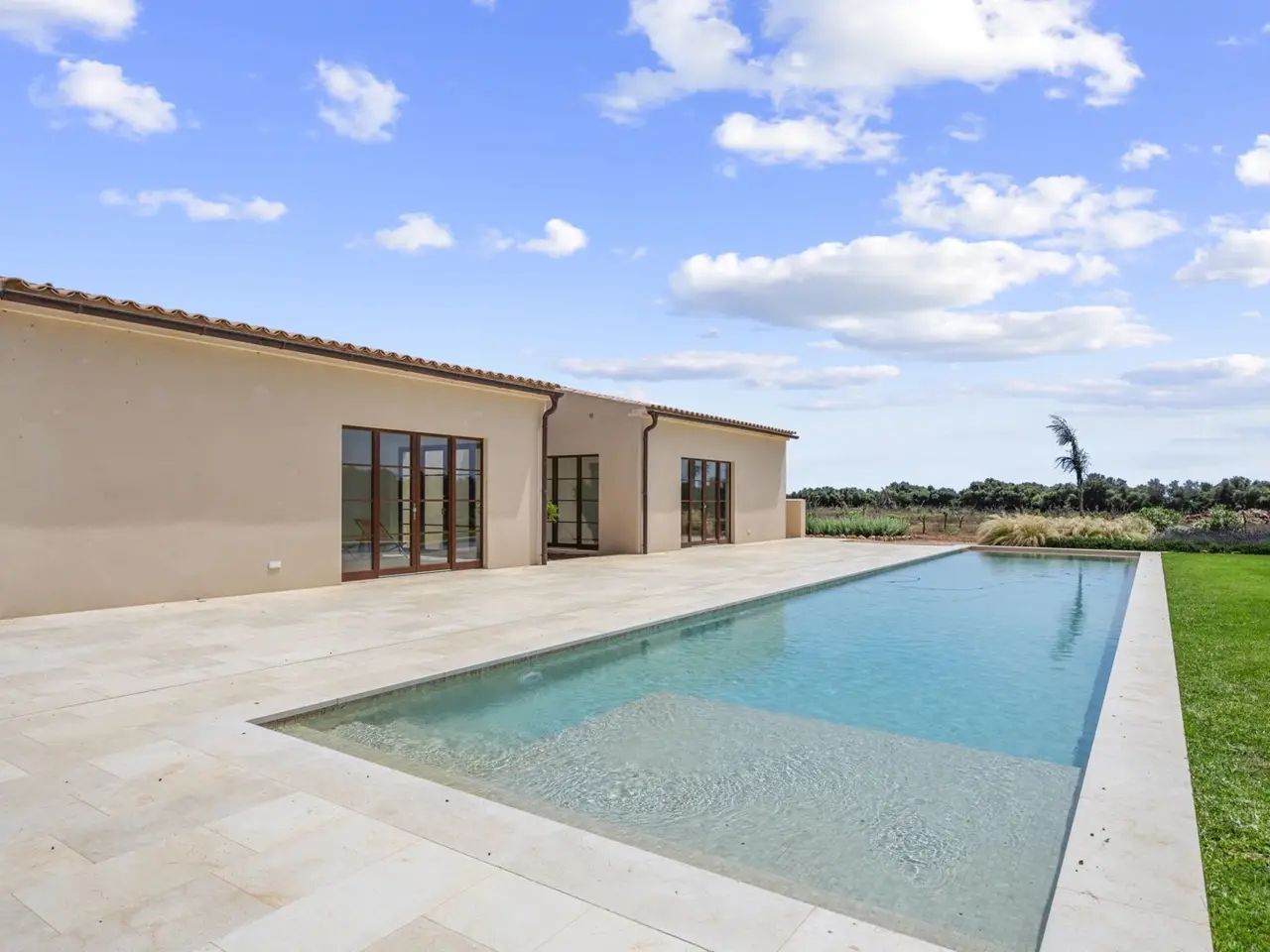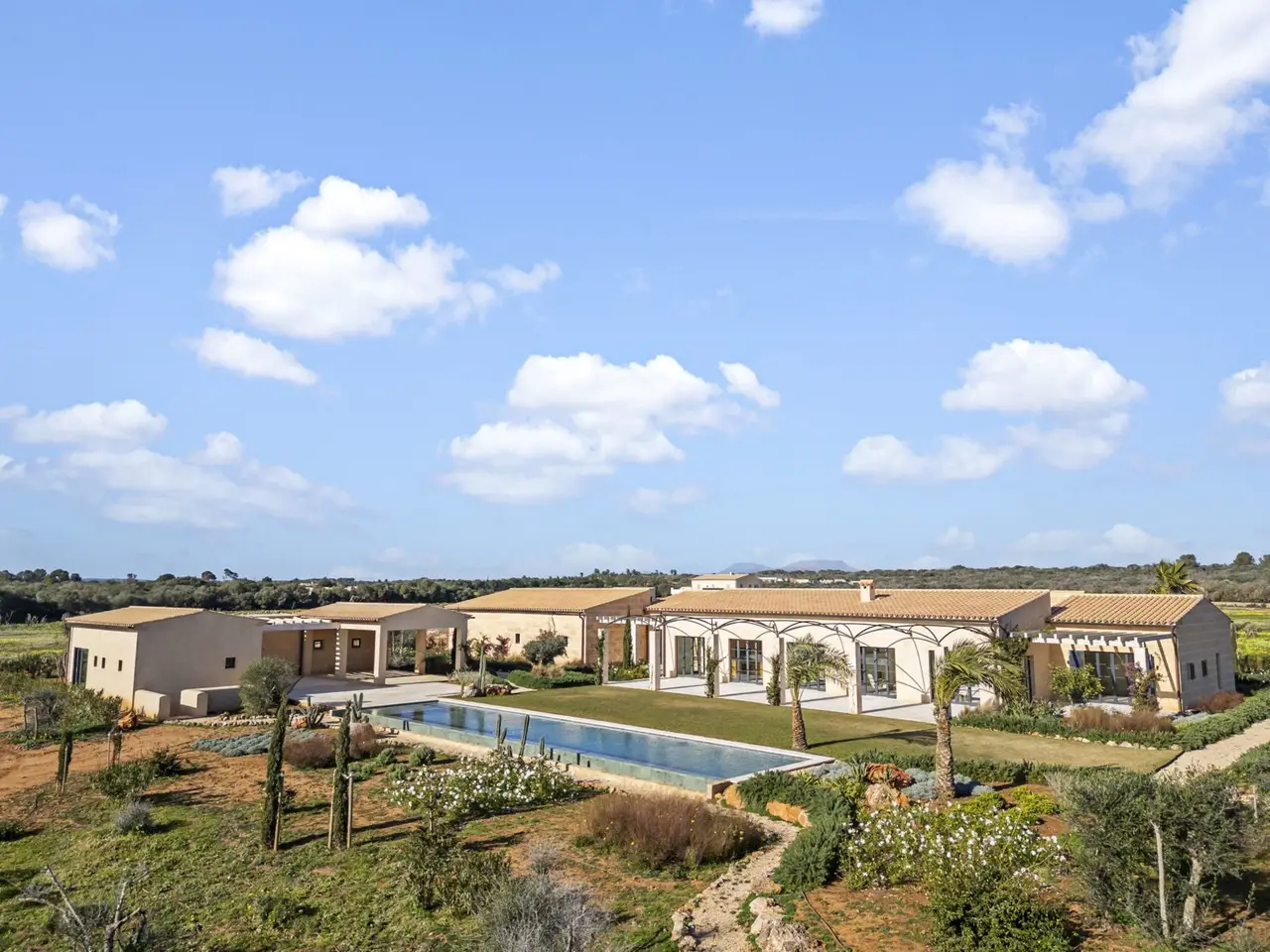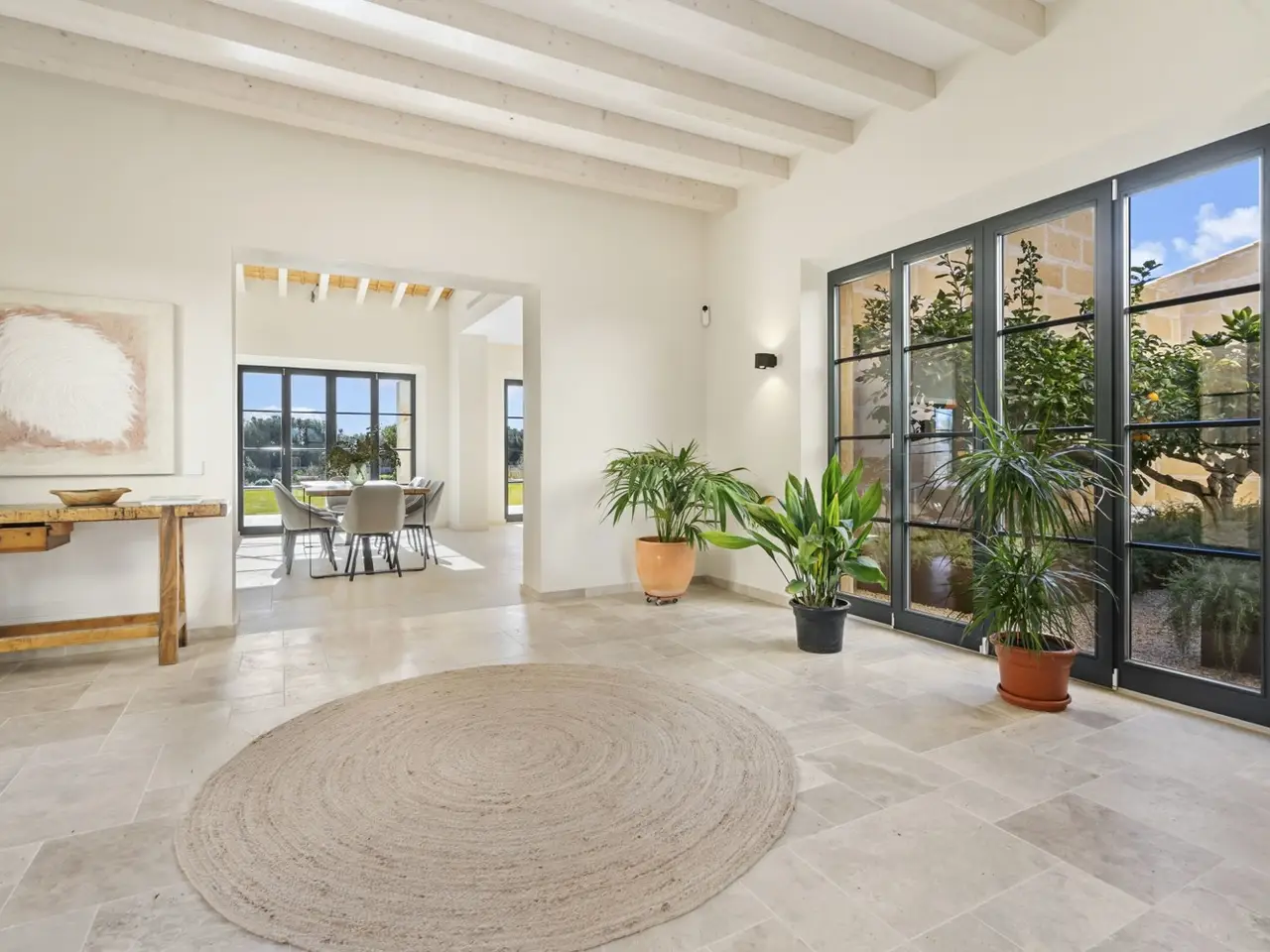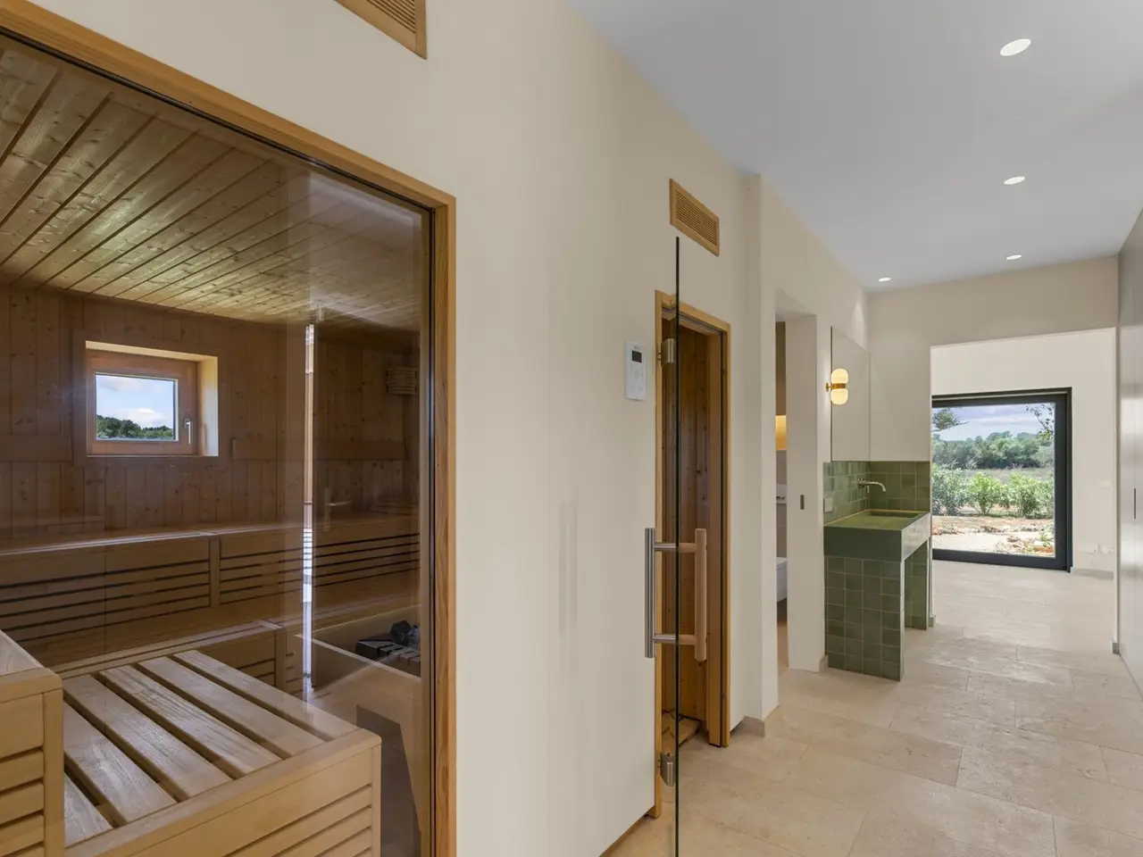 This single-storey luxury finca was built in 2024 on a spacious plot of approx. 3.21 hectares, which is located between the natural beach of Es Trenc and the village of Campos. The finca has a living area of approx. 355 m² and offers a total of four bedrooms, each with its own bathroom, as well as a guest WC. The garage has space for two vehicles. A variety of terraces invite you to enjoy the wonderful views in all directions. The Mediterranean garden is home to an impressive pool (21.5 x 4 m) and a practical pool house, which is equipped with a Finnish sauna and a spacious fitness area. Great importance was attached to high-quality materials in the construction, including wooden elements, an elegant natural stone floor and the traditional exterior façade made of Marés stone. Access to the finca via a private path lined with evergreen cypresses, rosemary and vines leads into the entrance area, which is reached via a patio with a calming water feature, and leads into the spacious living and dining area with fireplace. Adjacent is a modern, fully equipped kitchen, fitted with first-class electrical appliances. For wine lovers, there is a Merlot vineyard of approximately 2,000 m², which is expected to produce around 1,200 bottles of red wine. Further amenities include underfloor heating, air conditioning, public electricity and water connections and two water tanks of 15,000 liters each. This finca stands for exclusivity and sustainability, as it is equipped with a photovoltaic system, a 3-chamber sewage treatment plant and a rainwater harvesting system for watering the garden. Overall, this is a well thought-out finca that combines modern design with Mediterranean charm. The center of Campos with its numerous restaurants, cafés, stores and the popular weekly market can be reached in just a few minutes, and the kilometer-long Es Trenc beach, one of the most beautiful beaches on the island, is only 10 minutes away.