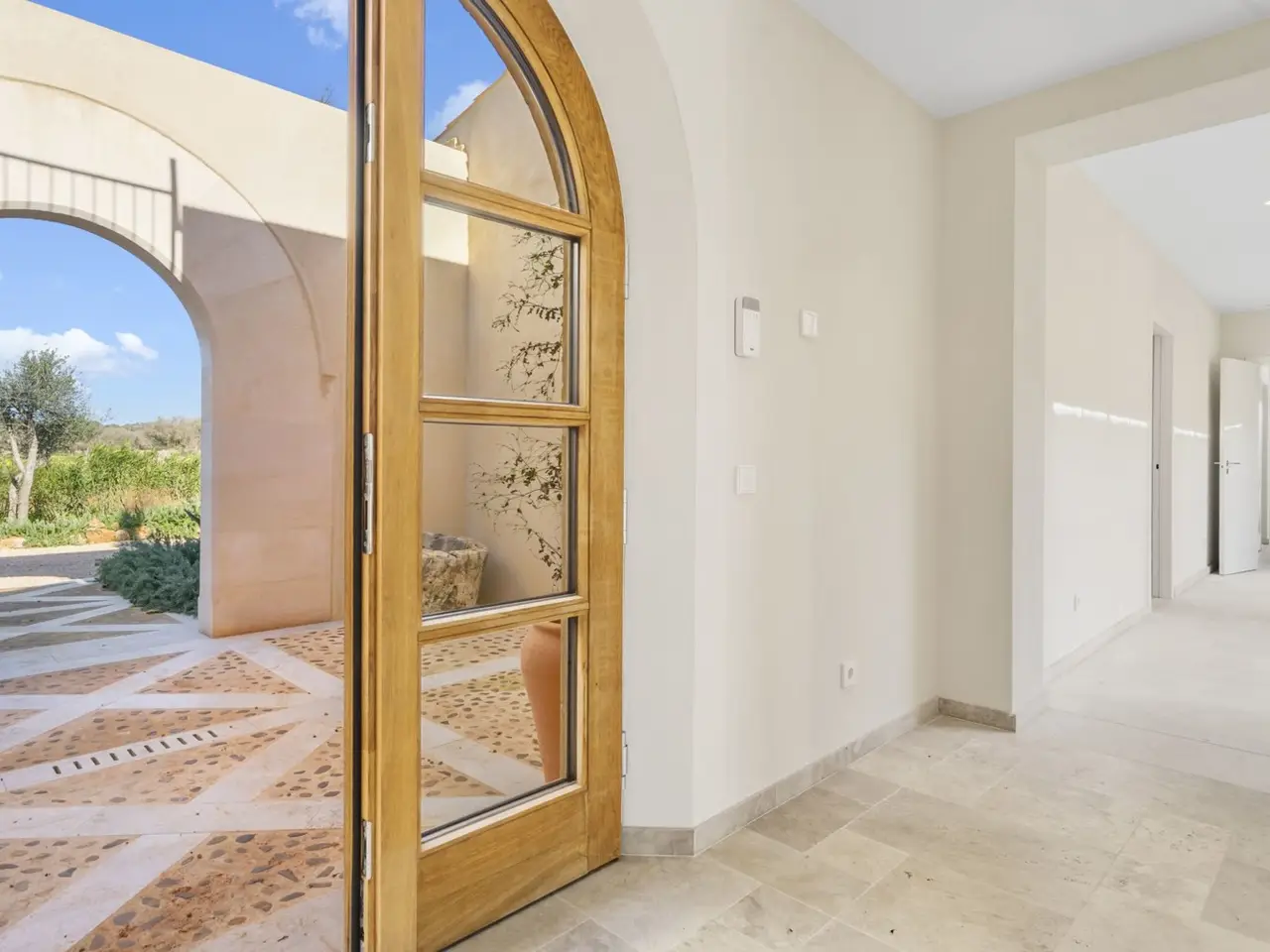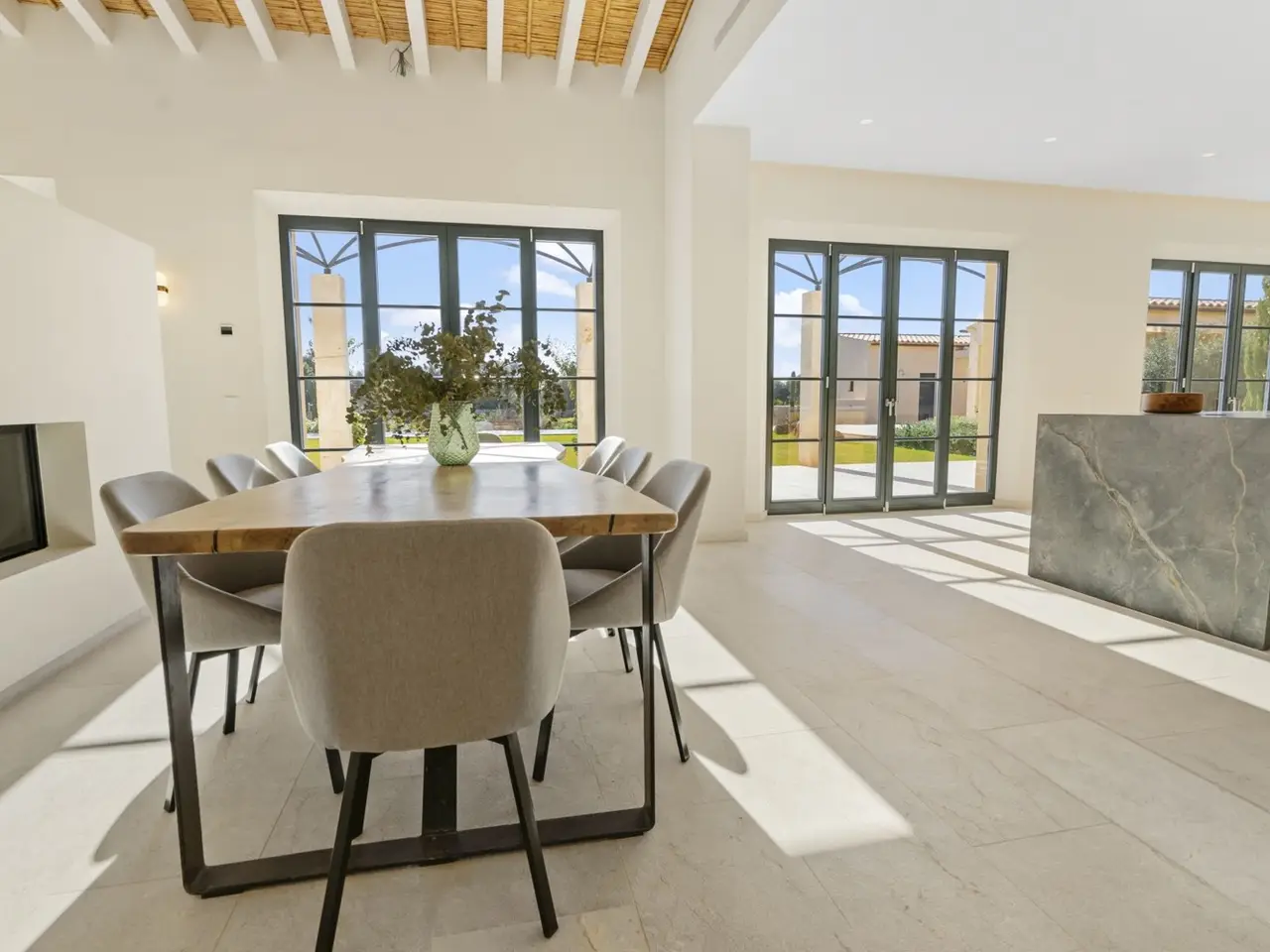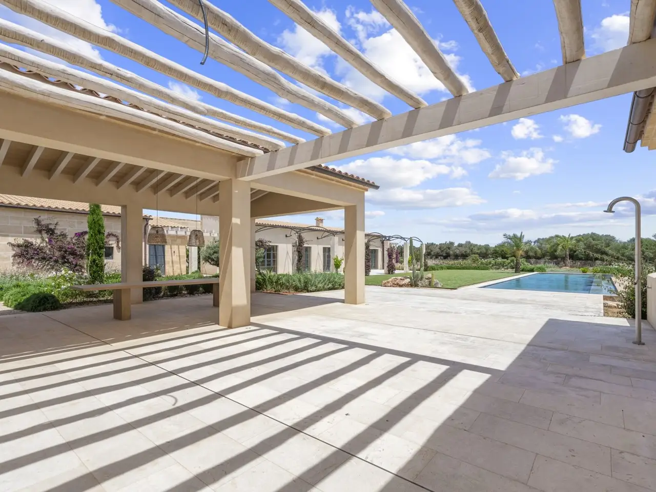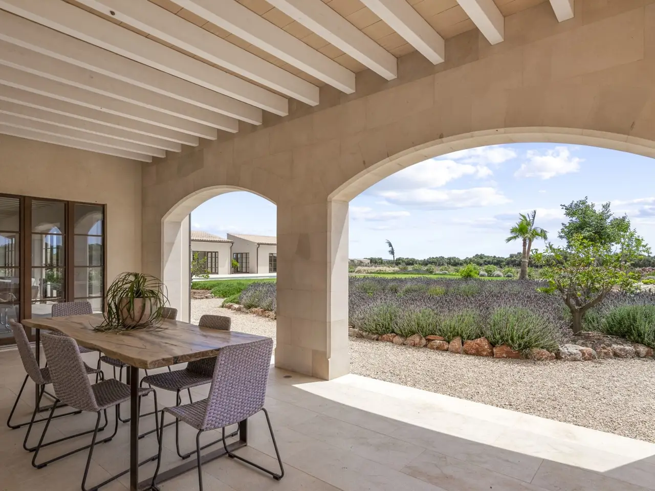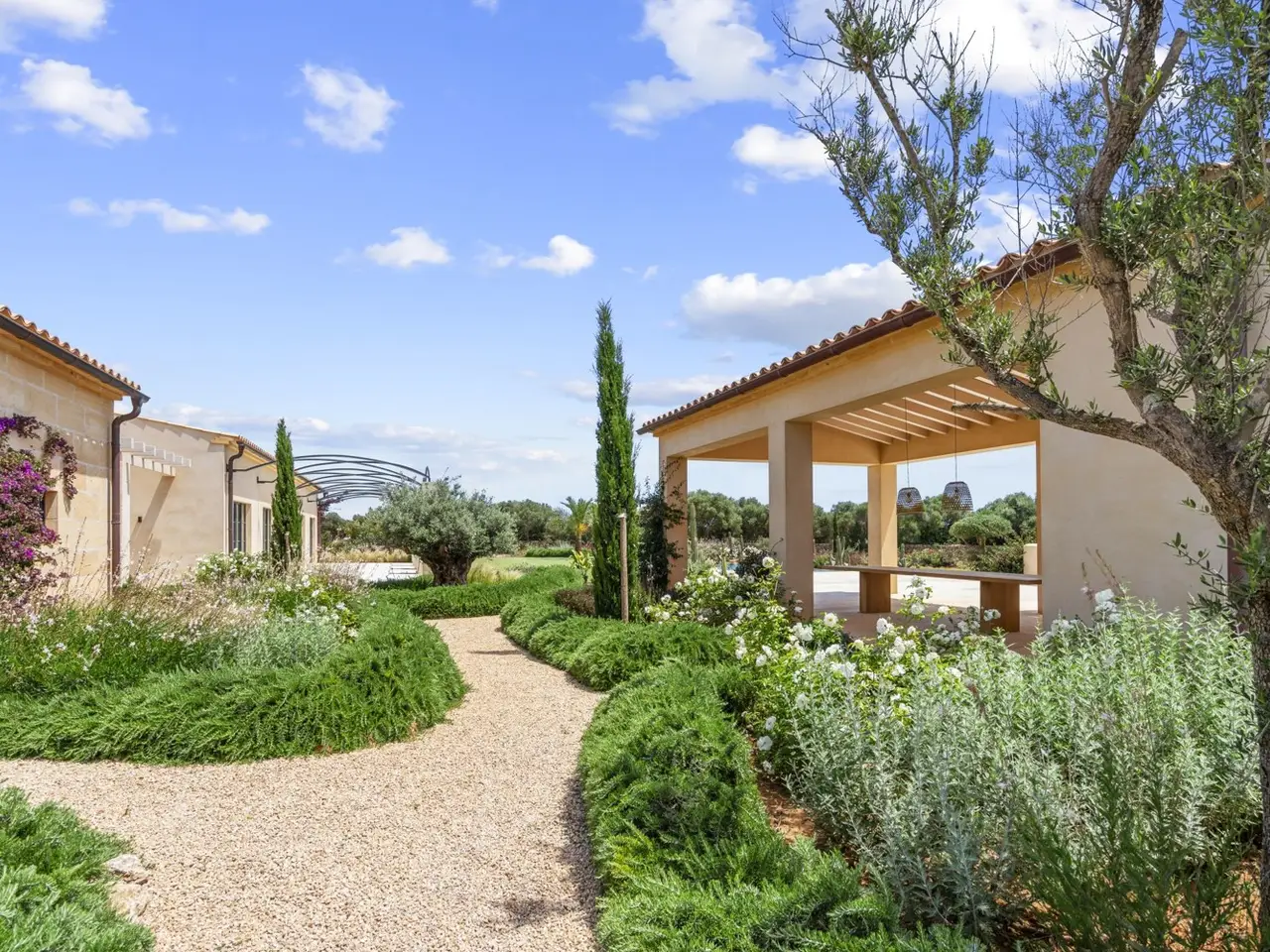 This single-storey luxury finca was built in 2024 on a spacious plot of approx. 3.21 hectares, which is located between the natural beach of Es Trenc and the village of Campos. The finca has a living area of approx. 355 m² and offers a total of four bedrooms, each with its own bathroom, as well as a guest WC. The garage has space for two vehicles. A variety of terraces invite you to enjoy the wonderful views in all directions. The Mediterranean garden is home to an impressive pool (21.5 x 4 m) and a practical pool house, which is equipped with a Finnish sauna and a spacious fitness area. Great importance was attached to high-quality materials in the construction, including wooden elements, an elegant natural stone floor and the traditional exterior façade made of Marés stone. Access to the finca via a private path lined with evergreen cypresses, rosemary and vines leads into the entrance area, which is reached via a patio with a calming water feature, and leads into the spacious living and dining area with fireplace. Adjacent is a modern, fully equipped kitchen, fitted with first-class electrical appliances. For wine lovers, there is a Merlot vineyard of approximately 2,000 m², which is expected to produce around 1,200 bottles of red wine. Further amenities include underfloor heating, air conditioning, public electricity and water connections and two water tanks of 15,000 liters each. This finca stands for exclusivity and sustainability, as it is equipped with a photovoltaic system, a 3-chamber sewage treatment plant and a rainwater harvesting system for watering the garden. Overall, this is a well thought-out finca that combines modern design with Mediterranean charm. The center of Campos with its numerous restaurants, cafés, stores and the popular weekly market can be reached in just a few minutes, and the kilometer-long Es Trenc beach, one of the most beautiful beaches on the island, is only 10 minutes away.