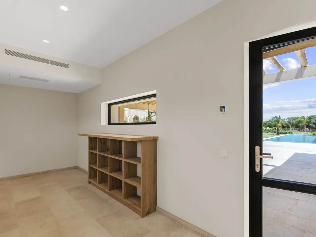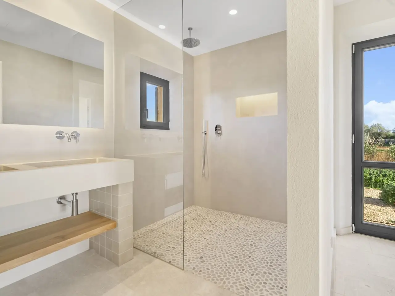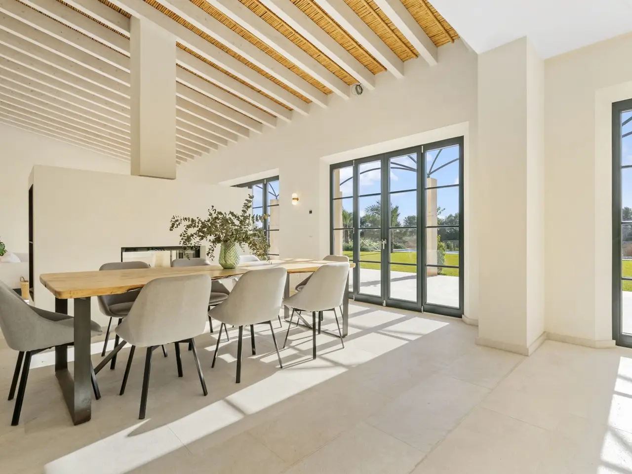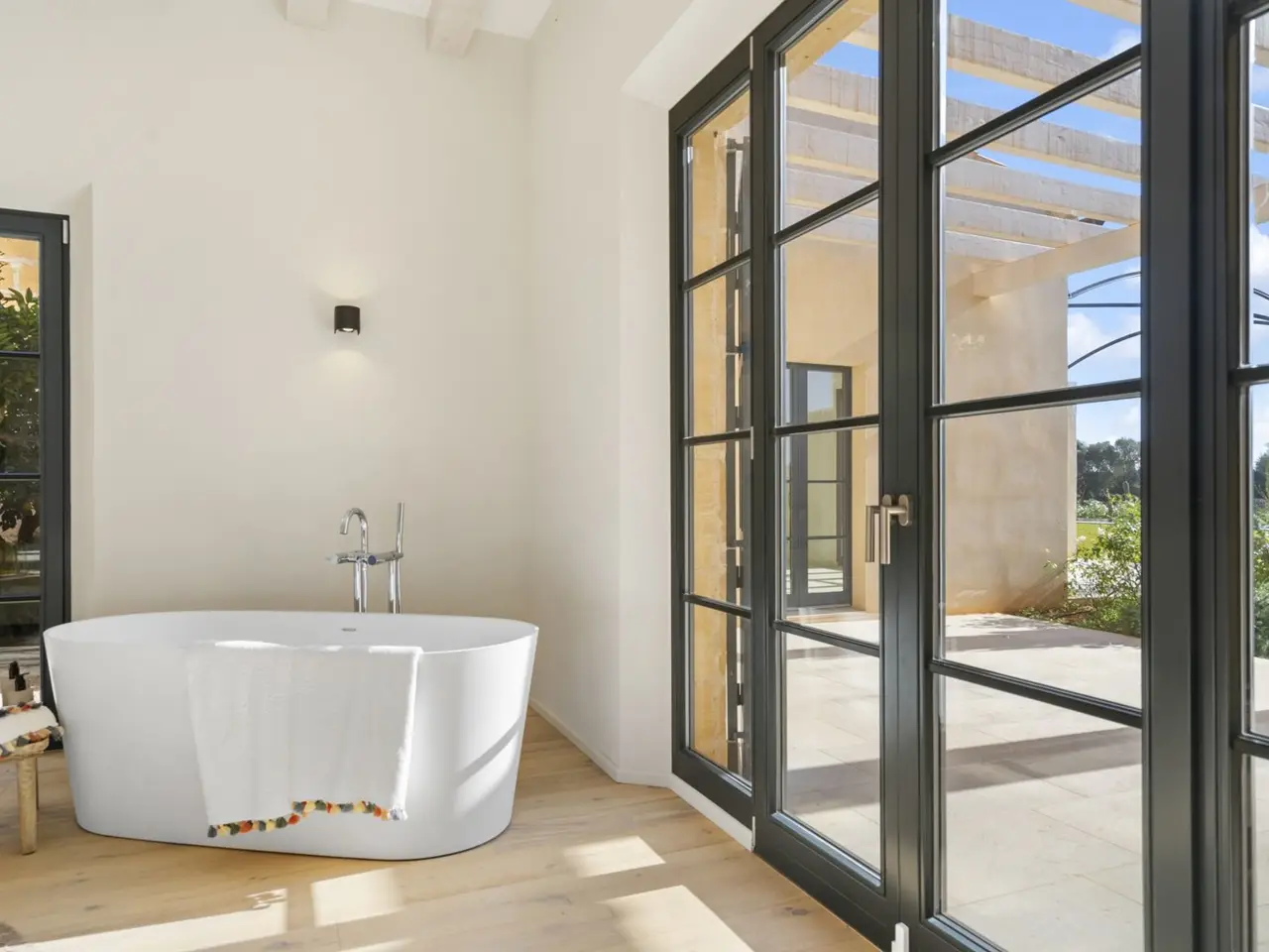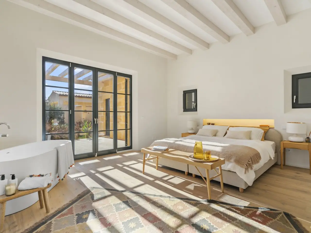 This single-storey luxury finca was built in 2024 on a spacious plot of approx. 3.21 hectares, which is located between the natural beach of Es Trenc and the village of Campos. The finca has a living area of approx. 355 m² and offers a total of four bedrooms, each with its own bathroom, as well as a guest WC. The garage has space for two vehicles. A variety of terraces invite you to enjoy the wonderful views in all directions. The Mediterranean garden is home to an impressive pool (21.5 x 4 m) and a practical pool house, which is equipped with a Finnish sauna and a spacious fitness area. Great importance was attached to high-quality materials in the construction, including wooden elements, an elegant natural stone floor and the traditional exterior façade made of Marés stone. Access to the finca via a private path lined with evergreen cypresses, rosemary and vines leads into the entrance area, which is reached via a patio with a calming water feature, and leads into the spacious living and dining area with fireplace. Adjacent is a modern, fully equipped kitchen, fitted with first-class electrical appliances. For wine lovers, there is a Merlot vineyard of approximately 2,000 m², which is expected to produce around 1,200 bottles of red wine. Further amenities include underfloor heating, air conditioning, public electricity and water connections and two water tanks of 15,000 liters each. This finca stands for exclusivity and sustainability, as it is equipped with a photovoltaic system, a 3-chamber sewage treatment plant and a rainwater harvesting system for watering the garden. Overall, this is a well thought-out finca that combines modern design with Mediterranean charm. The center of Campos with its numerous restaurants, cafés, stores and the popular weekly market can be reached in just a few minutes, and the kilometer-long Es Trenc beach, one of the most beautiful beaches on the island, is only 10 minutes away.