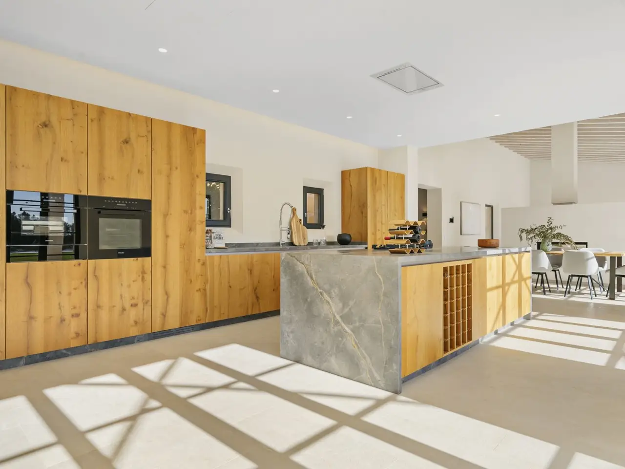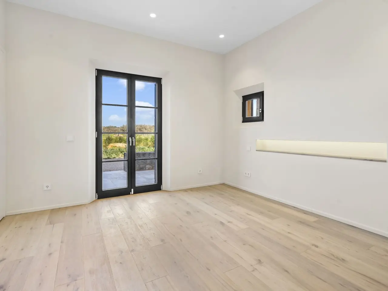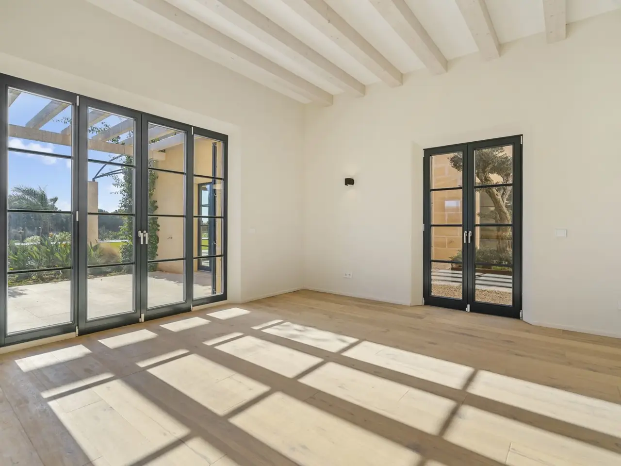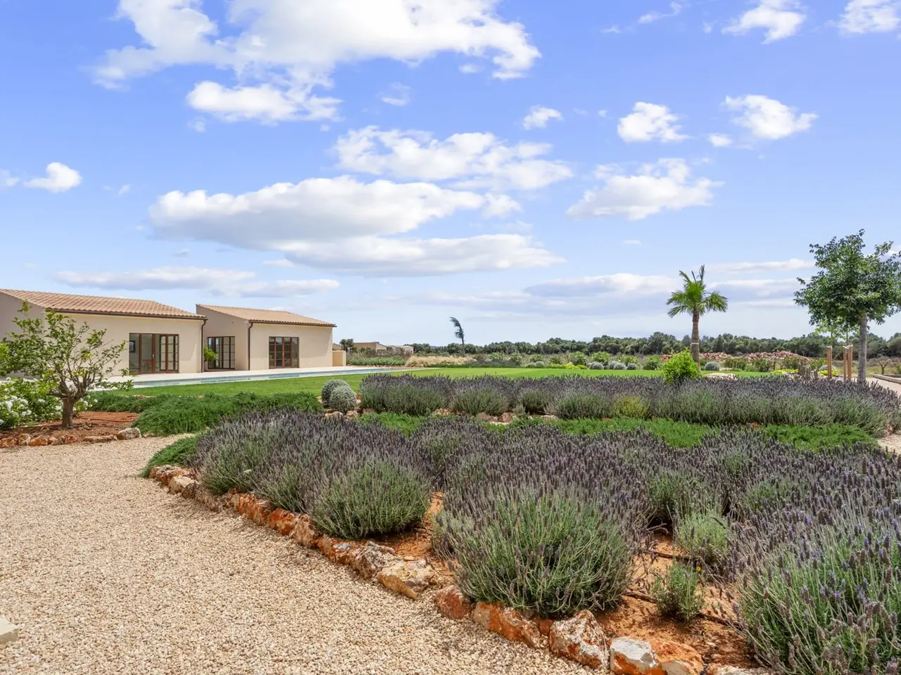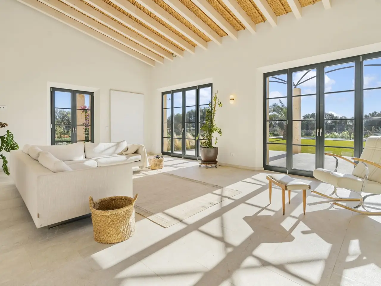 This single-storey luxury finca was built in 2024 on a spacious plot of approx. 3.21 hectares, which is located between the natural beach of Es Trenc and the village of Campos. The finca has a living area of approx. 355 m² and offers a total of four bedrooms, each with its own bathroom, as well as a guest WC. The garage has space for two vehicles. A variety of terraces invite you to enjoy the wonderful views in all directions. The Mediterranean garden is home to an impressive pool (21.5 x 4 m) and a practical pool house, which is equipped with a Finnish sauna and a spacious fitness area. Great importance was attached to high-quality materials in the construction, including wooden elements, an elegant natural stone floor and the traditional exterior façade made of Marés stone. Access to the finca via a private path lined with evergreen cypresses, rosemary and vines leads into the entrance area, which is reached via a patio with a calming water feature, and leads into the spacious living and dining area with fireplace. Adjacent is a modern, fully equipped kitchen, fitted with first-class electrical appliances. For wine lovers, there is a Merlot vineyard of approximately 2,000 m², which is expected to produce around 1,200 bottles of red wine. Further amenities include underfloor heating, air conditioning, public electricity and water connections and two water tanks of 15,000 liters each. This finca stands for exclusivity and sustainability, as it is equipped with a photovoltaic system, a 3-chamber sewage treatment plant and a rainwater harvesting system for watering the garden. Overall, this is a well thought-out finca that combines modern design with Mediterranean charm. The center of Campos with its numerous restaurants, cafés, stores and the popular weekly market can be reached in just a few minutes, and the kilometer-long Es Trenc beach, one of the most beautiful beaches on the island, is only 10 minutes away.