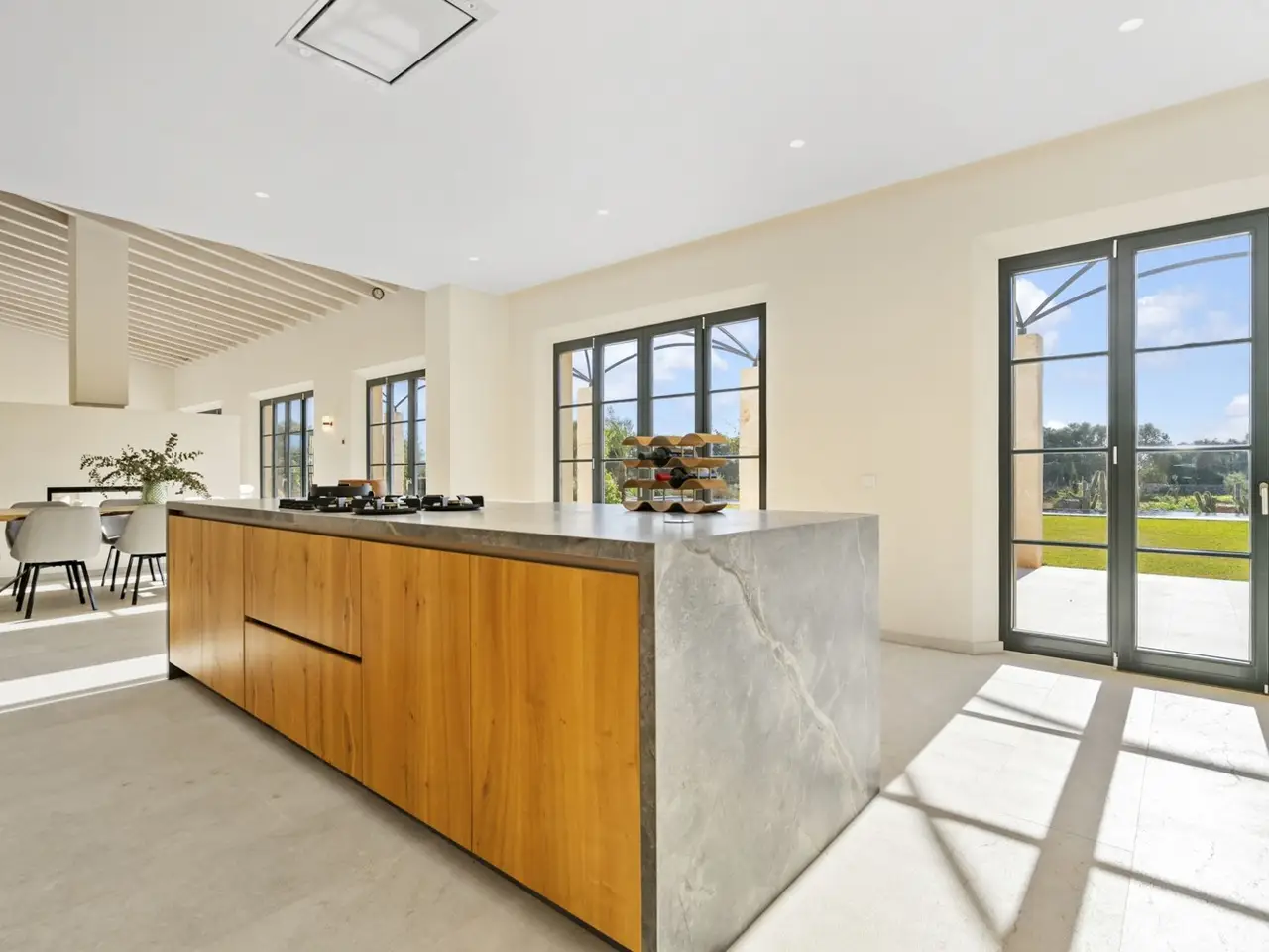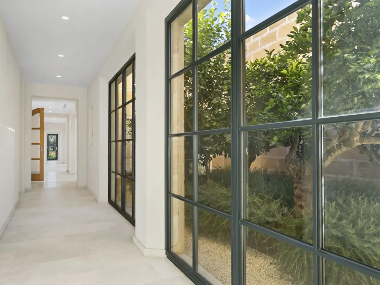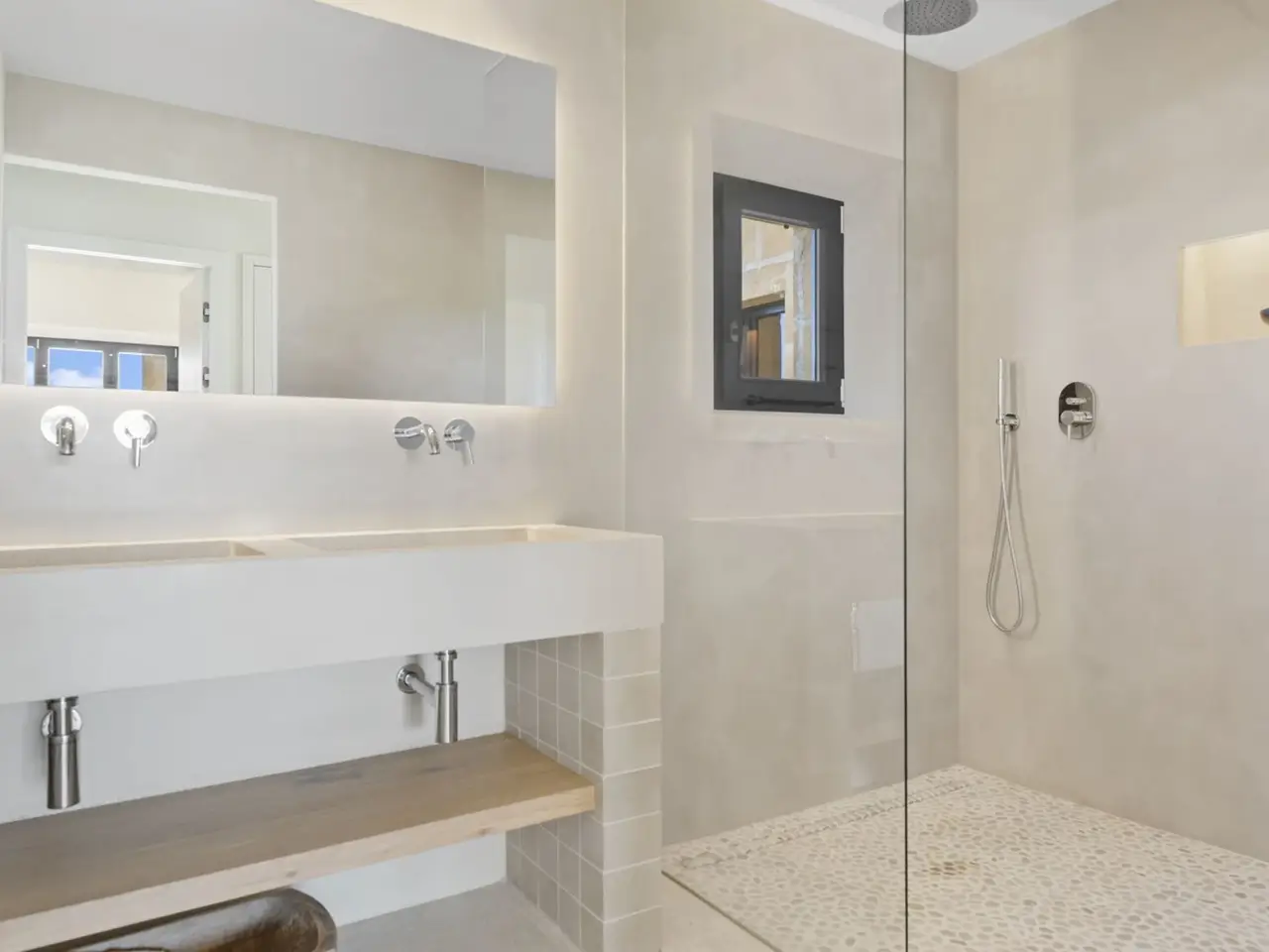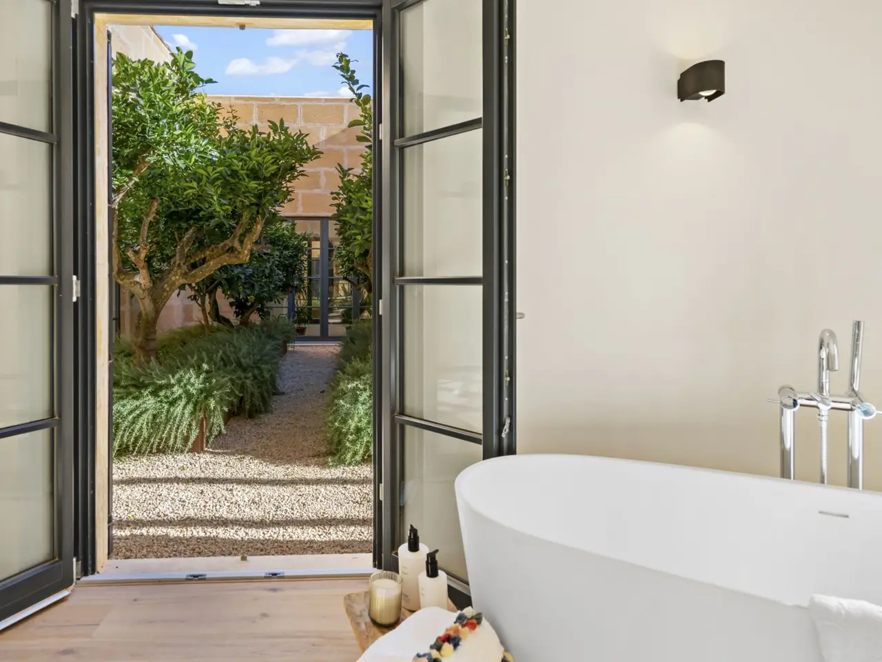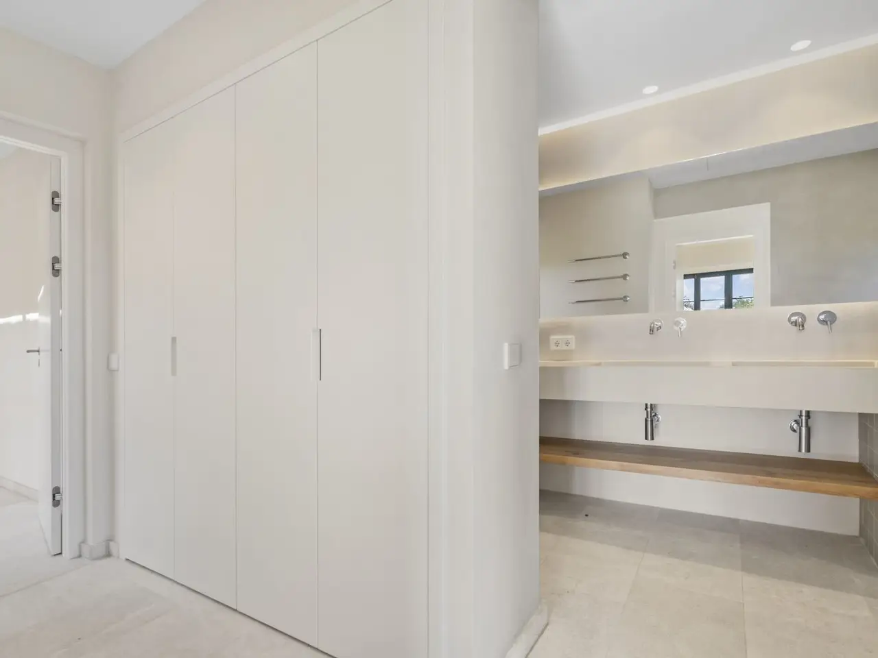This single-storey luxury finca was built in 2024 on a spacious plot of approx. 3.21 hectares, which is located between the natural beach of Es Trenc and the village of Campos. The finca has a living area of approx. 355 m² and offers a total of four bedrooms, each with its own bathroom, as well as a guest WC. The garage has space for two vehicles. A variety of terraces invite you to enjoy the wonderful views in all directions. The Mediterranean garden is home to an impressive pool (21.5 x 4 m) and a practical pool house, which is equipped with a Finnish sauna and a spacious fitness area. Great importance was attached to high-quality materials in the construction, including wooden elements, an elegant natural stone floor and the traditional exterior façade made of Marés stone. Access to the finca via a private path lined with evergreen cypresses, rosemary and vines leads into the entrance area, which is reached via a patio with a calming water feature, and leads into the spacious living and dining area with fireplace. Adjacent is a modern, fully equipped kitchen, fitted with first-class electrical appliances. For wine lovers, there is a Merlot vineyard of approximately 2,000 m², which is expected to produce around 1,200 bottles of red wine. Further amenities include underfloor heating, air conditioning, public electricity and water connections and two water tanks of 15,000 liters each. This finca stands for exclusivity and sustainability, as it is equipped with a photovoltaic system, a 3-chamber sewage treatment plant and a rainwater harvesting system for watering the garden. Overall, this is a well thought-out finca that combines modern design with Mediterranean charm. The center of Campos with its numerous restaurants, cafés, stores and the popular weekly market can be reached in just a few minutes, and the kilometer-long Es Trenc beach, one of the most beautiful beaches on the island, is only 10 minutes away.
