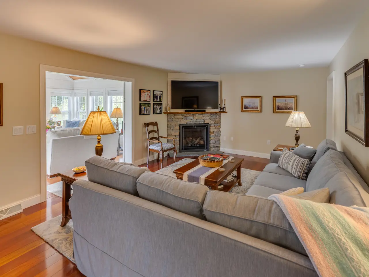 Pride of ownership exudes from this Cape-style Mountain home. Outstanding curb appeal and perched on a 5-acre private lot with lush green grass, landscaping, Mount Moosilauke views, and frontage on the Beebe River. The dynamic floor plan features a large dining room, a home office, and a spacious living room with a gas fireplace, which opens to a stunning new, light-filled sunroom. Two large first-floor bedrooms provide single-level living and ensuite convenience. The renovated kitchen offers newer appliances, flooring, and beautiful leathered granite counters. The 2nd floor offers ample space for family and guests, featuring a new family room and bedroom. A detached, heated two-car garage is perfect for snowmobiles, boats, and other vehicles. New and highly efficient geothermal heating and cooling, along with a whole-house generator, make this property the envy of the neighborhood. Sit back and relax with your morning coffee on the front farmer's porch. Close to both the lakes & mountains for four seasons of NH fun.