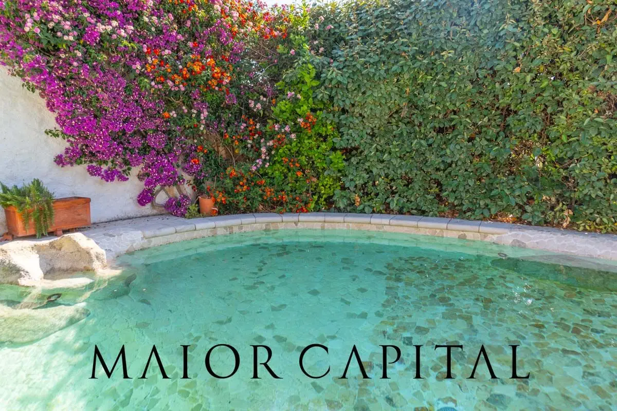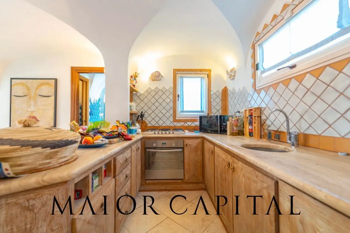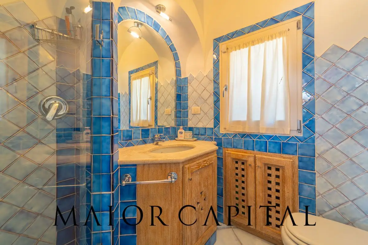 Immersed in total privacy, the villa is surrounded by an elegant hedge and a tiled courtyard embellished with Mediterranean essences. The exteriors offer covered and uncovered verandas overlooking the sea, refined masonry sofas, sunbathing areas, an outdoor kitchen equipped with a barbecue, and a splendid swimming pool lined with natural stone mosaic. All spaces are designed to fully experience the Sardinian climate and lifestyle.