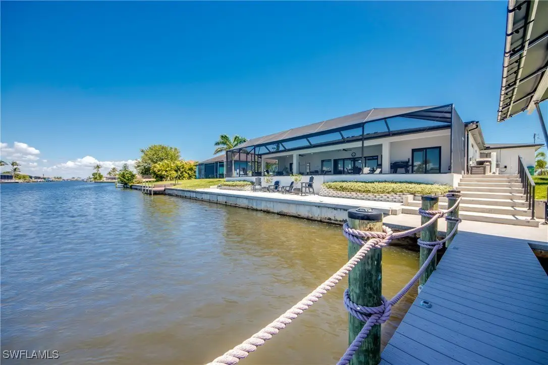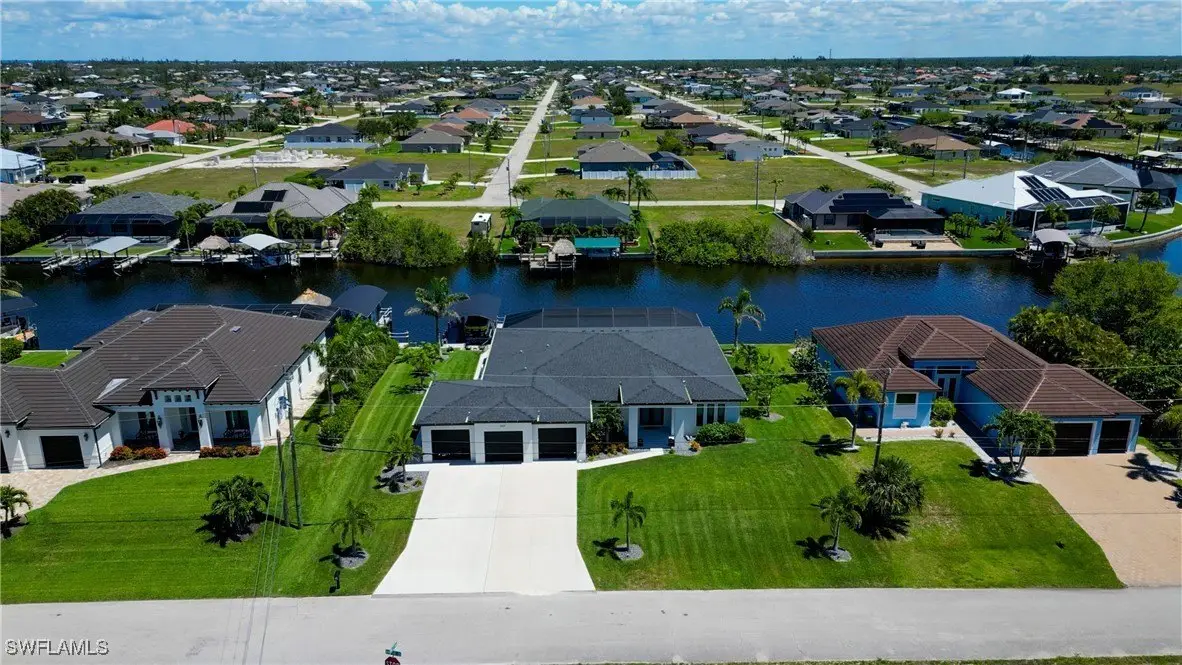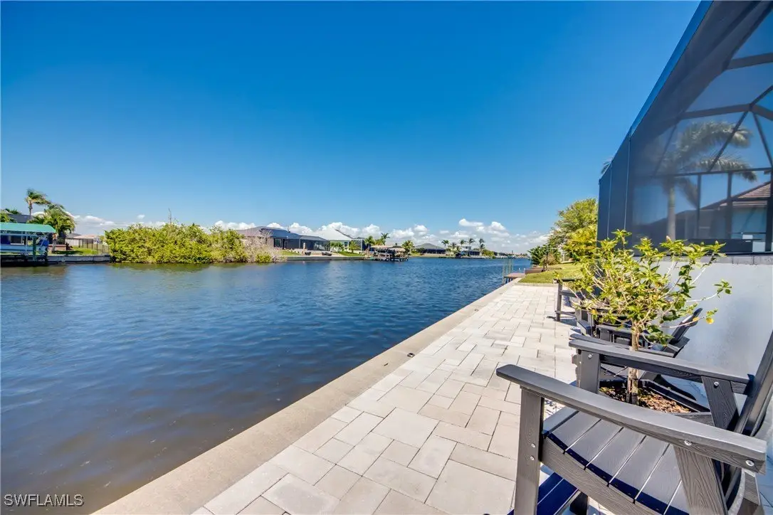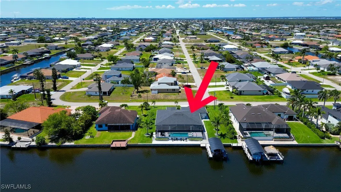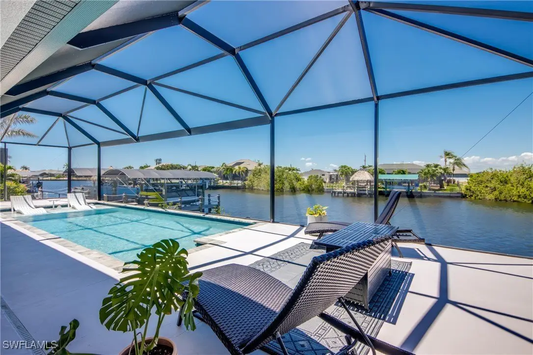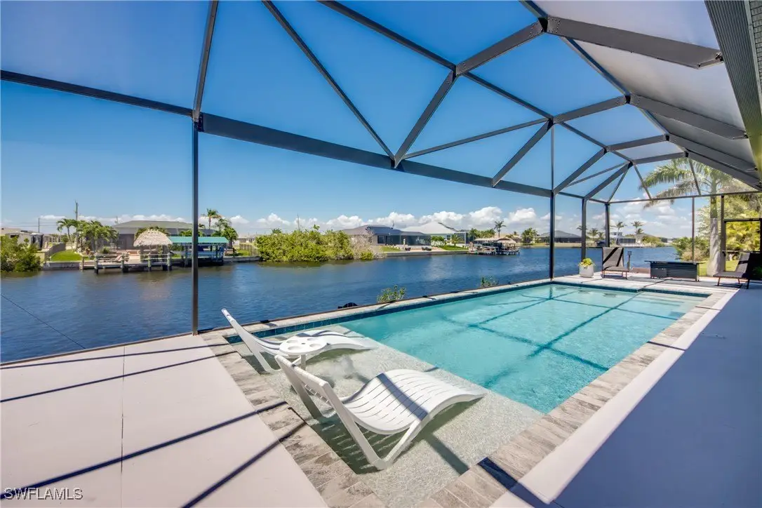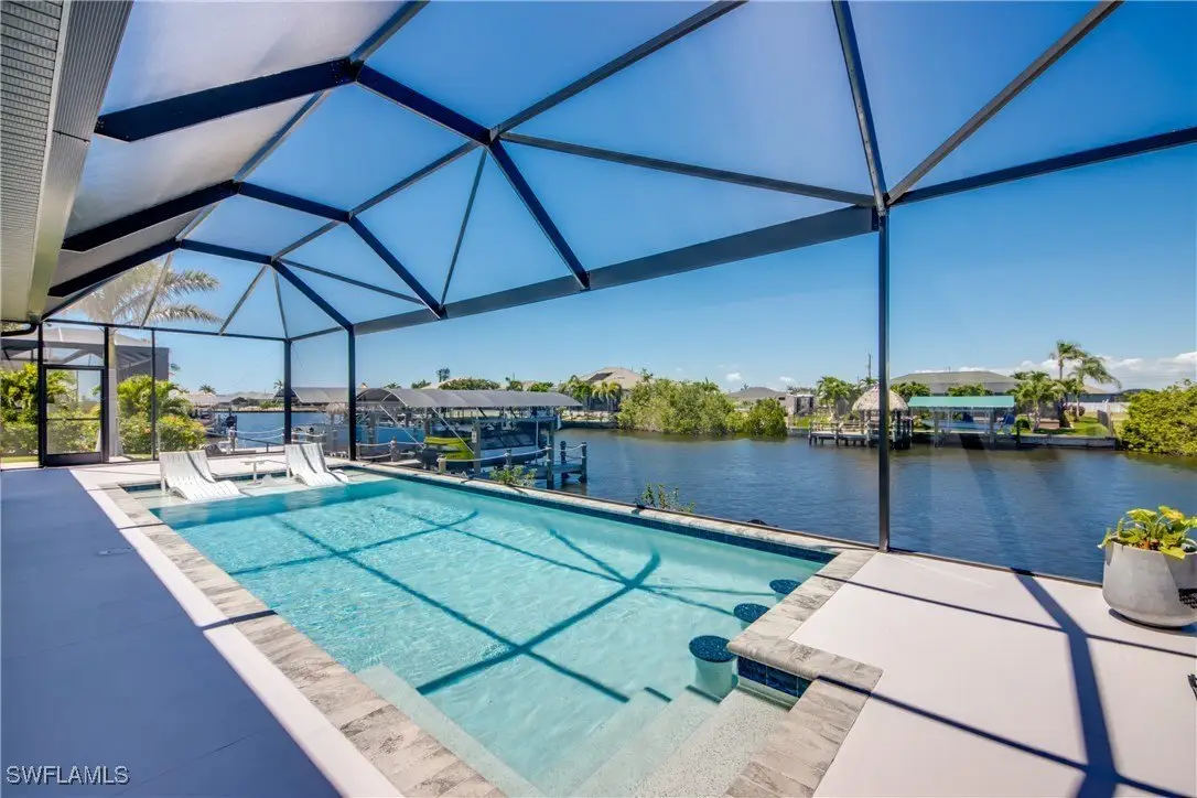 Stunning, 3-lot site custom pool home with over 2600 sq ft and exceptional water views in NW Cape Coral! Built in 2022, this 5 bed/2.5 bath, 1000 sq ft 3-car garage home was built to the highest standards, exceeding Miami/Dade County regulatory codes. LOMR-F has been applied for and will be approved within 60 days. The property will then be labeled "NOT in a Flood Zone". The home is further secured with hurricane impact glass doors and windows and prewired for a whole-house generator. From extra tie trusses to the concrete-filled pool cage uprights reinforced with 5/8 " rebar, the builder spared no expense in safeguarding your future investment! Custom designed from top to bottom and with gorgeous wall to wall windows and sliders, this home offers the very best in luxury waterfront living. From the open-concept chef's kitchen, spacious great room and spa-like primary bath to the backyard oasis, there's something for everyone. Gourmet kitchen features include: a whole home R/O system, an expansive full slab granite island with high top breakfast bar, a black composite double sink and designer backsplash, a convenient pot filler and magnetic knife holder, soft shut cabinetry with wide, pot-holding drawers and a corner Lazy Susan. Additionally, the home uses cable fiber and has a whole house integrated WIFI system and is even wired for network drops. Directly off the kitchen is a delightful butler's pantry and coffee bar with a separate walk-in pantry for food storage. The laundry extends into a multi-use area with a W/D, a 2nd refrigerator, a half bath and sink and a laundry folding and storage station. The primary bedroom is open and airy with lanai access and an ensuite bath that boasts a double vanity and makeup table, a large walk-in closet and a free-standing soaking tub and oversized granite surround shower. The secondary bedroom also enjoys lanai access, a walk-in closet and an ensuite bath that has a pool entrance as well. There are 3 more ample sized guestrooms with one located at the front of the house - perfect for a home office or den. Outdoors is a true boater's paradise! Enjoy the breathtaking, extra-wide and intersecting canal views from the pristine deck, the Captain's Walk and boat dock along with its new canopy cover and 10,000 lb lift. Or enjoy lounging on the expansive lanai and covered patio or taking a dip in the sparkling, heated 12x31 pool with its sun shelf entry, bubblers and swim up granite barstools. Surrounded by lush, mature landscaping in a private and quiet setting. Electrical has been added for an outdoor kitchen and plumbed for an outdoor shower as well as wired for outside security cameras. Endless possibilities to make this home your own. Schedule a private showing today!