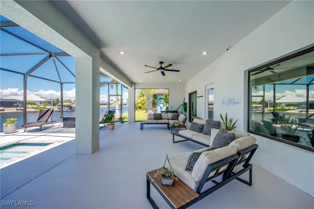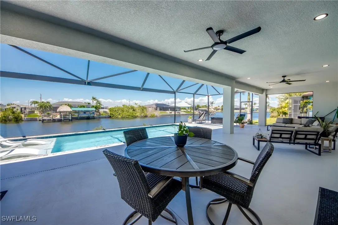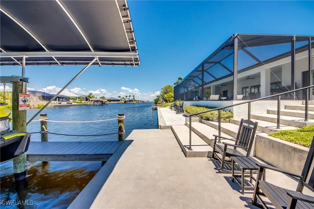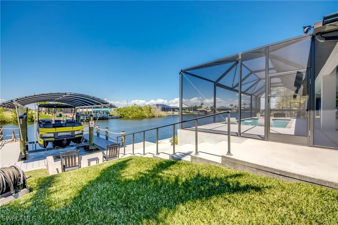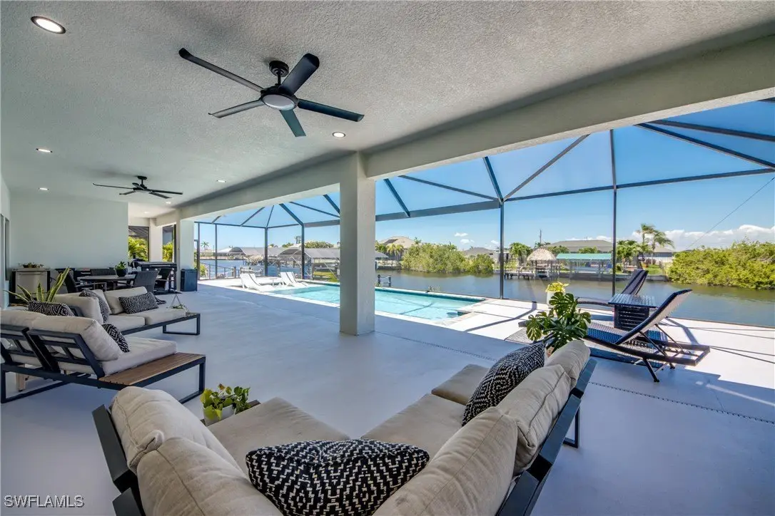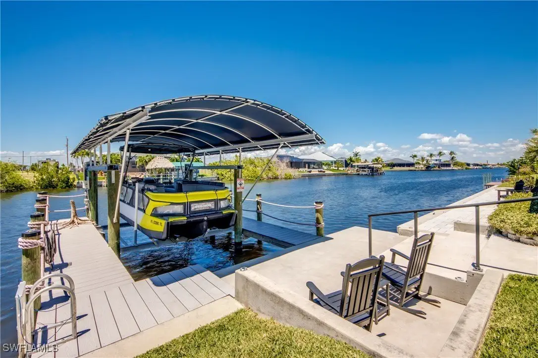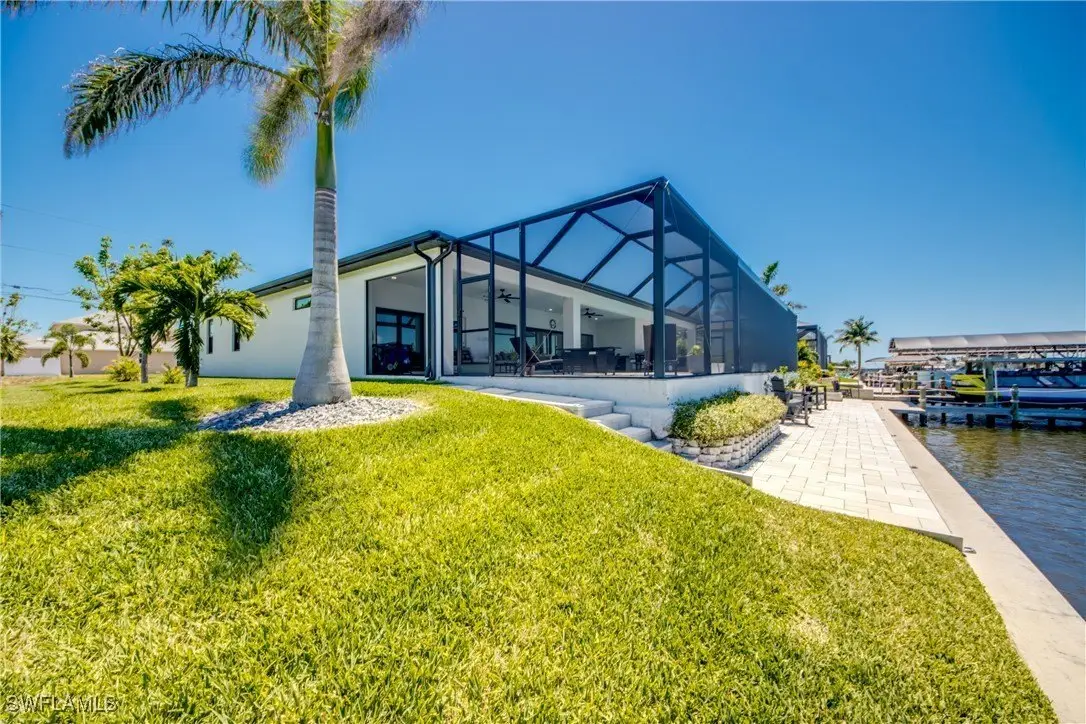 Stunning, 3-lot site custom pool home with over 2600 sq ft and exceptional water views in NW Cape Coral! Built in 2022, this 5 bed/2.5 bath, 1000 sq ft 3-car garage home was built to the highest standards, exceeding Miami/Dade County regulatory codes. LOMR-F has been applied for and will be approved within 60 days. The property will then be labeled "NOT in a Flood Zone". The home is further secured with hurricane impact glass doors and windows and prewired for a whole-house generator. From extra tie trusses to the concrete-filled pool cage uprights reinforced with 5/8 " rebar, the builder spared no expense in safeguarding your future investment! Custom designed from top to bottom and with gorgeous wall to wall windows and sliders, this home offers the very best in luxury waterfront living. From the open-concept chef's kitchen, spacious great room and spa-like primary bath to the backyard oasis, there's something for everyone. Gourmet kitchen features include: a whole home R/O system, an expansive full slab granite island with high top breakfast bar, a black composite double sink and designer backsplash, a convenient pot filler and magnetic knife holder, soft shut cabinetry with wide, pot-holding drawers and a corner Lazy Susan. Additionally, the home uses cable fiber and has a whole house integrated WIFI system and is even wired for network drops. Directly off the kitchen is a delightful butler's pantry and coffee bar with a separate walk-in pantry for food storage. The laundry extends into a multi-use area with a W/D, a 2nd refrigerator, a half bath and sink and a laundry folding and storage station. The primary bedroom is open and airy with lanai access and an ensuite bath that boasts a double vanity and makeup table, a large walk-in closet and a free-standing soaking tub and oversized granite surround shower. The secondary bedroom also enjoys lanai access, a walk-in closet and an ensuite bath that has a pool entrance as well. There are 3 more ample sized guestrooms with one located at the front of the house - perfect for a home office or den. Outdoors is a true boater's paradise! Enjoy the breathtaking, extra-wide and intersecting canal views from the pristine deck, the Captain's Walk and boat dock along with its new canopy cover and 10,000 lb lift. Or enjoy lounging on the expansive lanai and covered patio or taking a dip in the sparkling, heated 12x31 pool with its sun shelf entry, bubblers and swim up granite barstools. Surrounded by lush, mature landscaping in a private and quiet setting. Electrical has been added for an outdoor kitchen and plumbed for an outdoor shower as well as wired for outside security cameras. Endless possibilities to make this home your own. Schedule a private showing today!