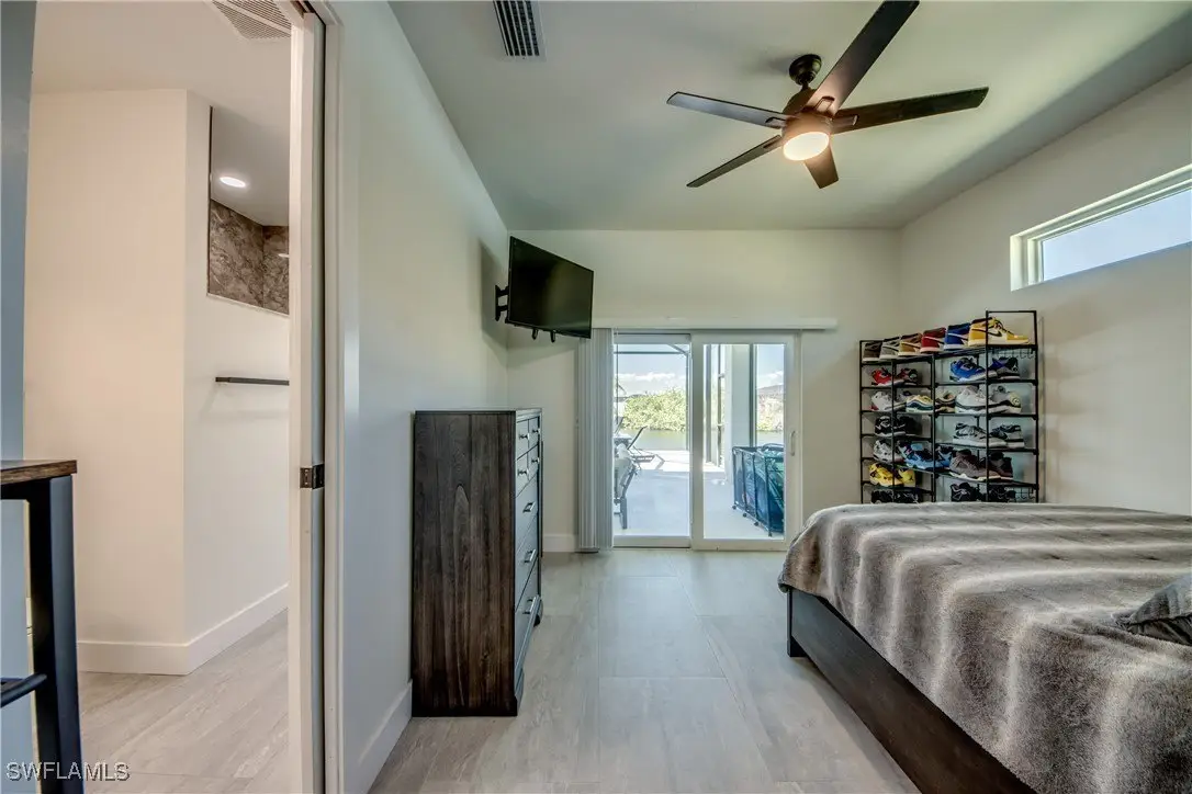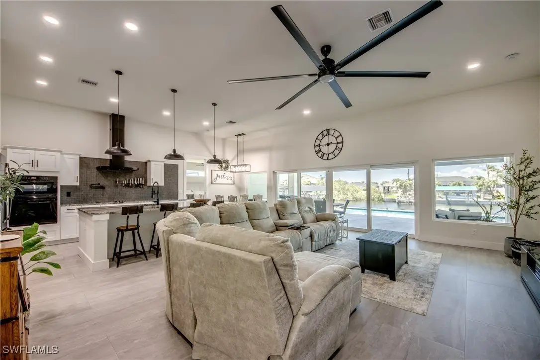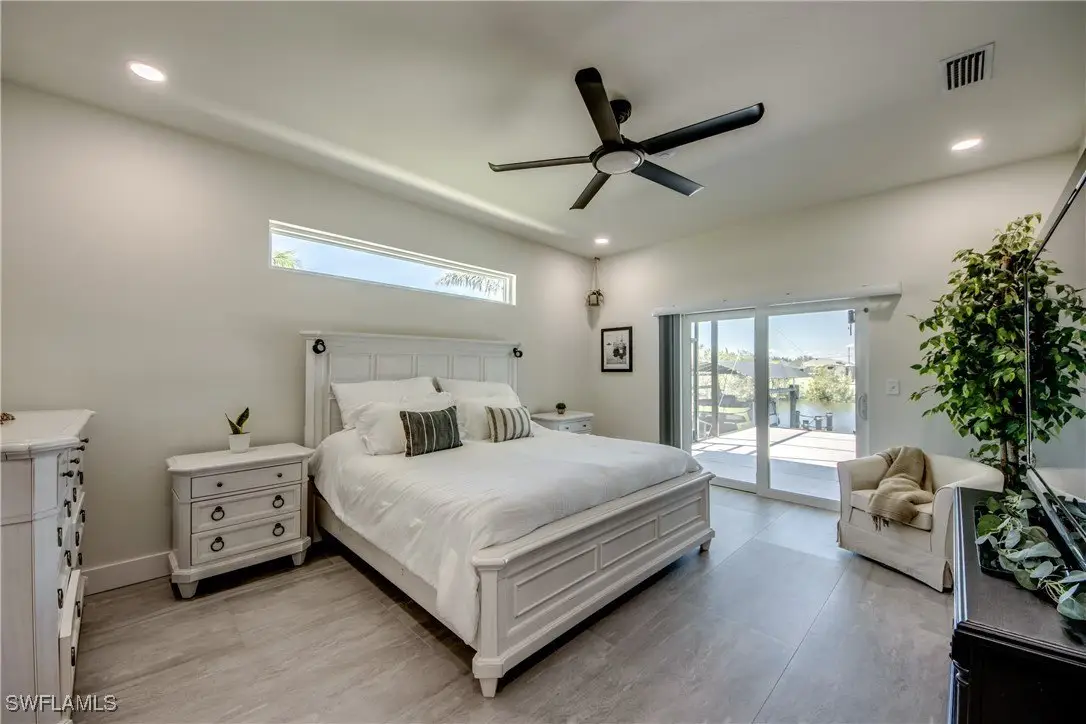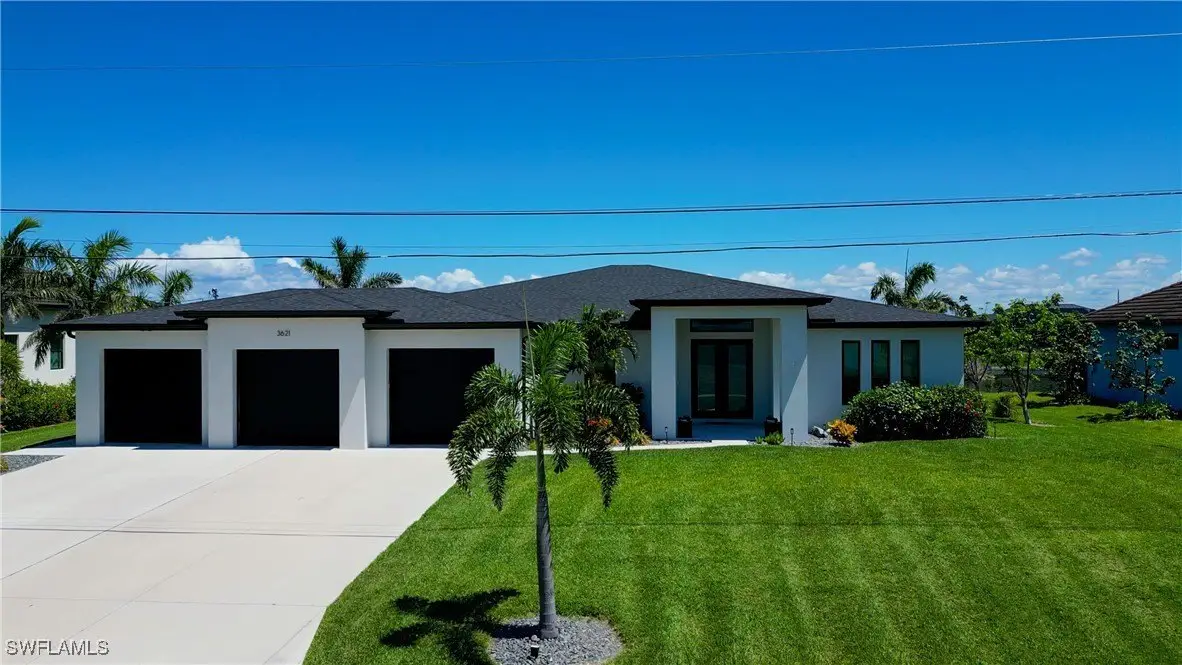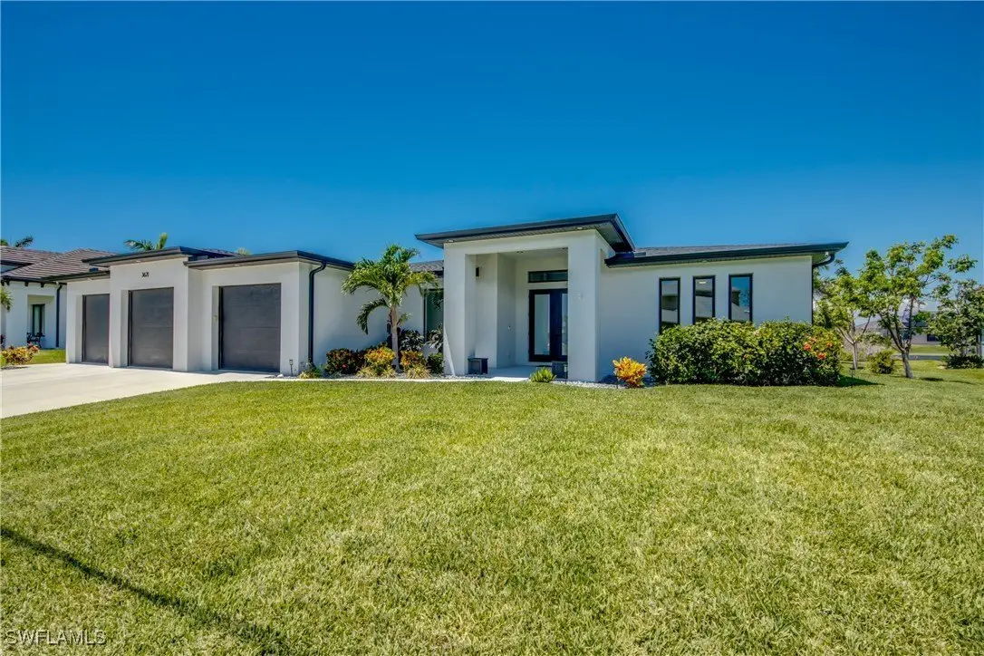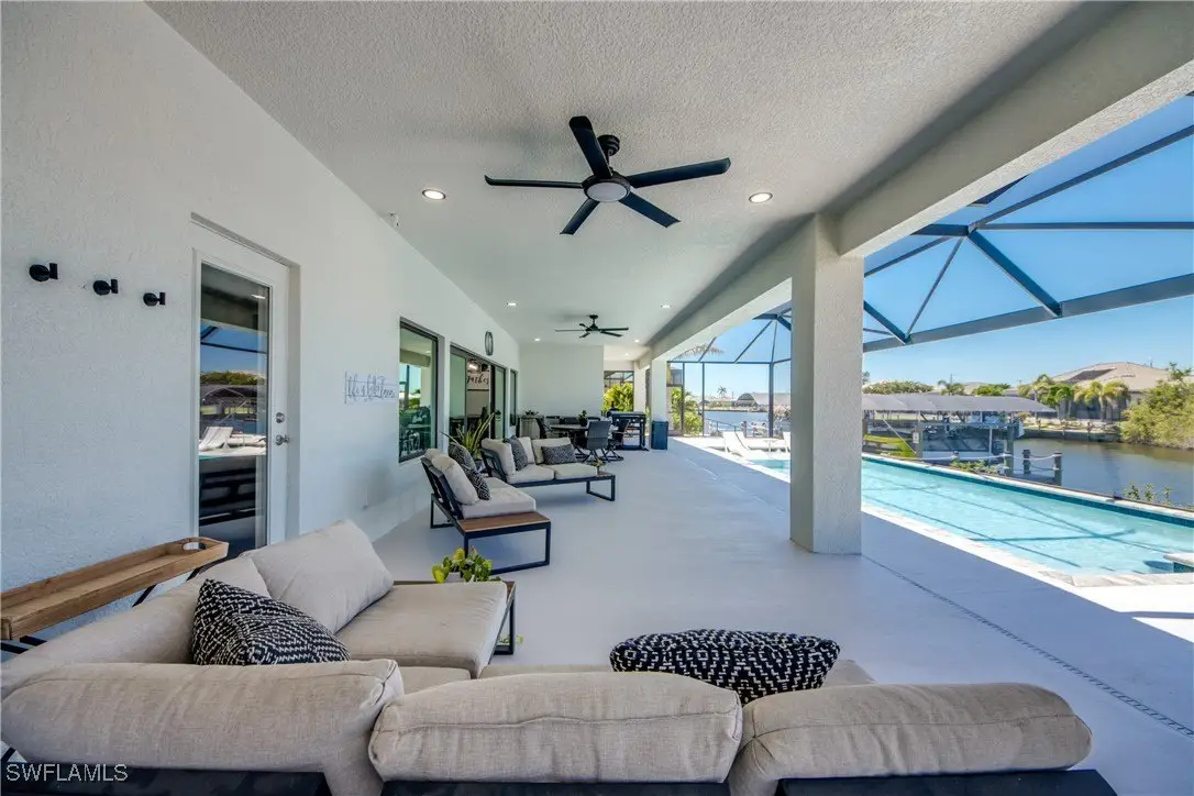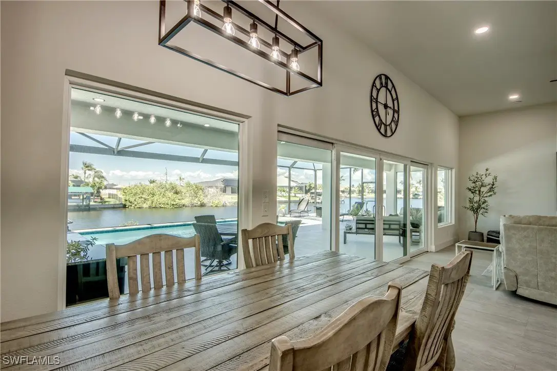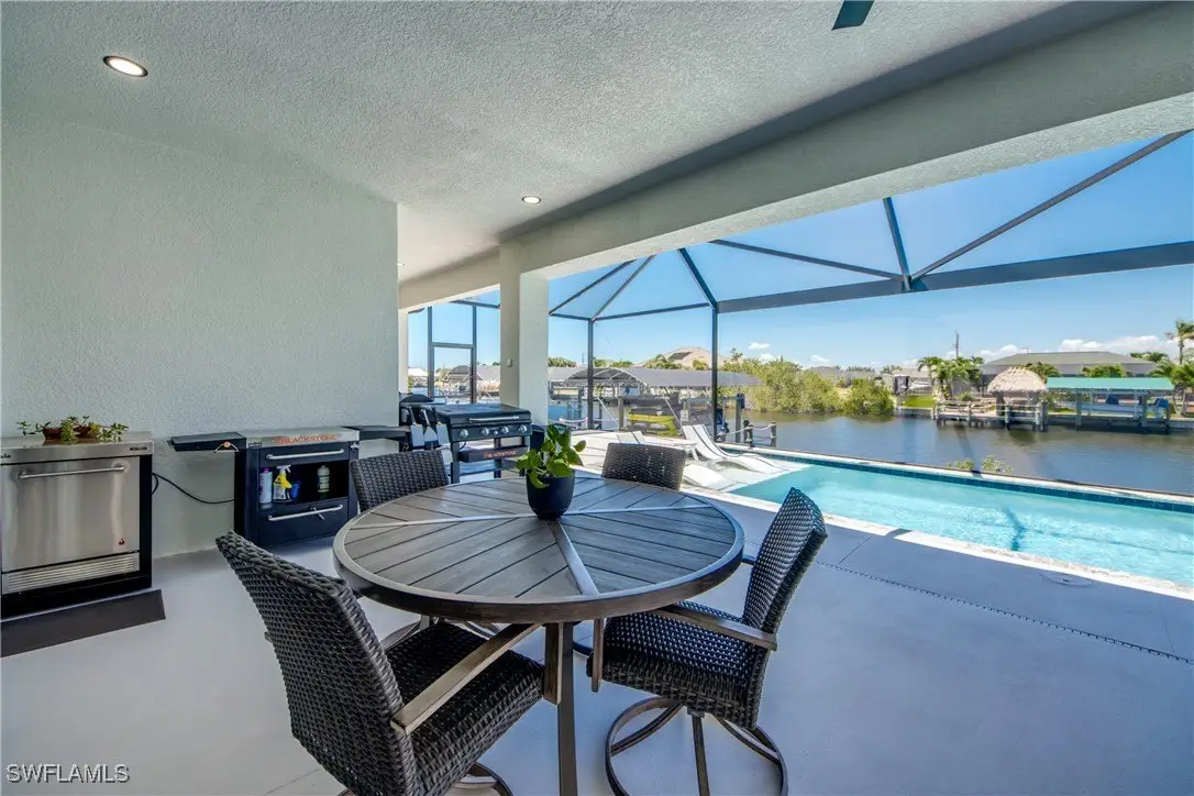 Stunning, 3-lot site custom pool home with over 2600 sq ft and exceptional water views in NW Cape Coral! Built in 2022, this 5 bed/2.5 bath, 1000 sq ft 3-car garage home was built to the highest standards, exceeding Miami/Dade County regulatory codes. LOMR-F has been applied for and will be approved within 60 days. The property will then be labeled "NOT in a Flood Zone". The home is further secured with hurricane impact glass doors and windows and prewired for a whole-house generator. From extra tie trusses to the concrete-filled pool cage uprights reinforced with 5/8 " rebar, the builder spared no expense in safeguarding your future investment! Custom designed from top to bottom and with gorgeous wall to wall windows and sliders, this home offers the very best in luxury waterfront living. From the open-concept chef's kitchen, spacious great room and spa-like primary bath to the backyard oasis, there's something for everyone. Gourmet kitchen features include: a whole home R/O system, an expansive full slab granite island with high top breakfast bar, a black composite double sink and designer backsplash, a convenient pot filler and magnetic knife holder, soft shut cabinetry with wide, pot-holding drawers and a corner Lazy Susan. Additionally, the home uses cable fiber and has a whole house integrated WIFI system and is even wired for network drops. Directly off the kitchen is a delightful butler's pantry and coffee bar with a separate walk-in pantry for food storage. The laundry extends into a multi-use area with a W/D, a 2nd refrigerator, a half bath and sink and a laundry folding and storage station. The primary bedroom is open and airy with lanai access and an ensuite bath that boasts a double vanity and makeup table, a large walk-in closet and a free-standing soaking tub and oversized granite surround shower. The secondary bedroom also enjoys lanai access, a walk-in closet and an ensuite bath that has a pool entrance as well. There are 3 more ample sized guestrooms with one located at the front of the house - perfect for a home office or den. Outdoors is a true boater's paradise! Enjoy the breathtaking, extra-wide and intersecting canal views from the pristine deck, the Captain's Walk and boat dock along with its new canopy cover and 10,000 lb lift. Or enjoy lounging on the expansive lanai and covered patio or taking a dip in the sparkling, heated 12x31 pool with its sun shelf entry, bubblers and swim up granite barstools. Surrounded by lush, mature landscaping in a private and quiet setting. Electrical has been added for an outdoor kitchen and plumbed for an outdoor shower as well as wired for outside security cameras. Endless possibilities to make this home your own. Schedule a private showing today!