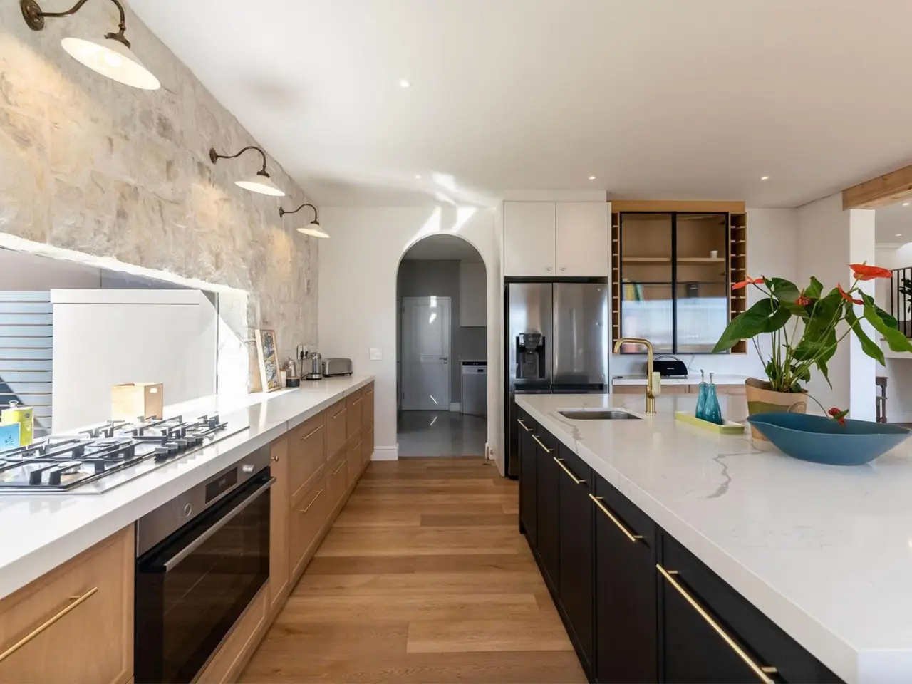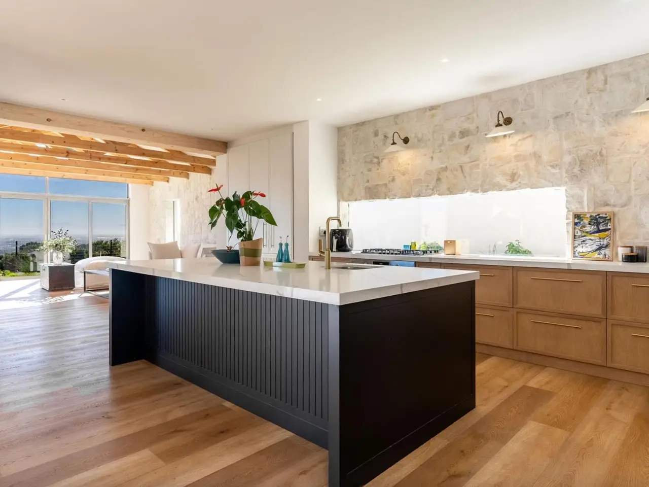 Exquisite stone cladding in kitchen and lounge