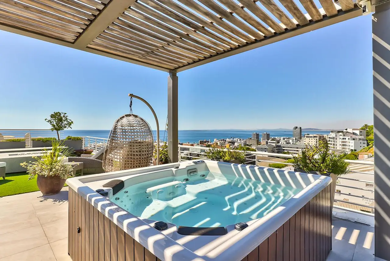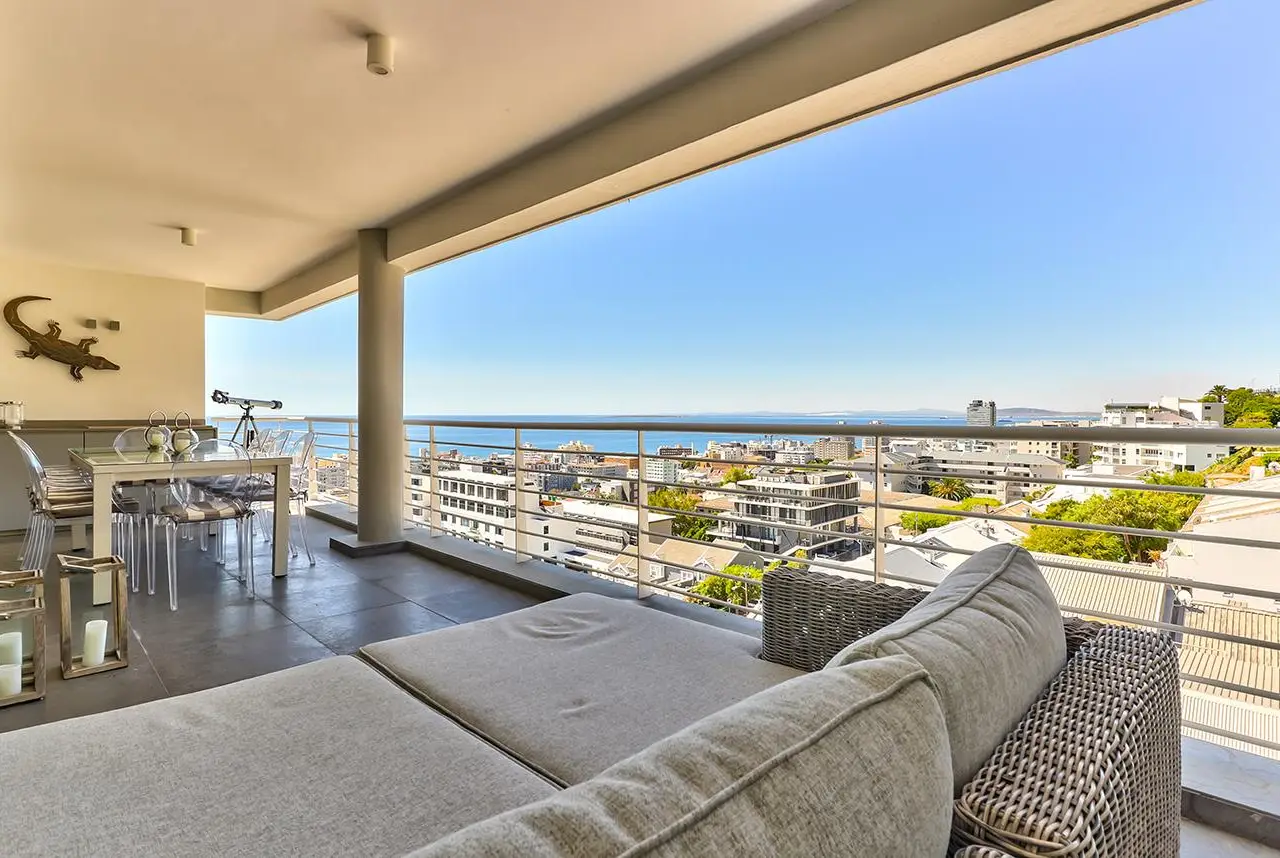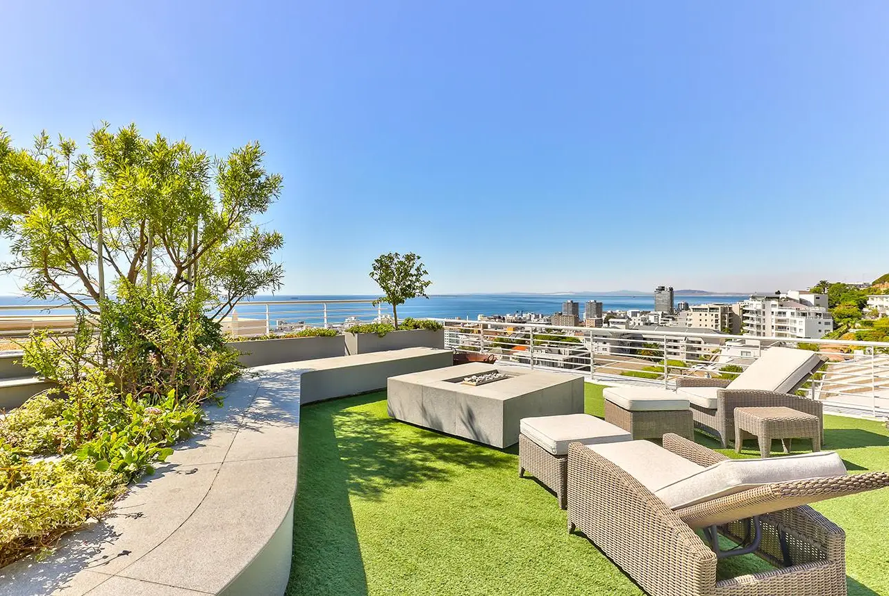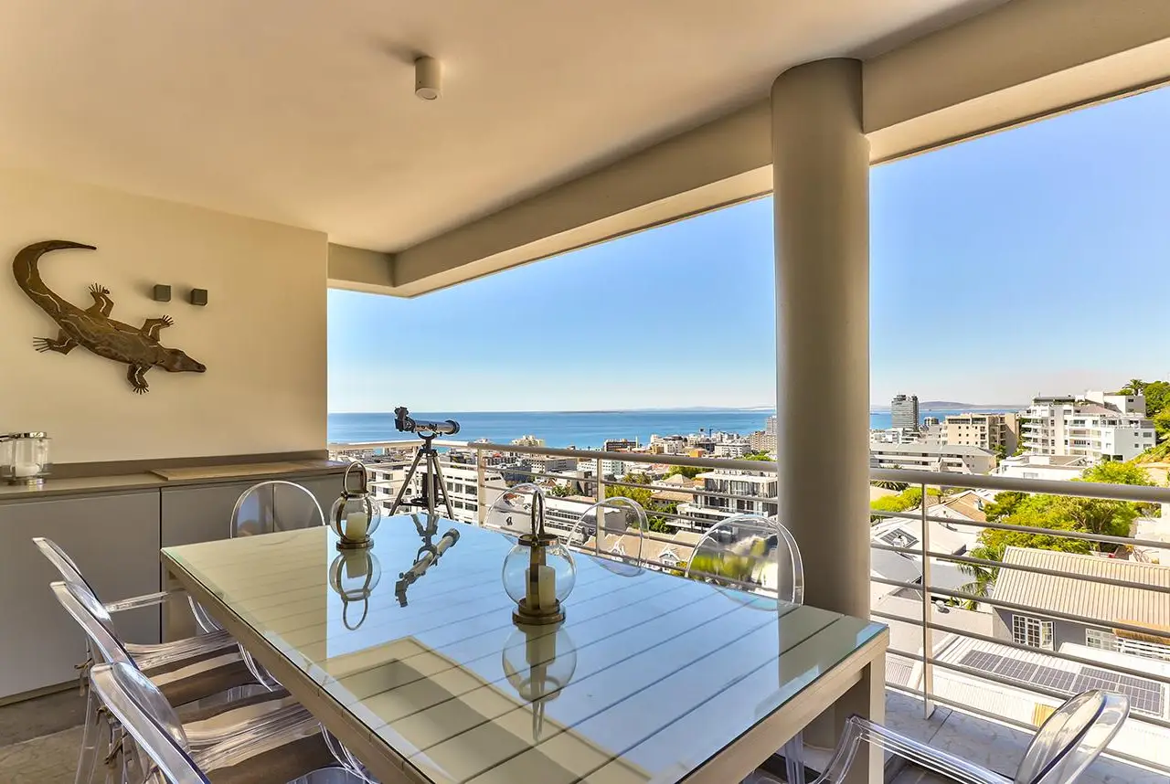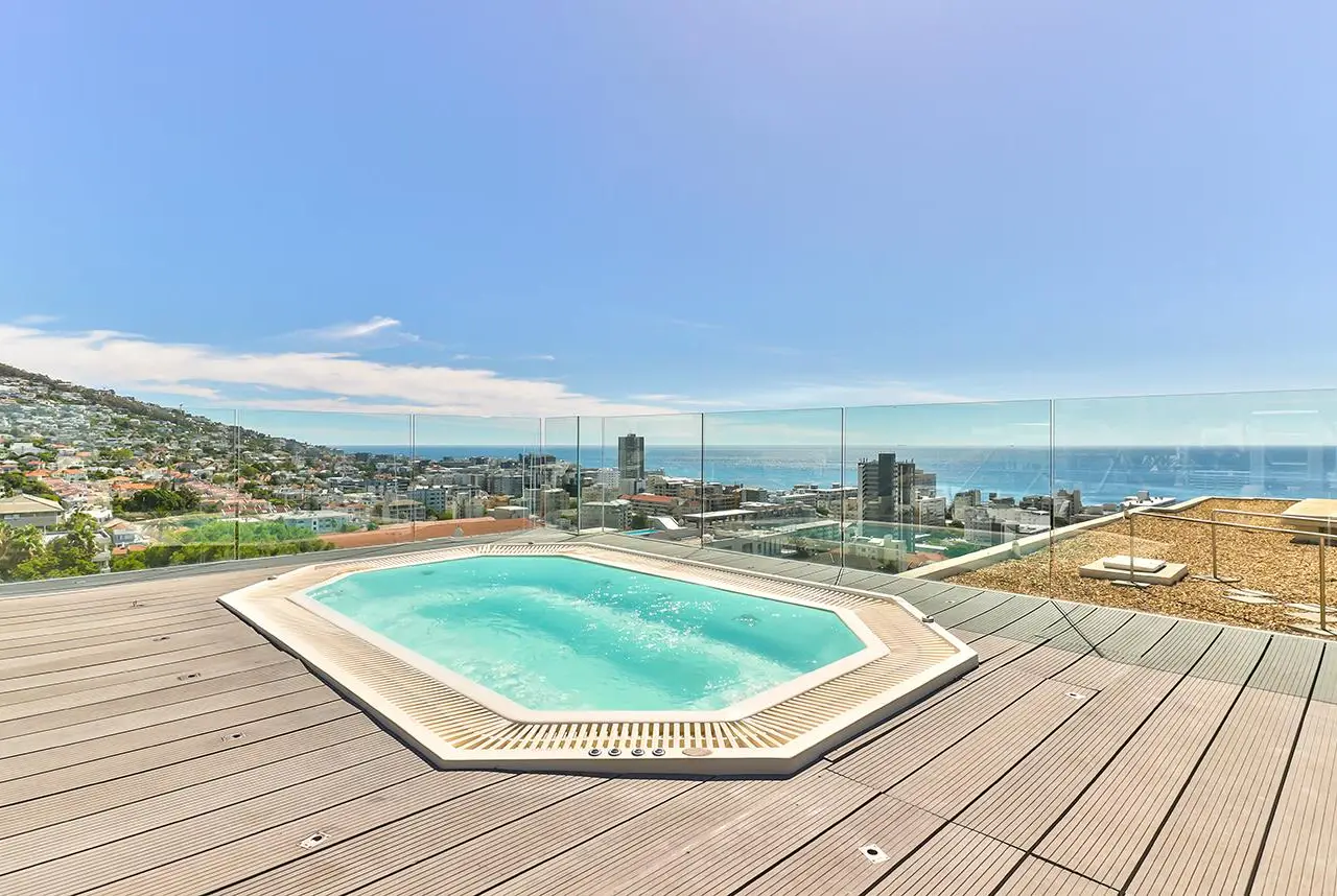 Luxury Penthouse offering 171m2 rooftop terrace with pool, jacuzzi and 360 degree ocean-áand mountain views Exclusive Mandate Located at the foot of Signal Hill, this elegant and light-flooded two-bedroomed penthouse apartment on the top floor has the most amazing views of the ocean, Lions Head and Signal Hill. The open-plan lounge, dining and kitchen area with caesarstone countertops and SMEG gas hob, oak wood flooring, fireplace and ceiling-to-floor stacking doors seamlessly flow onto a spacious covered veranda with a built in braai, taking in the spectacular views of the Atlantic Ocean. The absolute wow factor of this apartment is the 360 degree view of the ocean and mountains from your upstairs 171m2 rooftop terrace. Sit in the heated pool or Jacuzzi sipping on an Aperol's-áand enjoy the amazing views and spectacular sunsets over the sea. With a built in gas braai this is the perfect place for entertaining your guests or unwinding after a long day. The beautifully appointed en-suite main bedroom with a fireplace has sweeping ocean views as well, with direct access to the veranda. The open plan bathroom comes with a free standing bath, enormous walk in shower and a separate toilet. The second en-suite bedroom overlooks Lions Head and the ocean. Guest loo, small office plus brand new inverter. Option to purchase furniture. No AirBnB. Regret no pets. Two undercover parking spaces plus a storeroom. This unique apartment will make you feel like you are on a permanent holiday.