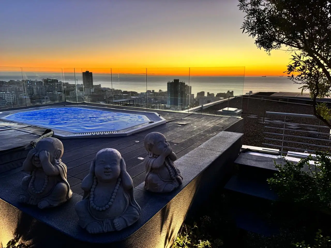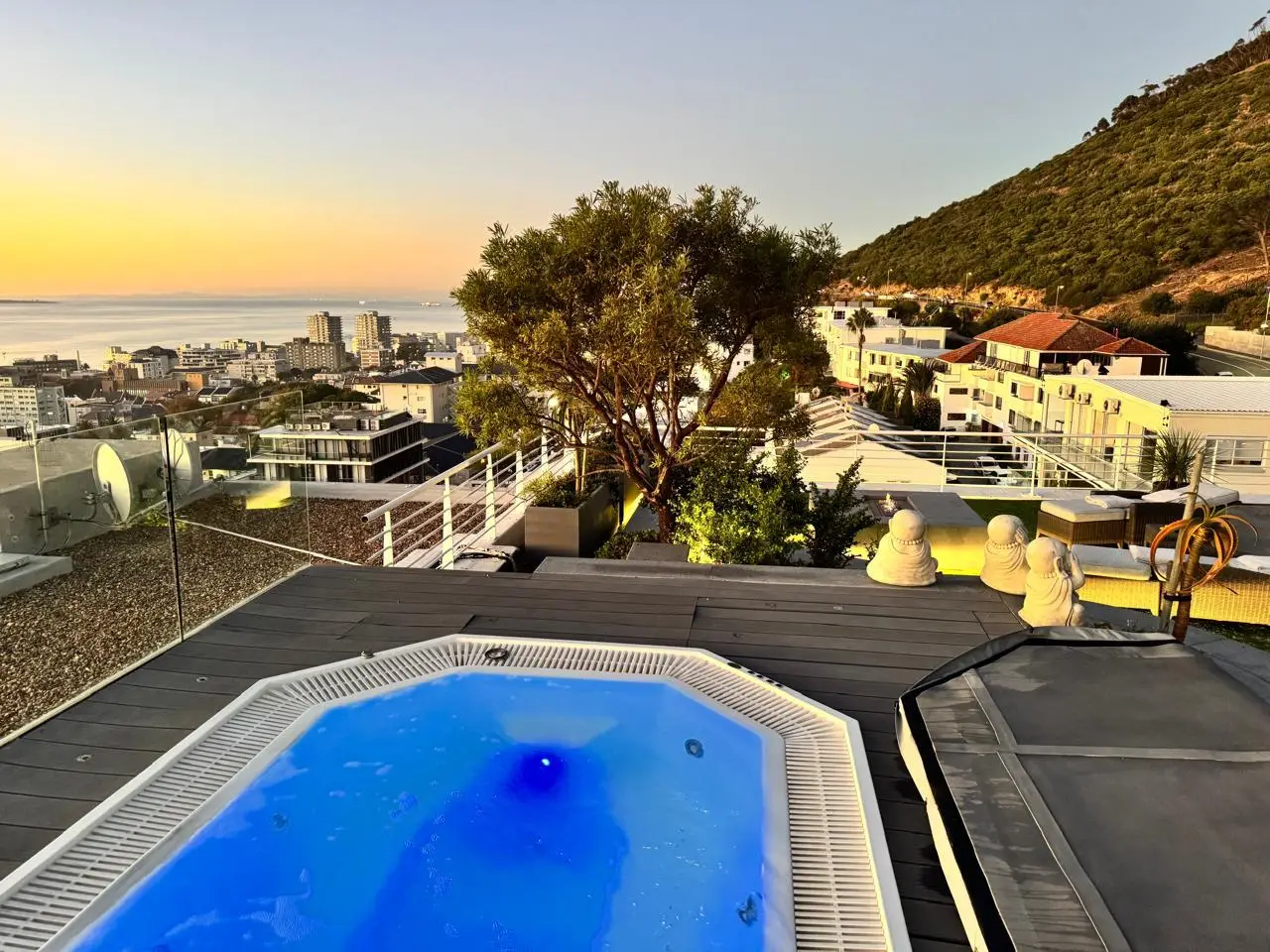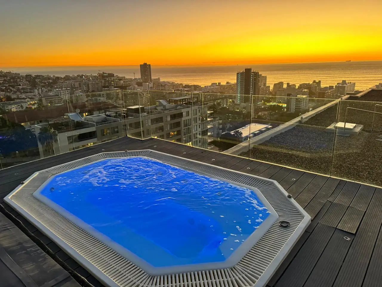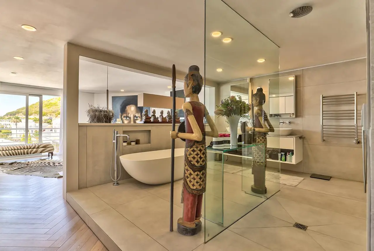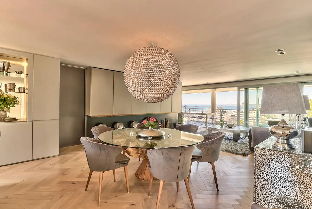 Luxury Penthouse offering 171m2 rooftop terrace with pool, jacuzzi and 360 degree ocean-áand mountain views Exclusive Mandate Located at the foot of Signal Hill, this elegant and light-flooded two-bedroomed penthouse apartment on the top floor has the most amazing views of the ocean, Lions Head and Signal Hill. The open-plan lounge, dining and kitchen area with caesarstone countertops and SMEG gas hob, oak wood flooring, fireplace and ceiling-to-floor stacking doors seamlessly flow onto a spacious covered veranda with a built in braai, taking in the spectacular views of the Atlantic Ocean. The absolute wow factor of this apartment is the 360 degree view of the ocean and mountains from your upstairs 171m2 rooftop terrace. Sit in the heated pool or Jacuzzi sipping on an Aperol's-áand enjoy the amazing views and spectacular sunsets over the sea. With a built in gas braai this is the perfect place for entertaining your guests or unwinding after a long day. The beautifully appointed en-suite main bedroom with a fireplace has sweeping ocean views as well, with direct access to the veranda. The open plan bathroom comes with a free standing bath, enormous walk in shower and a separate toilet. The second en-suite bedroom overlooks Lions Head and the ocean. Guest loo, small office plus brand new inverter. Option to purchase furniture. No AirBnB. Regret no pets. Two undercover parking spaces plus a storeroom. This unique apartment will make you feel like you are on a permanent holiday.