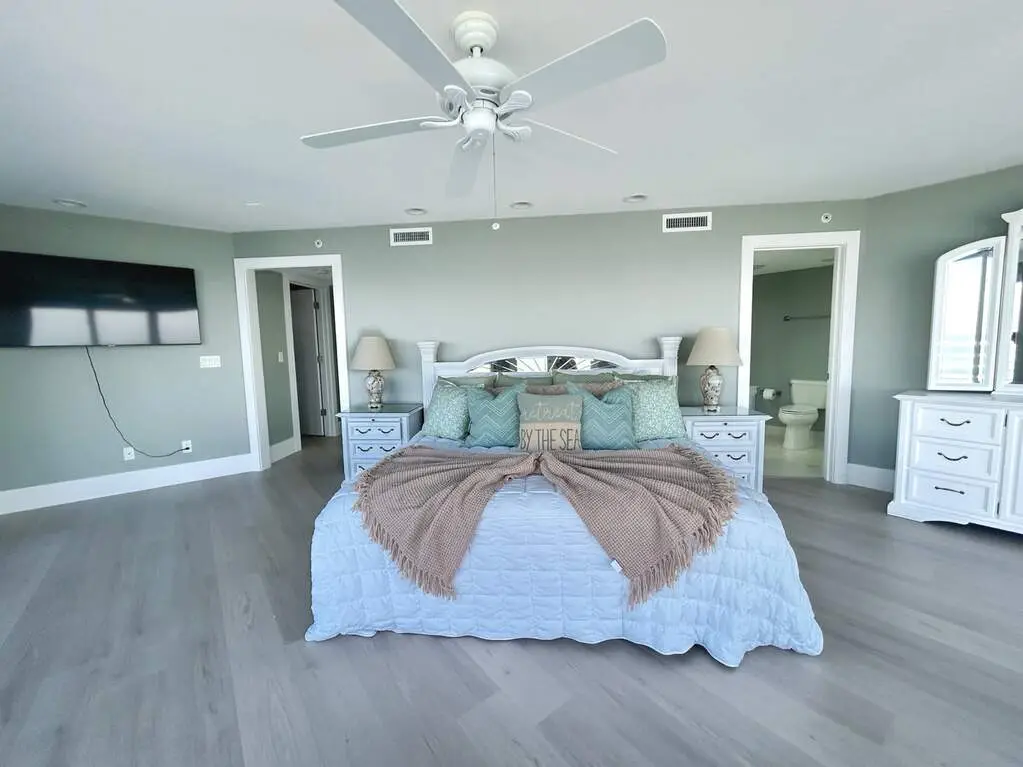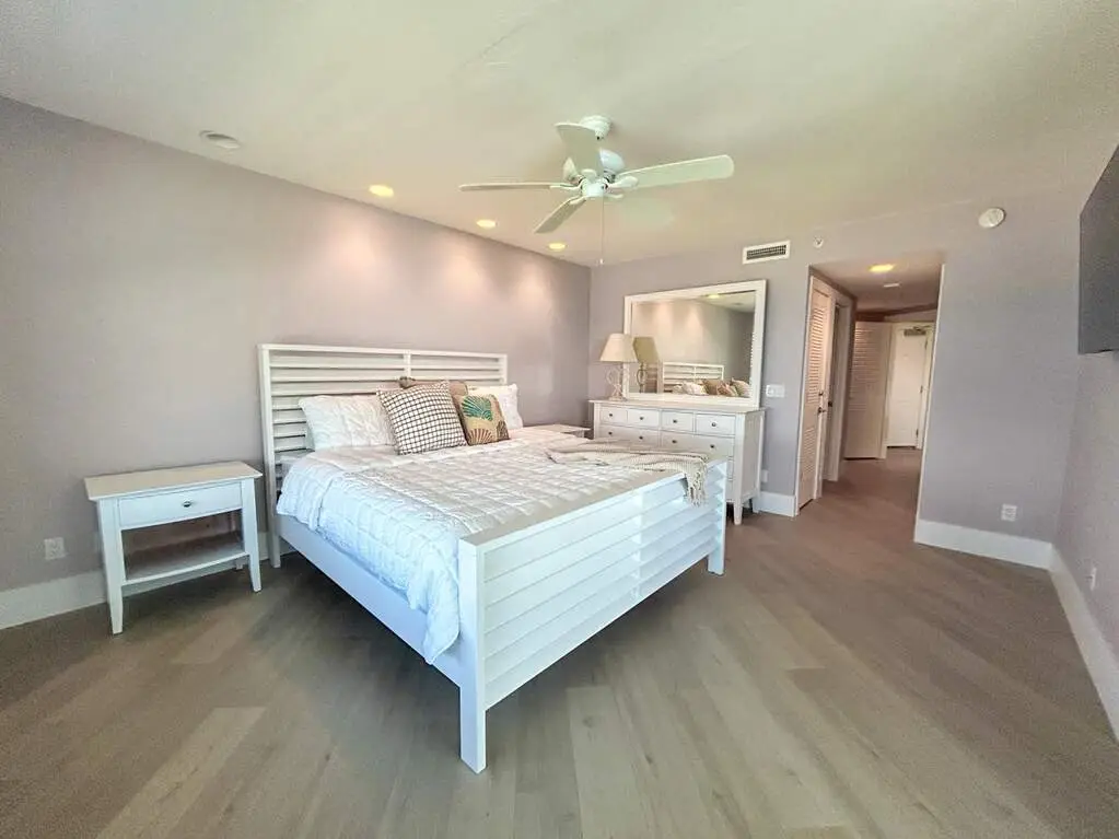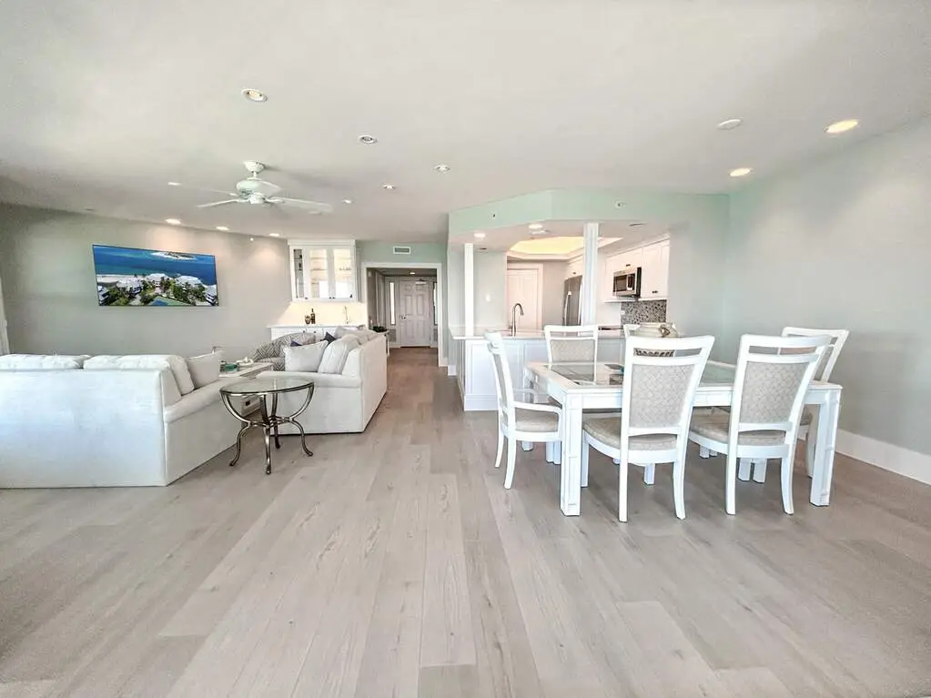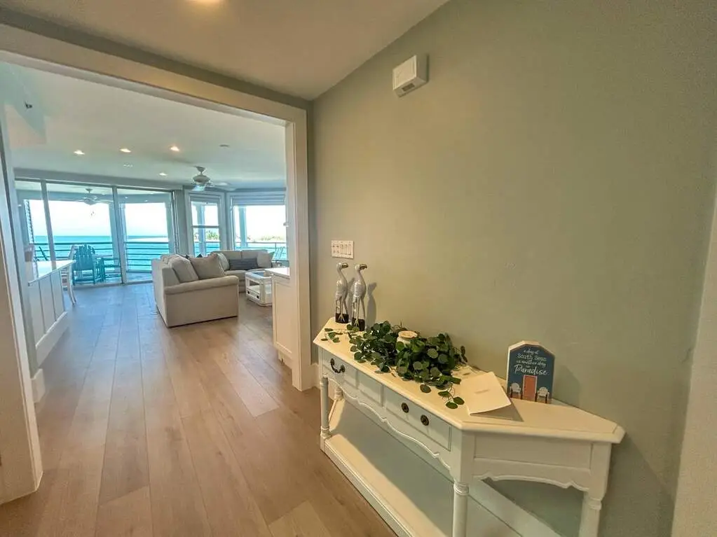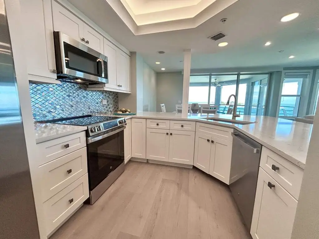 At the northern tip of Captiva, 1618 Lands End Village is situated within the "Eucalyptus" complex commanding extraordinary views across Red Fish Pass where Pine Island Sound meets the Gulf. This three-bedroom multi-level penthouse with elevator access combines spacious design, thoughtful detailing, and an exceptional island setting. The main living area opens through pocketing sliders to a generous screen lanai and balcony overlooking the channel-a perfect vantage point to take in ever-changing skies and the movement of the tides. The kitchen blends practicality and style with quartz counters, a glass decorative backsplash, farmhouse sink, and bar seating that connects naturally to the great room's open plan. Soft coastal finishes and abundant windows create a bright, easy flow that captures the surrounding water views. On this main level, an oversized guest suite features a king bed and private bath, while a second guest suite offers bunk beds ideal for family or visiting friends. The upper-level penthouse suite introduces additional storage and a private retreat complete with a morning kitchen. Its expansive ensuite bath includes a sunken tub beneath skylights, an extended vanity, and a separate walk-in shower-offering a quiet, spa-like escape.