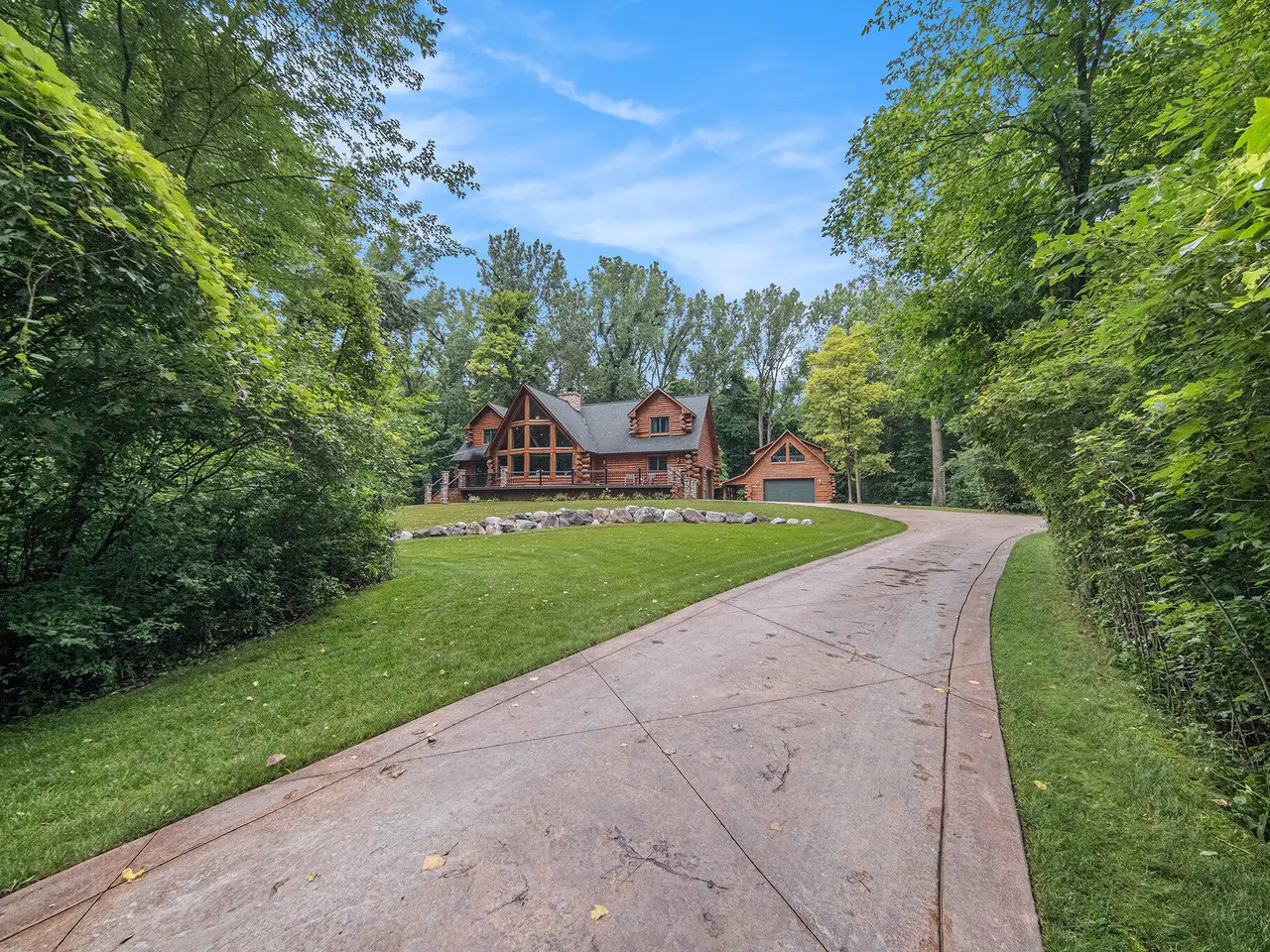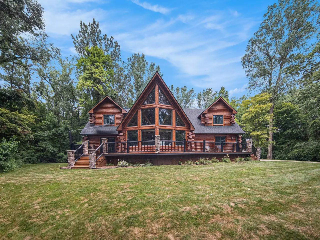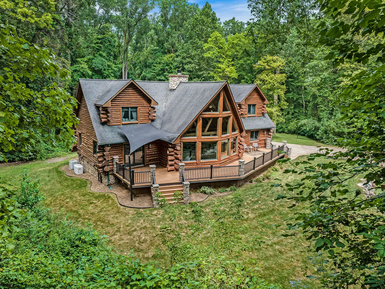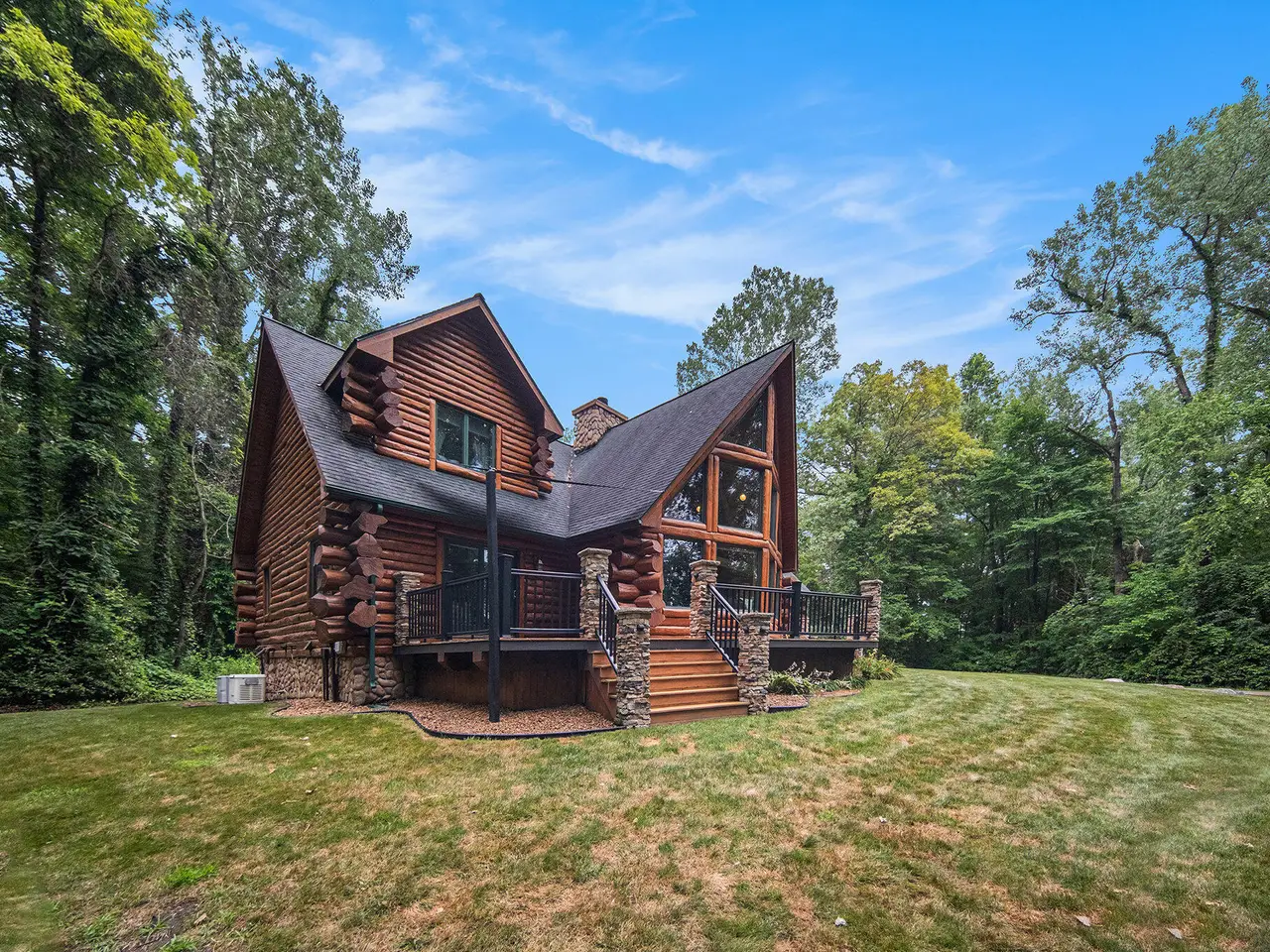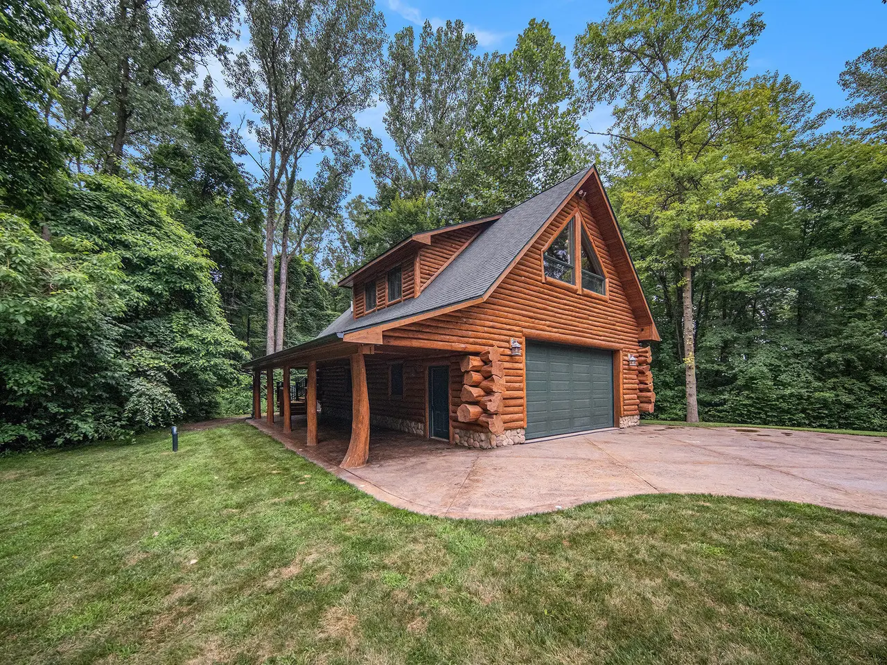Log by Log, inch by inch, this custom-built white cedar home is love at first sight!! Unique in every way, and built with the utmost Care and meticulous Design. Located on a private 2.5 acre sanctuary, with over 3800sqft. of luxury living space. The main level has floor to ceiling Windows to maximize the natural light throughout and scenic view. Exposed wooden beams, a showcase Stone Fireplace and 10'' Oak Plank Flooring. A 1st floor primary Suite w/a Spa Tub, w/i Shower and door wall leading to the wrap-around Porch. Large 2nd floor loft area with 2 addt'l Bedrooms, Office, full Bath and then off to the finished Basement that screams entertainment! A secondary 28by40 Outbuilding built as a mechanics DREAM and an upper Suite to amazing to describe. Best said, this home is a 'WOW'