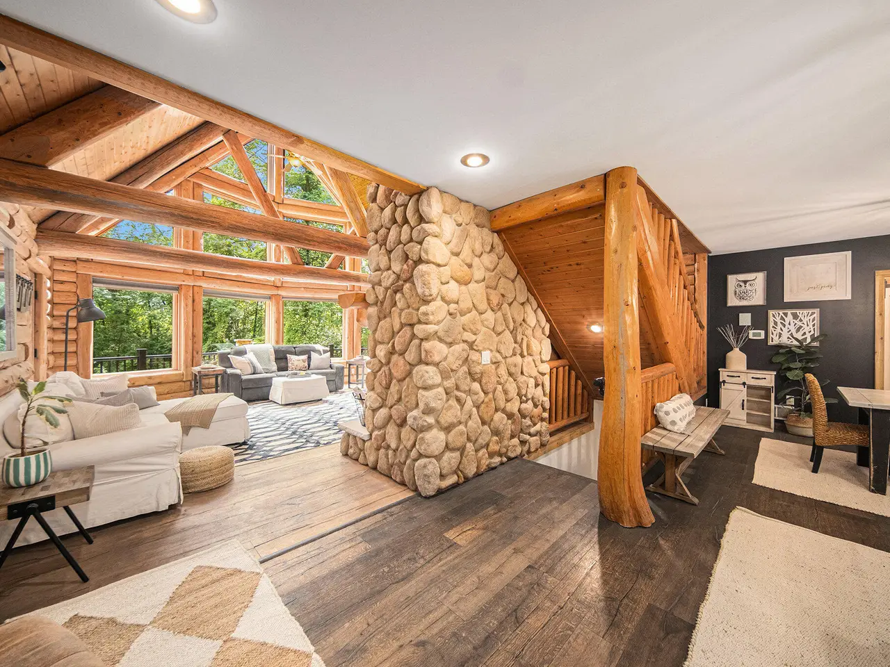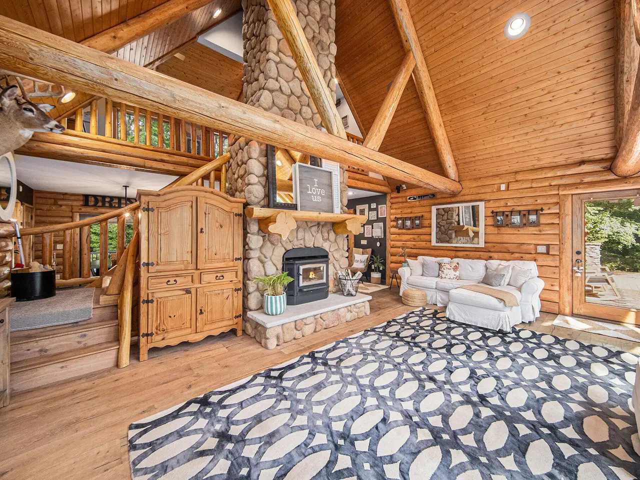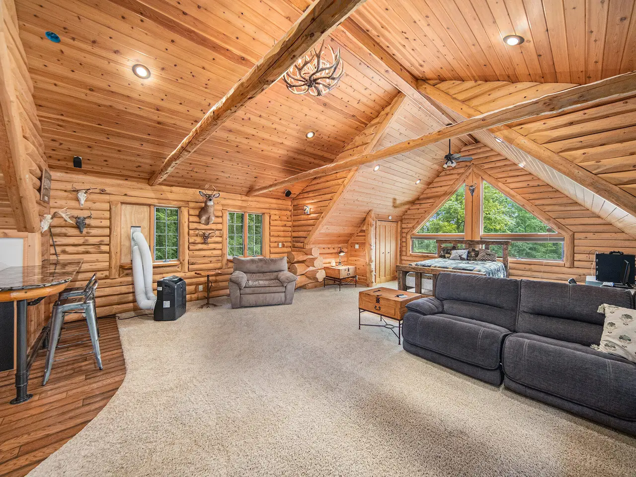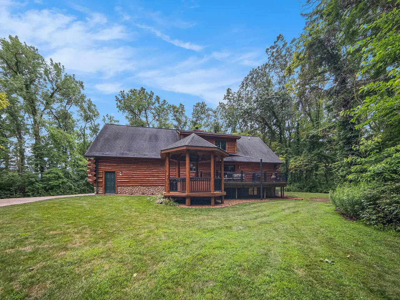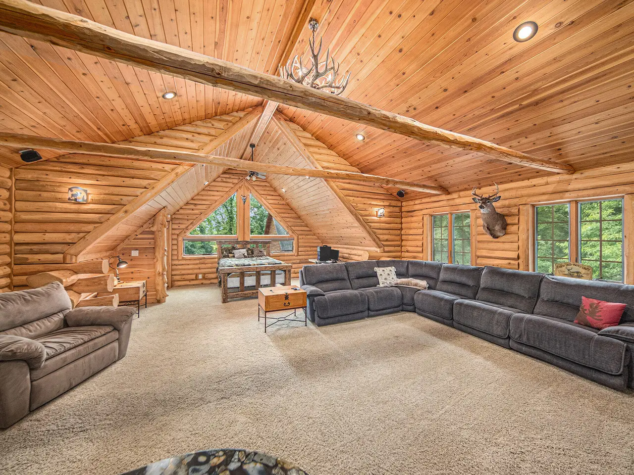 Log by Log, inch by inch, this custom-built white cedar home is love at first sight!! Unique in every way, and built with the utmost Care and meticulous Design. Located on a private 2.5 acre sanctuary, with over 3800sqft. of luxury living space. The main level has floor to ceiling Windows to maximize the natural light throughout and scenic view. Exposed wooden beams, a showcase Stone Fireplace and 10'' Oak Plank Flooring. A 1st floor primary Suite w/a Spa Tub, w/i Shower and door wall leading to the wrap-around Porch. Large 2nd floor loft area with 2 addt'l Bedrooms, Office, full Bath and then off to the finished Basement that screams entertainment! A secondary 28by40 Outbuilding built as a mechanics DREAM and an upper Suite to amazing to describe. Best said, this home is a 'WOW'