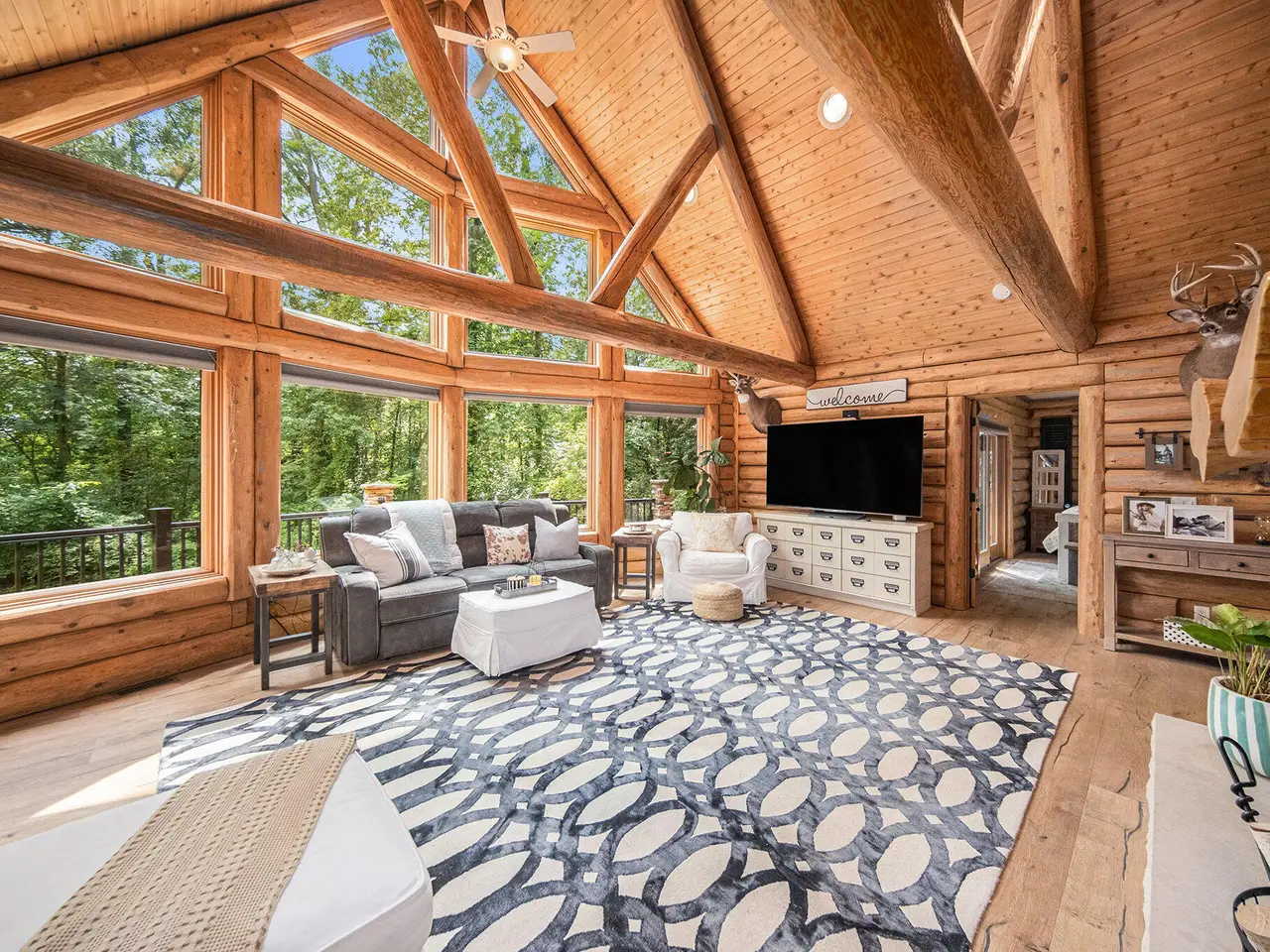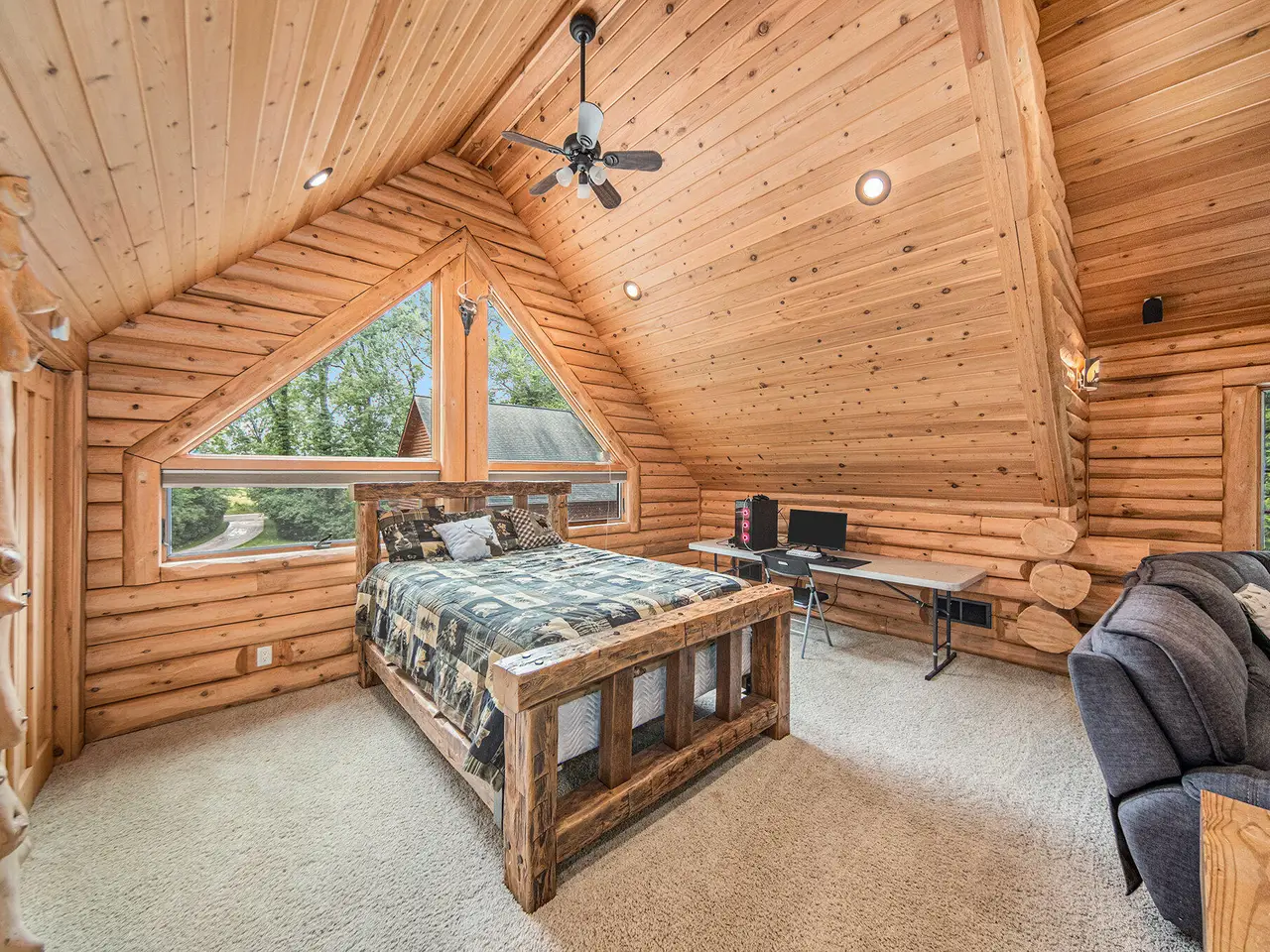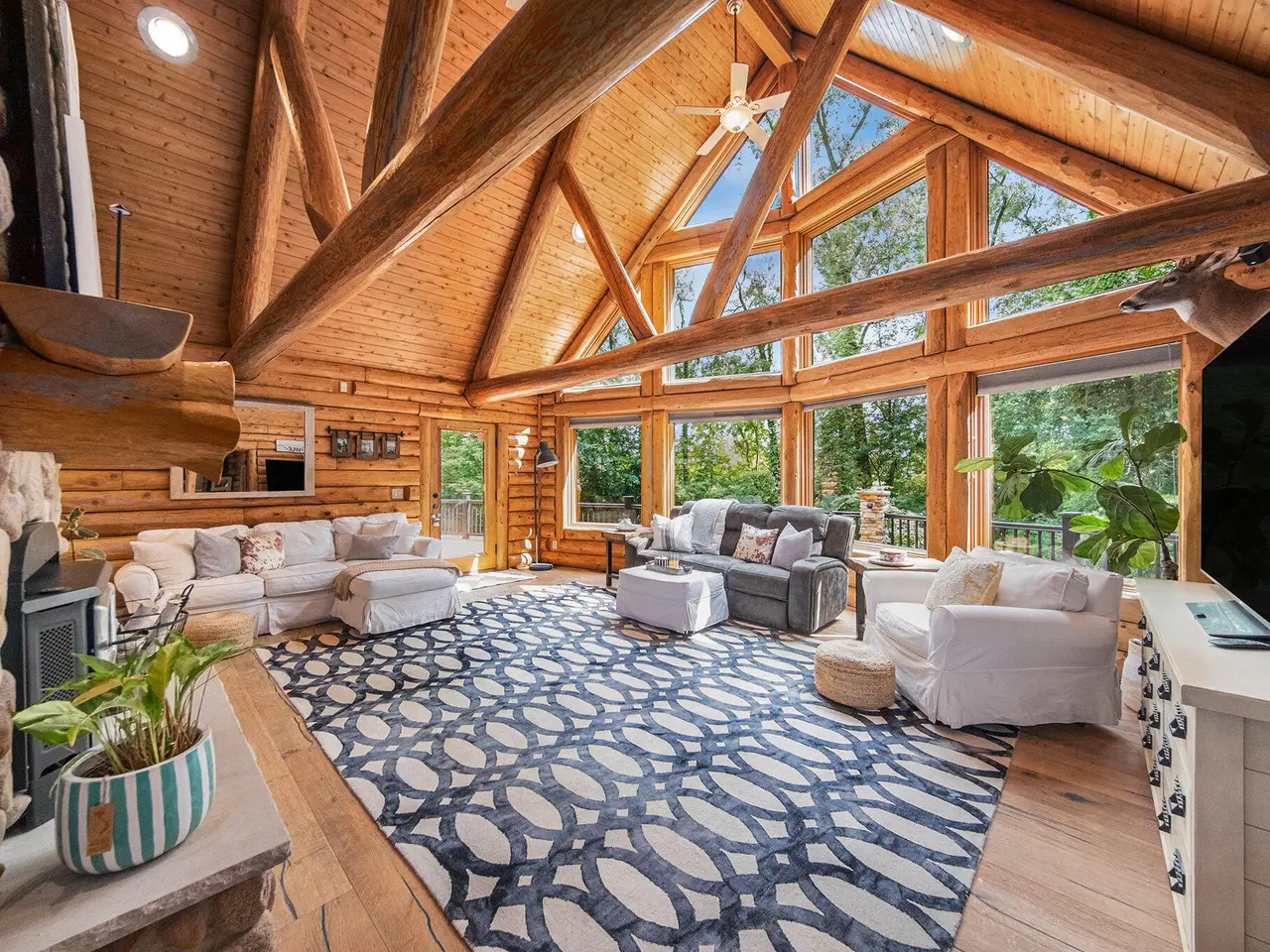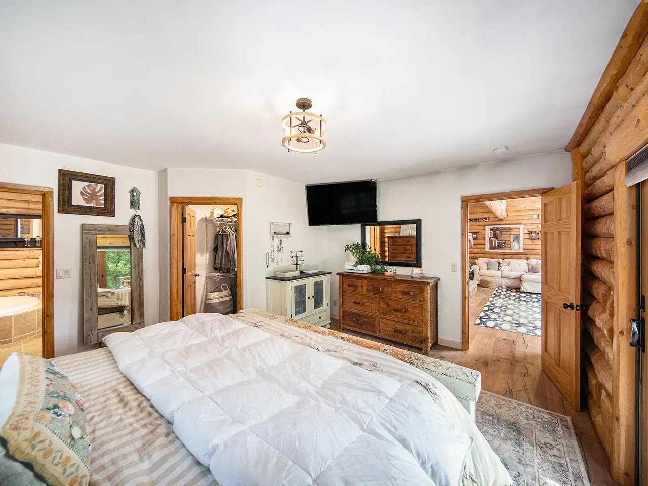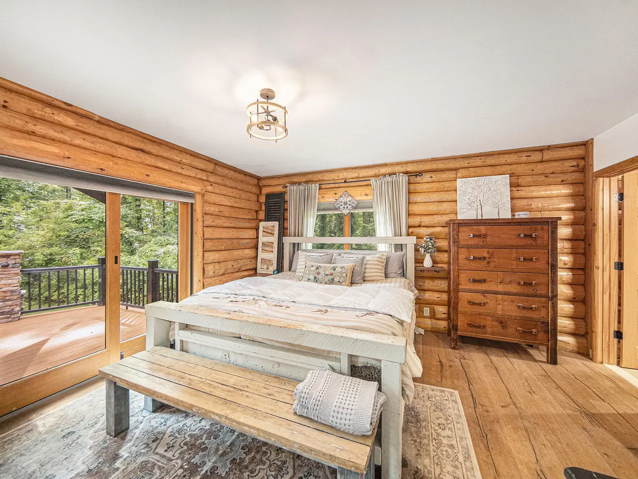 Log by Log, inch by inch, this custom-built white cedar home is love at first sight!! Unique in every way, and built with the utmost Care and meticulous Design. Located on a private 2.5 acre sanctuary, with over 3800sqft. of luxury living space. The main level has floor to ceiling Windows to maximize the natural light throughout and scenic view. Exposed wooden beams, a showcase Stone Fireplace and 10'' Oak Plank Flooring. A 1st floor primary Suite w/a Spa Tub, w/i Shower and door wall leading to the wrap-around Porch. Large 2nd floor loft area with 2 addt'l Bedrooms, Office, full Bath and then off to the finished Basement that screams entertainment! A secondary 28by40 Outbuilding built as a mechanics DREAM and an upper Suite to amazing to describe. Best said, this home is a 'WOW'