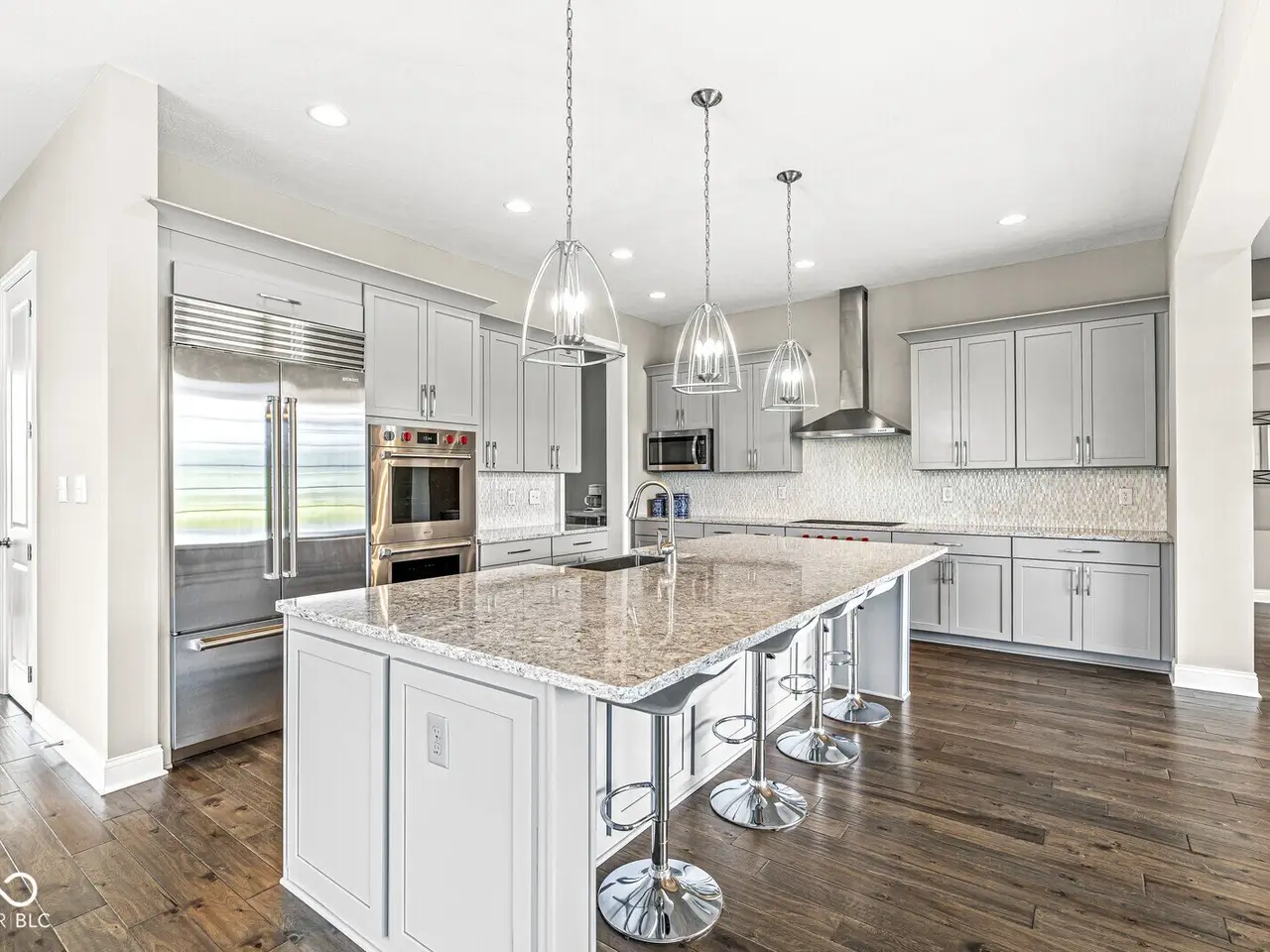 Impressive home with open floor plan & soaring ceilings. Deluxe Gourmet kitchen w/ brand new Wolf appliance including Subzero refrigerator, double ovens & 36 inch gas cooktop, in addition to a large island, walk in pantry, quartz tops, back splash & butler pantry. Expansive great room with cozy gas fireplace. Sunroom has lots of natural light, office on main level with french doors. Luxurious Primary suite has his & her closets, custom tile shower, free standing tub. Additional bedrooms have walk in closets & their own baths. Finished basement with family room/Game area, bar for entertaining, tons of storage, full bath & additional bedroom. Great outdoor space with covered patio & gas fireplace to enjoy your evenings or your morning cup of coffee overlooking the prof landscaped yard w/ irrigation. Home is located on a private cul-de-sac. Exterior was just painted in 2024. Spacious 3 car garage. This home has a lot of upgraded features throughout.