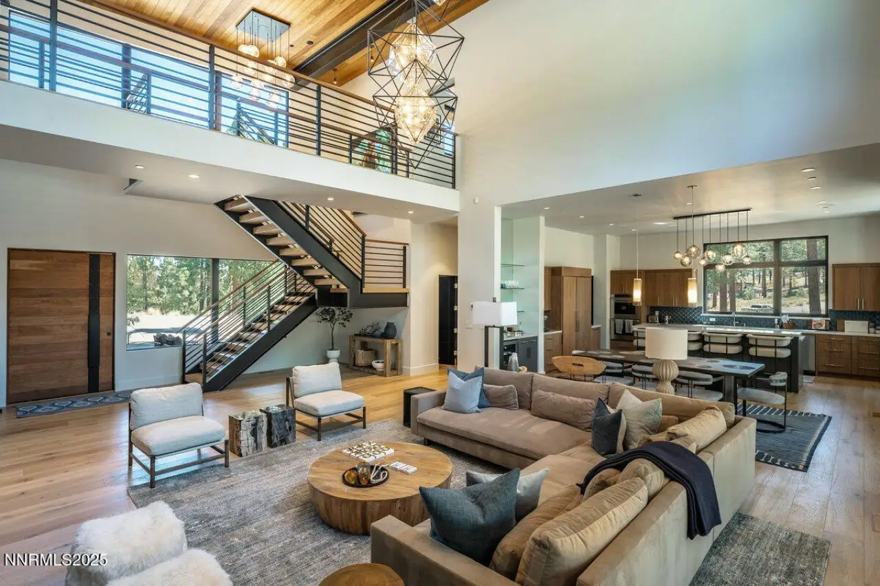 Nestled on 1.15 acres in the exclusive Clear Creek Tahoe community, this mountain modern retreat feels at once expansive and intimate-a home where grand design meets the quiet rhythm of the Sierra. Inside, light pours through towering windows, illuminating warm natural textures and framing views that shift with the seasons. The main house hosts four bedrooms, including a playful bunk room where laughter lingers late into the night, and a primary suite that feels worlds away, yet just steps from the heart of the home. A dedicated office offers a cocoon of focus, while open living spaces invite effortless connection. Climb the stairs, and a surprise awaits-a private upstairs entertainment lounge with a full bar and pool table. Here, evenings stretch long and easy, with the clink of glasses and the soft thud of billiard balls punctuating the mountain quiet. Just beyond, the detached Casita extends a warm welcome, offering a private bedroom, full bath, and its own kitchen-perfect for guests seeking independence without sacrificing closeness. Outdoors, life unfolds in every direction. Three fire pits glow under a starlit sky. A built-in BBQ and outdoor shower stand ready after a day of golf or hiking. The hot tub beckons, steam curling into the alpine air. With its three-car garage, tall ceilings, and architecture that blurs the line between indoors and out, this home is more than a residence-it's an experience. A place where every window is a painting, every gathering feels like a celebration, and every day ends with the mountains as your backdrop. Clear Creek Tahoe is more than a community-it's a lifestyle. Anchored by Nevada's #1-ranked residential golf course, it offers an unparalleled blend of mountain and lake amenities. The private Lake & Ski House provides 180 feet of sandy beach, water sports, and a shuttle service to Heavenly Ski Resort. Summit Camp is a hub for recreation with a pool, water slide, hot tub, tennis, pickleball, and bocce. At the heart of it all, the spacious Clubhouse features a year-round wellness and fitness center, ensuring adventure and relaxation in every season.