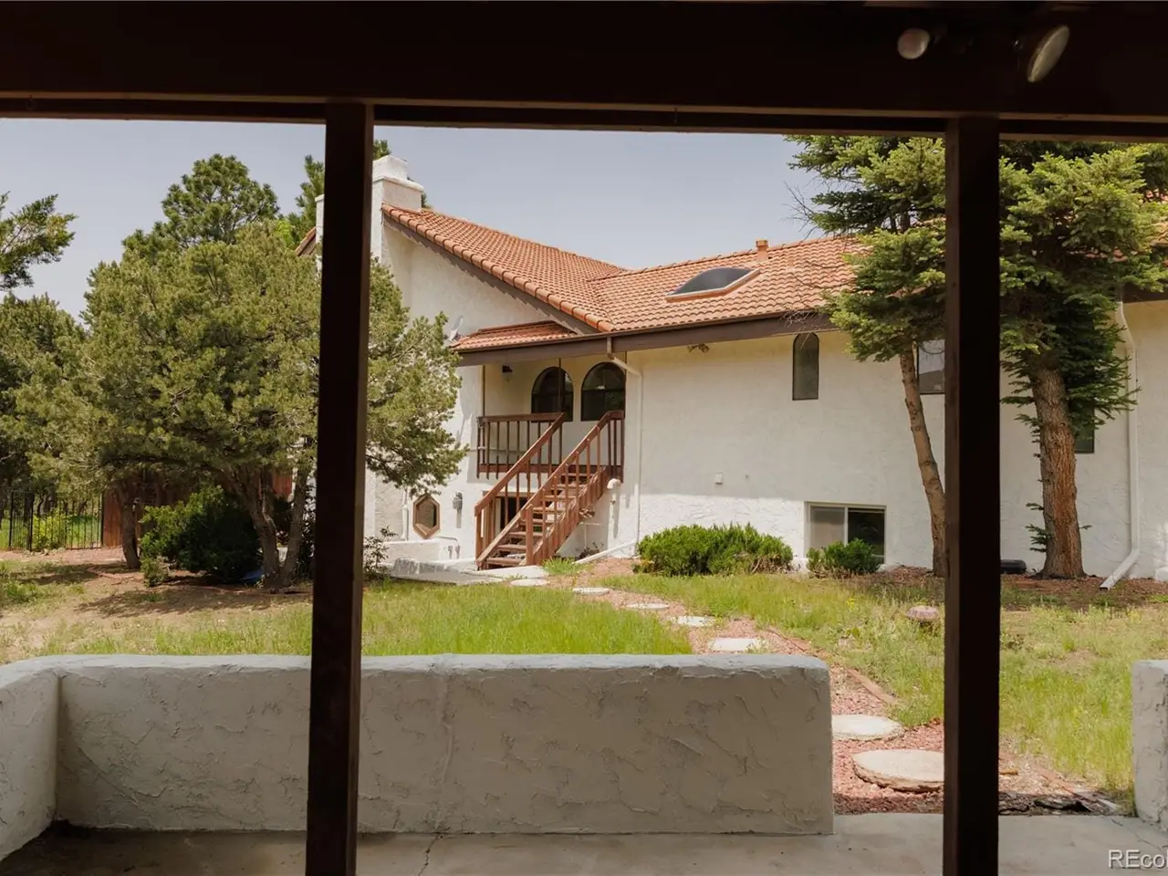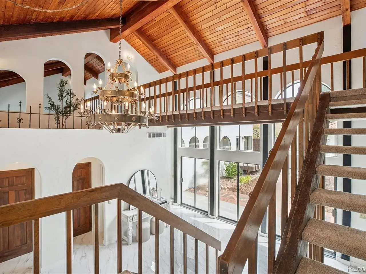 Mediterranean Masterpiece on 5 Acres of Forested Beauty in Castle Rock's Premier Oak Hills Neighborhood. Spanish Revival architecture; stucco walls, Spanish tiles, wood beams, wrought iron, arches & bell tower. Private lot, stable, sports court, sun deck, BBQ pavilion & center courtyard. Gated entry, dramatic circular drive, attached & detached garage or workshop. Grand 2 story foyer; arched windows frame the inner garden, tiled floor, floating staircase & old world chandelier. Thoughtful updates w/ over $250,000 in enhancements are blended w/ classic design features. New Spanish Modern inspired kitchen; arched hall entry, island w/ eating space for 6, luxury LG appliance package, farm sink, quartz counters, brushed gold hardware, walk-in pantry, eating space & deck. Spectacular formal dining room; soaring two-story ceiling & hand-painted Tiffany-style windows. New carpet or new floors throughout. Above; 2 Private upstairs bedrooms each w/ new luxurious en-suite baths w/ marble floors. Access to balcony overlooking the property, surrounding hills & open skies. Great Room; 2 story stacked stone fireplace, stone hearth, wood clad ceiling, arched windows, tiki bar & projection tv wall. Ground floor primary suite; fireplace, coffee bar, sliding doors w/ private patios. Spa like 6 piece en-suite bath; steam shower, soaking tub, heat lamps, large walk-in closet. Finished walkout basement w/ tiled bar, brick clad fireplace. Walkout to the central courtyard or backyard outdoor living room. Al fresco dining overlooking your private resort; covered pavilion w/ wood grill-fireplace for. Set in northern Castle Rock next to Lone Tree. Privacy; 50 mature Ponderosa Pines & native Oak. Step out of the city and into a world of timeless elegance through this enchanting Mediterranean estate. Located only 5 minuets from the Ridgegate Light Rail Station, easy access to I-25, nearby Park Meadows, DTC, Centennial Airport, Skyridge Hospital, Open Space, entertainment and restaurants.