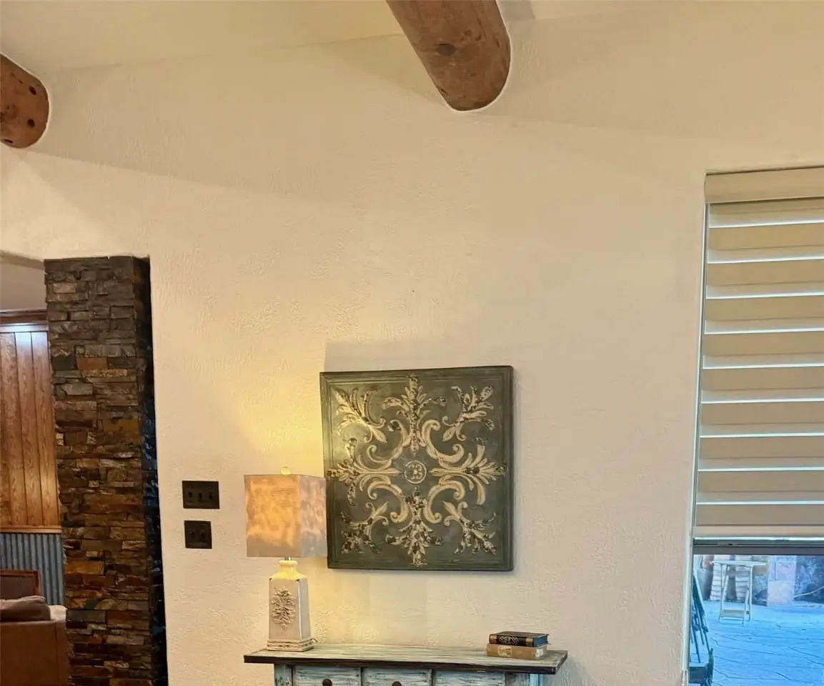 • Stone fireplace with stacked stone shelves