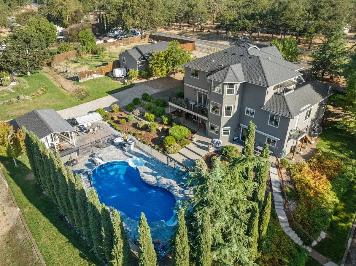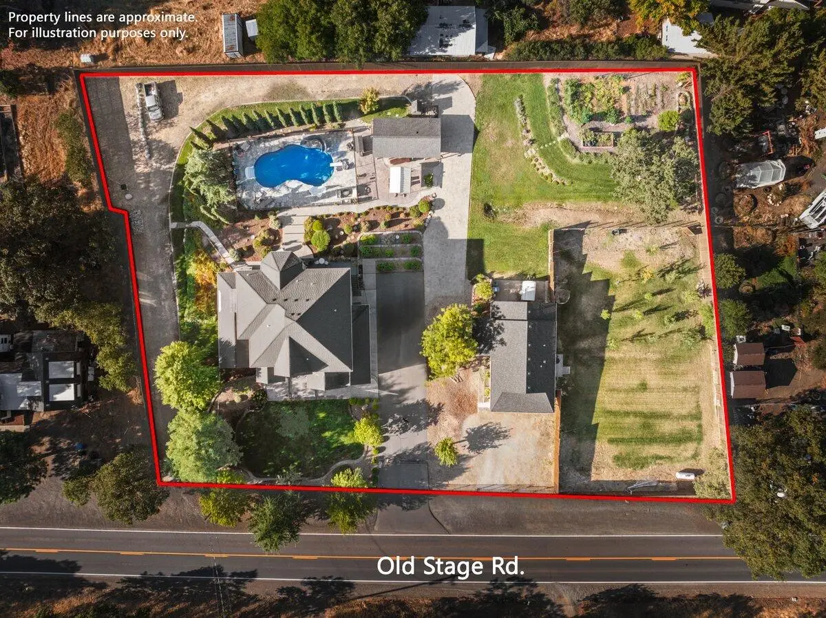 WOW! Instant Equity w/this below appraised value home! Extremely Desirable Old Stage Rd Location & 1-of-a-kind multi-family dream estate! There's a main home, add. living space on lower-level w/separate entrance, additional house next door +more. Back yard has a beautiful salt water in-ground swimming pool/diving board/rocks/upgraded slide, pool fire pump, fruit tree orchard, large garden area, & electric SunSetter awnings over back patios. Main home boasts upgrades including 28' ceilings in grand entrance, cherry wood floors, 2 fireplaces, custom woodwork, +more. Kitchen features high-end appliances, bar area, built-in wine rack, vegetable sink, island, granite countertops, custom cabinets & stunning mountain views. Large primary includes gas fireplace, tile shower, jetted tub, & walk-in closet. Lower level offers a large family room, bedroom, full bath, & kitchenette, perfect for an in-law suite or Airbnb w/separate entrance. Completely 100% perimeter fencing for massive privacy.