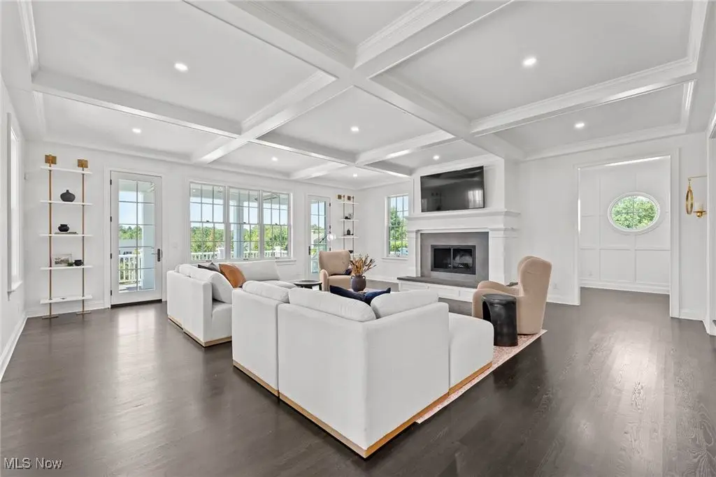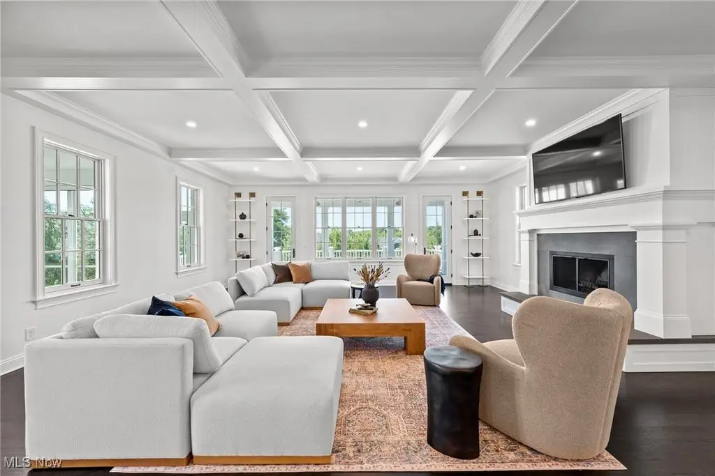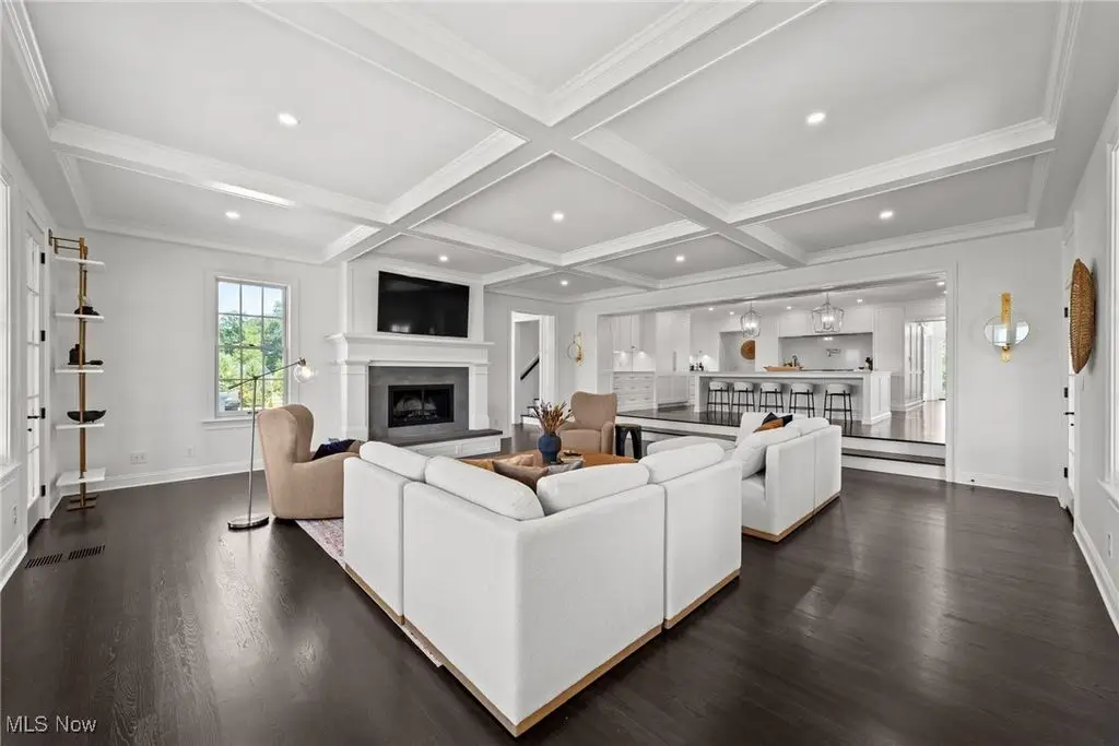 Fabulous great room with coffered ceiling and fireplace