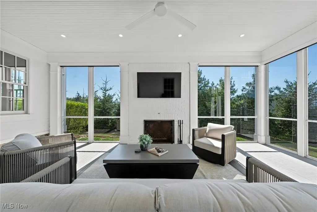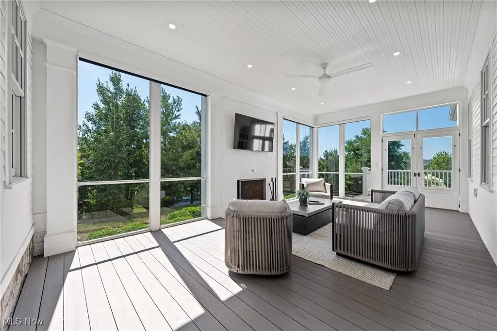 Screened-in porch with fireplace opening to expansive deck