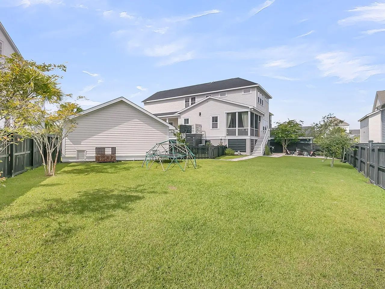A charming Daniel Island South home with a wrap-around front porch, open floor plan and impressive backyard with fire pit and room for a pool - perfect for your indoor/outdoor Lowcountry lifestyle. Filled with natural light, the first floor offers spacious kitchen with large island, walk in pantry, family room with shiplap details and gas fireplace, convenient first floor guest room with full bath, plus home office with French doors. Retreat upstairs to your master suite with modern tub and glass shower, two additional bedrooms with private baths, loft for recreation and multiple walk in storage closets throughout! Located in Edgefield Park section on a cul de sac with green space in the front and access to endless amenities inc 3 community pools, playgrounds, parks & walking/biking trails. Enter the first floor to open concept family room with coastal shiplap details, large open kitchen with large island and a dining space surrounded by windows with plentiful natural light. A walk in pantry as well as wine fridge provide adequate kitchen storage. First floor also offers a convenient and private guest room with full bathroom and home office with french doors. Or utilize this bonus space for kids playroom or exercise space. Multiple walk in coat closets provides more flexible storage. A screened porch leads to a fit pit area for enjoying lowcountry nights and a huge fenced backyard provides ample space for outdoor living and plenty of room for a pool. This is a rare .24 acre lot on Daniel Island South. The second floor offers primary bedroom suite and two bedrooms each with its own bathroom en suite. Plus, a loft rec space, laundry room, and large walk in storage closet. All bedrooms feature modern ceiling fans. A long driveway leads to a detached two car garage. Daniel Island community offers access to endless amenities including three community pools, tennis courts, pickleball courts, playgrounds, walking trails, boat ramp, and community events. Note buyer pays one time .5% community enhancement fee to the property owners association at closing.