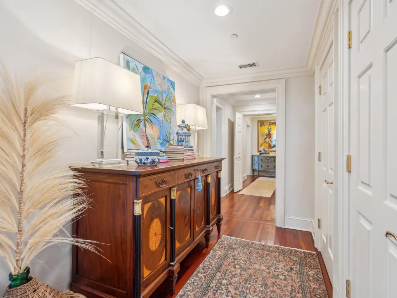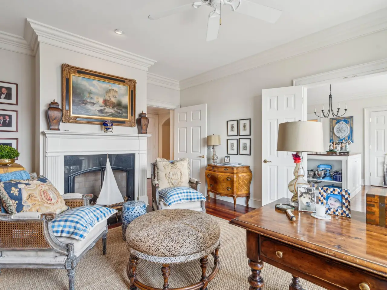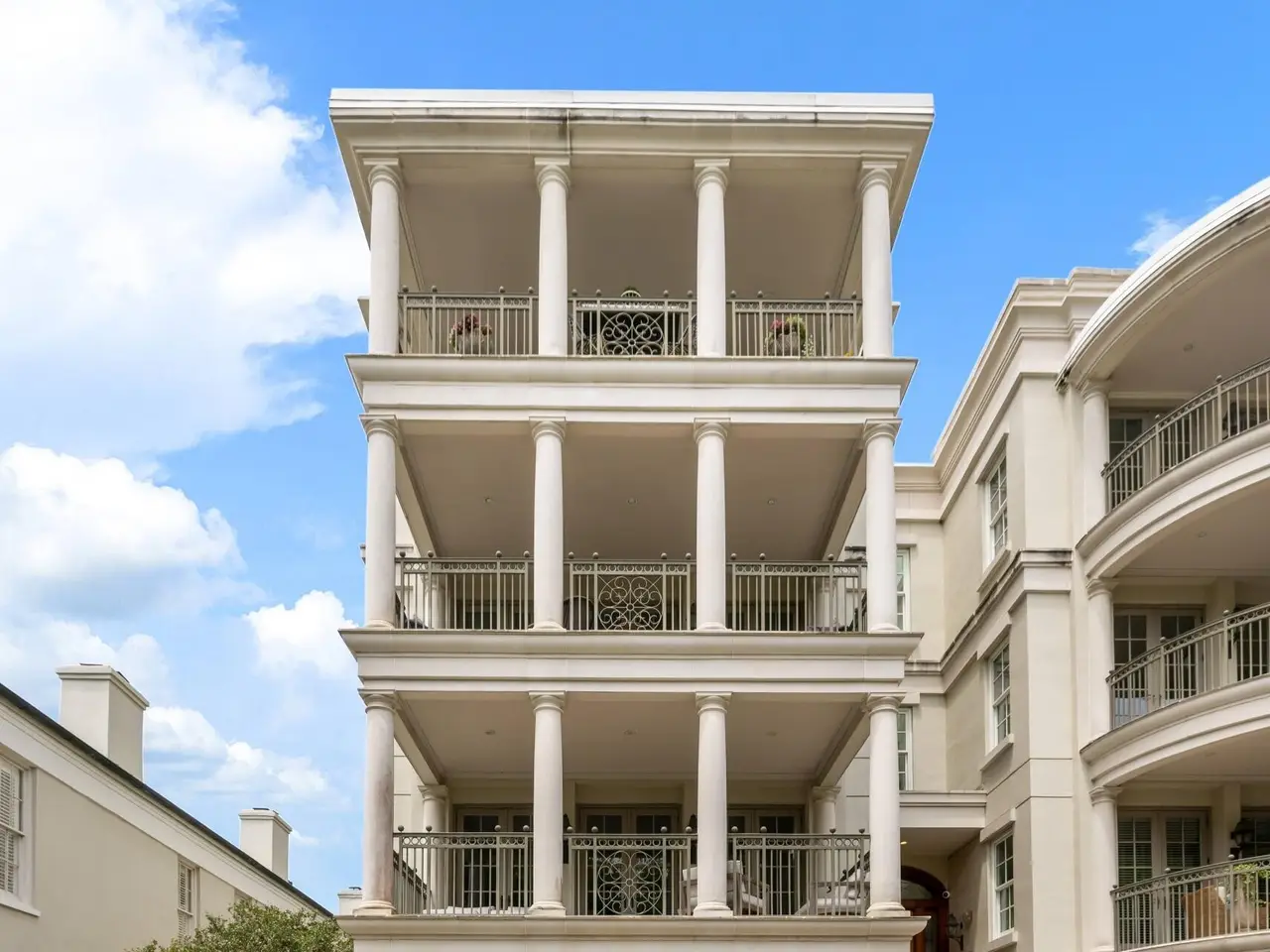 Rare, elegant penthouse-level apartment offering southern views of the Charleston Harbor from the living/dining room and terrace, with historic steeple views from the primary suite. This spacious residence offers the very best apartment floor plan in the city. Luxurious trim and mouldings throughout, this fine apartment lives like a grand home. Well-proportioned formal space with separate formal living room, and dining room divided by a mahogany paneled wet bar and storage. The side hall gallery connects the formal and informal spaces with abundant storage. The well-appointed kitchen offers a separate breakfast area with views of the harbor and beautiful sunrises. Adjacent to the kitchen is a library with mahogany built-ins and another fireplace perfect for evenings or desk working. The bedroom wing offers a comfortable guest bedroom with en suite bath. The luxurious primary suite features another fireplace with abundant light throughout. This suite is unique with two separate baths and two walk-in closets, all en suite. With its prime location, walkable to the very best restaurants and shopping, along with two garage spaces below, this luxurious residence is hands above any in the city.