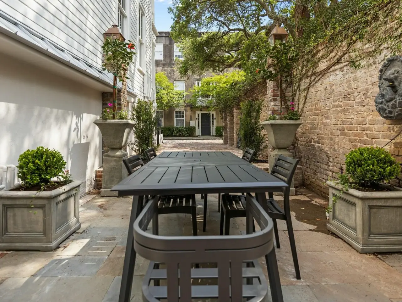 Welcome to La Belle Maison. Completely and thoughtfully renovated, this gracious home, sited on high ground (X Zone) within the original Walled City on Charleston's longest cobblestone street, is turn-key and move-in ready. 24 Chalmers boasts unusual wide, front to back views, from the sunny south-facing piazza, through parlors and dining room, to the gourmet kitchen with La Cornue range and Calacatta marble cladding. Four gas fireplaces throughout the home will make chilly nights cozy. There are primary suites on both the first and second floors. Each of the five ensuite bathrooms has access to private outdoor space which boast views of the many churches and landmarks in the French Quarter. The roof deck provides iconic views of St. Philip's Church, the Mills House, Circular Congregational Church, and the Dock Street Theatre. A secluded patio and garden lie behind secured gated parking for two cars. A spacious guest apartment is accessible at street level, with its own gated entrance and electric meter, perfect for visitors or a rental. Also at street level is a large family room/media room with a catering kitchen, bathroom, and elevator to make living easy. Main residence has 6 bedrooms, 6.5 baths and approximately 5300 SqFt. Guest suite/apartment has 2 bedrooms, 1 bath and approximately 1000 SqFt. 24 Chalmers will be featured as the 2025 Charleston Symphony Orchestra League showhouse.