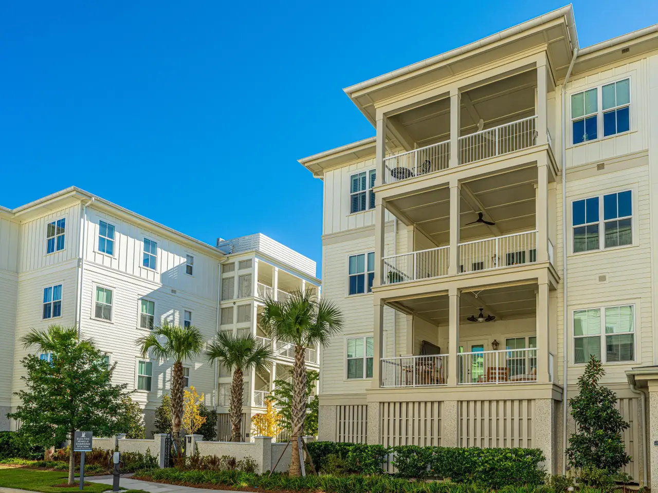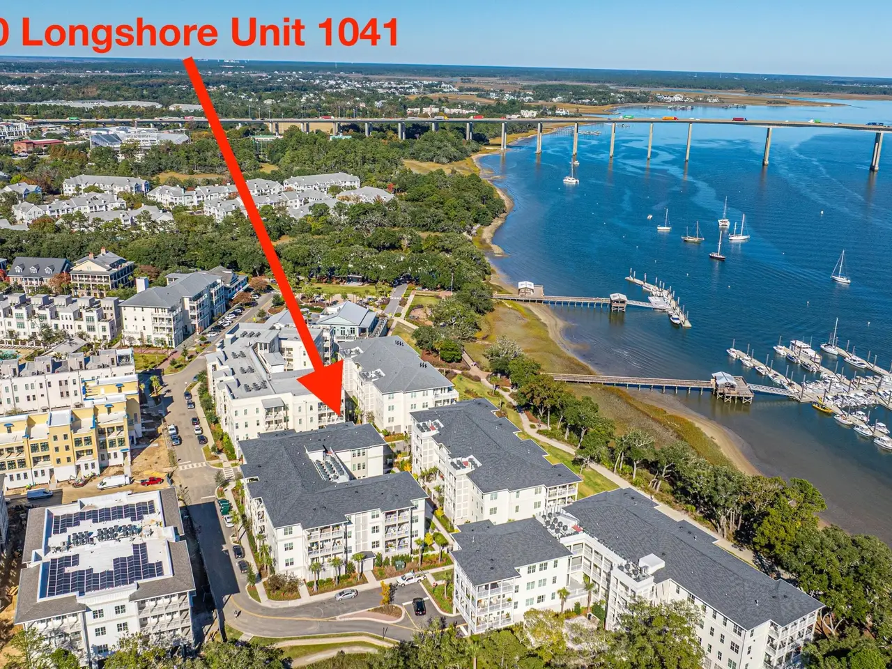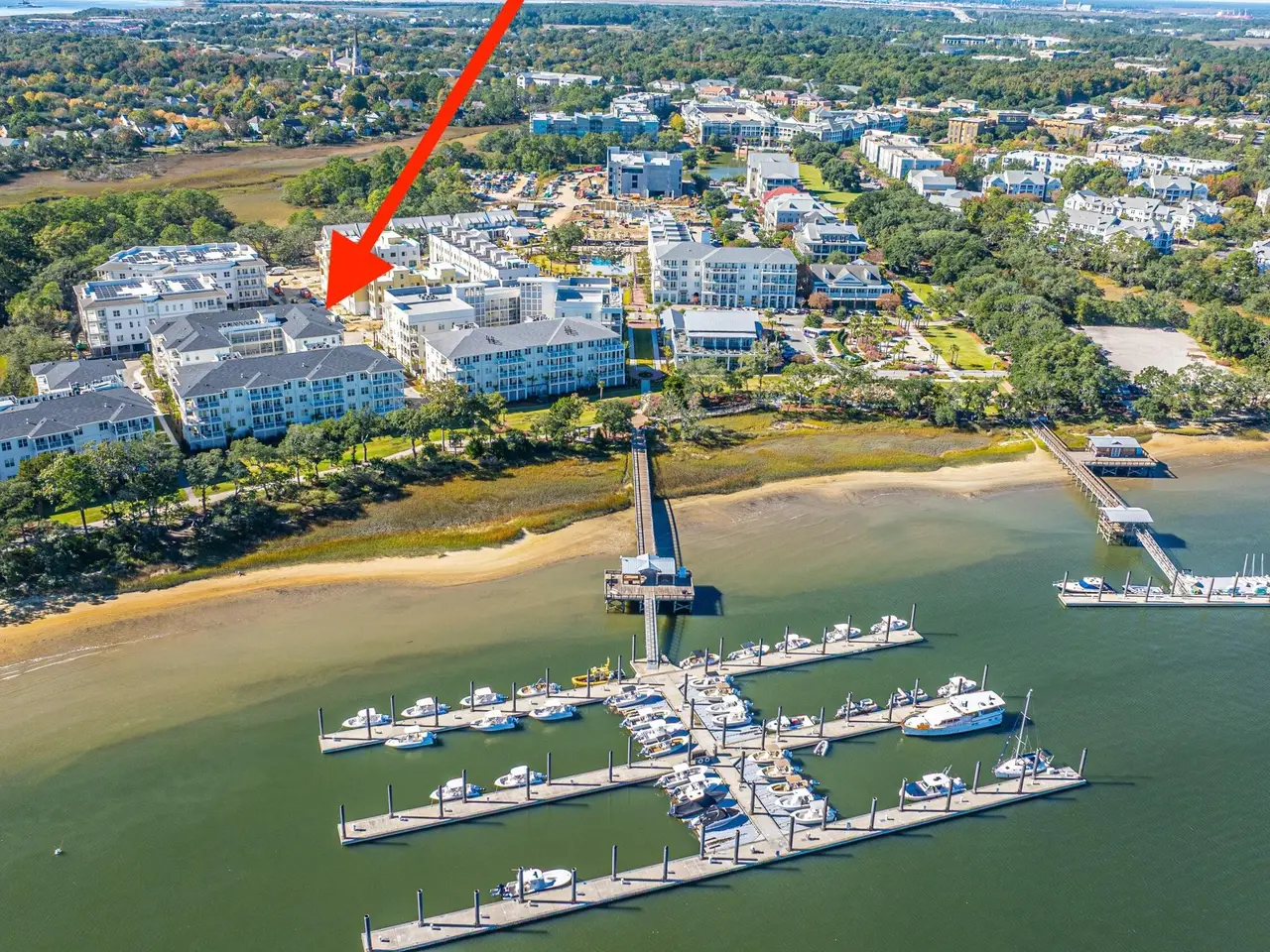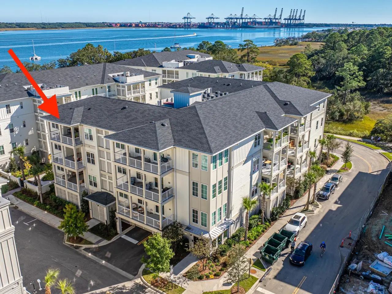 Luxury living at The Waterfront on Daniel Island! This 2024 top floor 2 bedroom 2 bathroom condominium is perfection! Enjoy fantastic views of the Wando River while basking in comfortable breezes from the large terrace. One of only six units throughout the community with no adjoining walls, experience unmatched quiet and privacy with an abundance of natural light from windows on all sides. Upgrades galore! Wide plank hardwood flooring throughout, high end lighting fixtures and ceiling fans, custom closets and kitchen pantry designed by Inspired Closets, built-in kitchen appliances offering a seamless cabinetry esthetic, professionally installed high end wallpaper, additional ceiling lighting in dining room, custom window treatments in every room, large 2 x 4 shower tile and specialty mirrors in both bathrooms, upgraded Farrow and Ball wall paint with all walls and trim receiving 2 additional coats of paint after purchase. Beautiful kitchen tile backsplash and custom countertop in pantry with added electrical outlet. Impeccably maintained unit with garage storage and 2 parking spaces conveniently located next to the elevator. Beautiful courtyard with multiple seating areas and state of the art grille. Well equipped fitness center and tranquil pool with gathering pavilion.