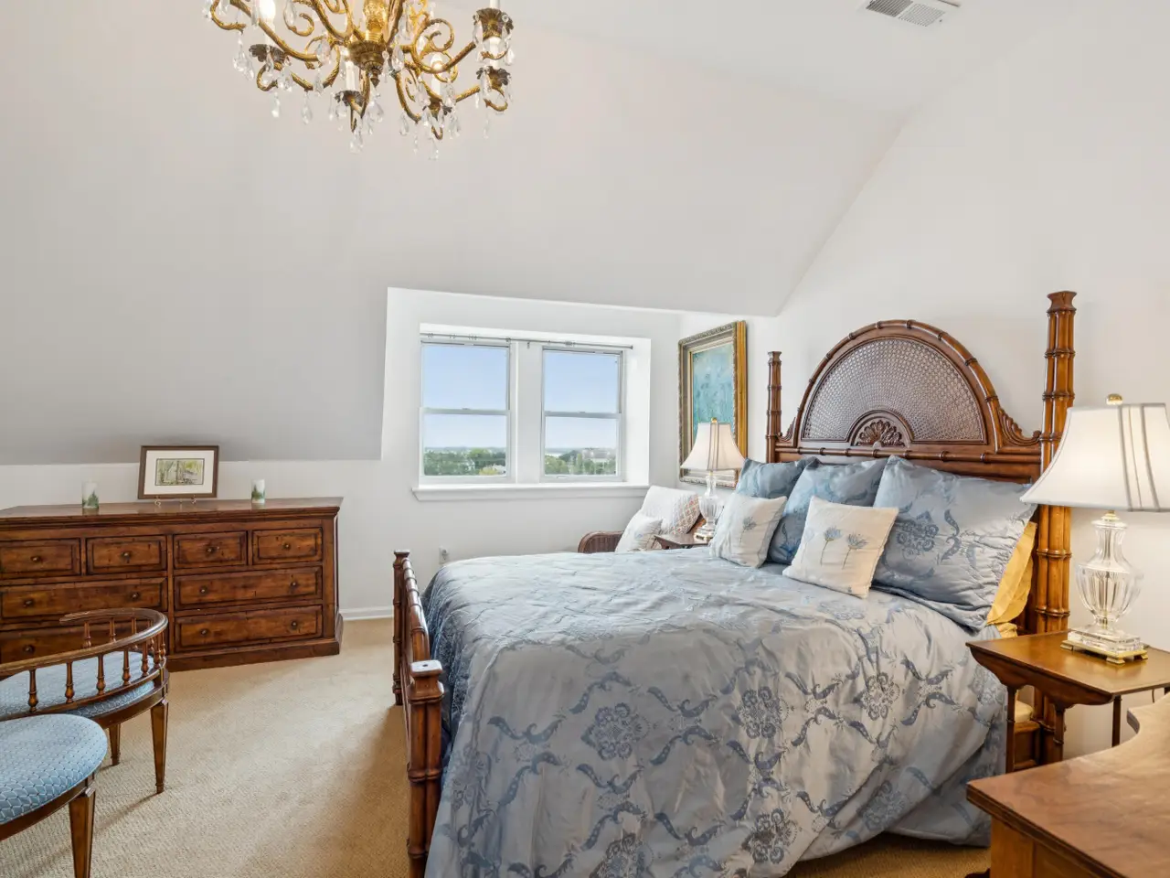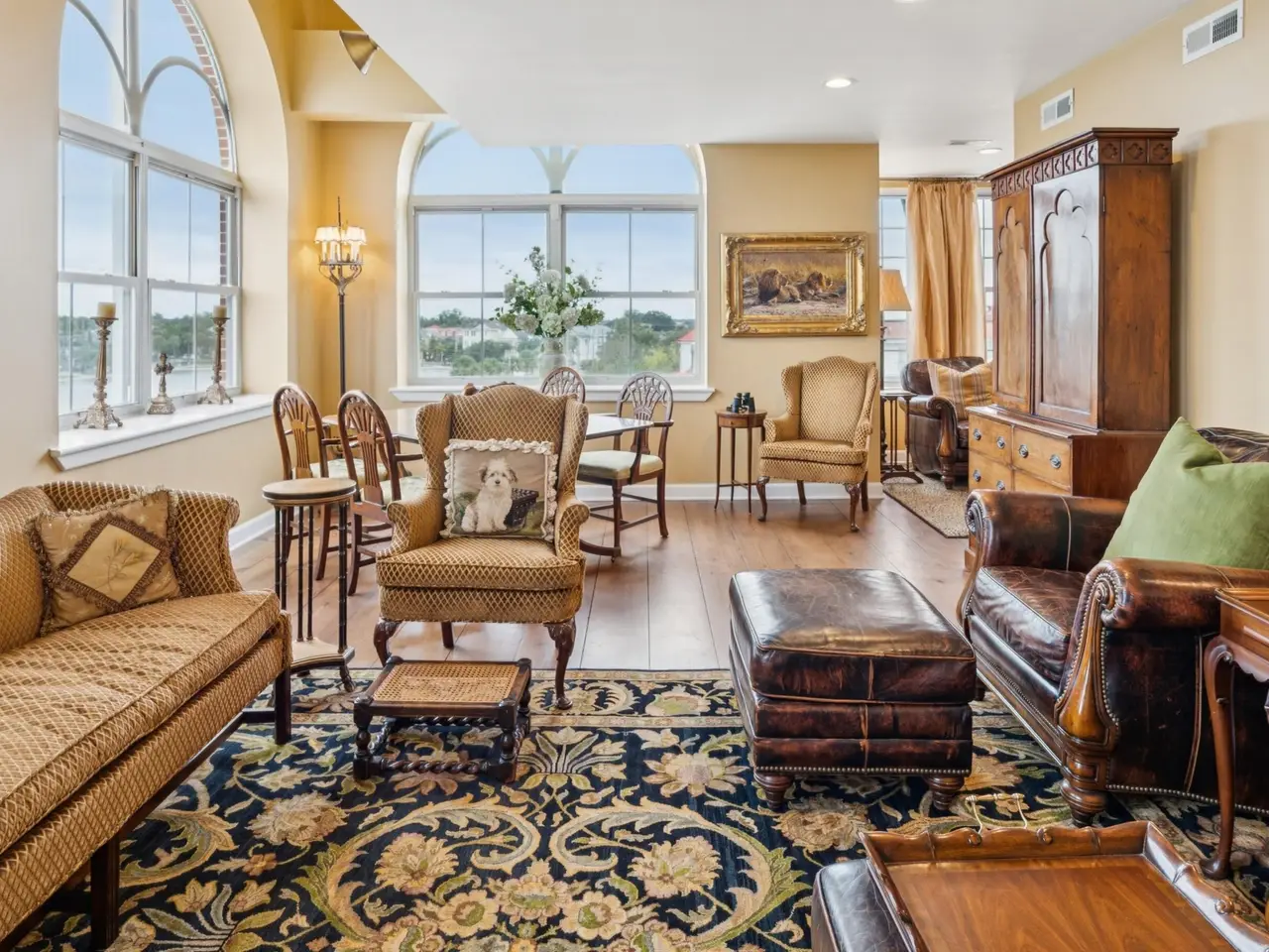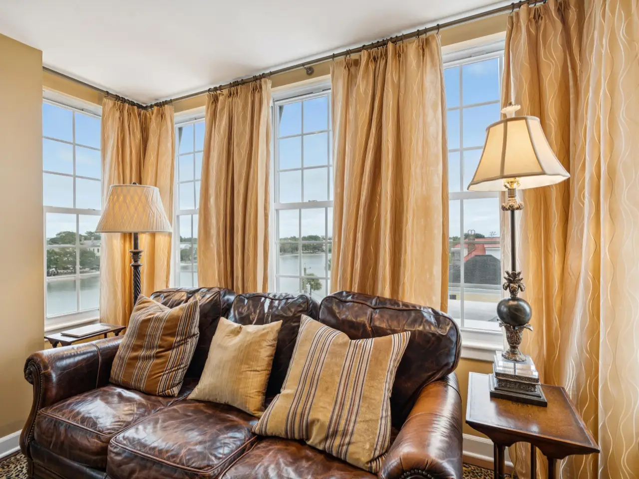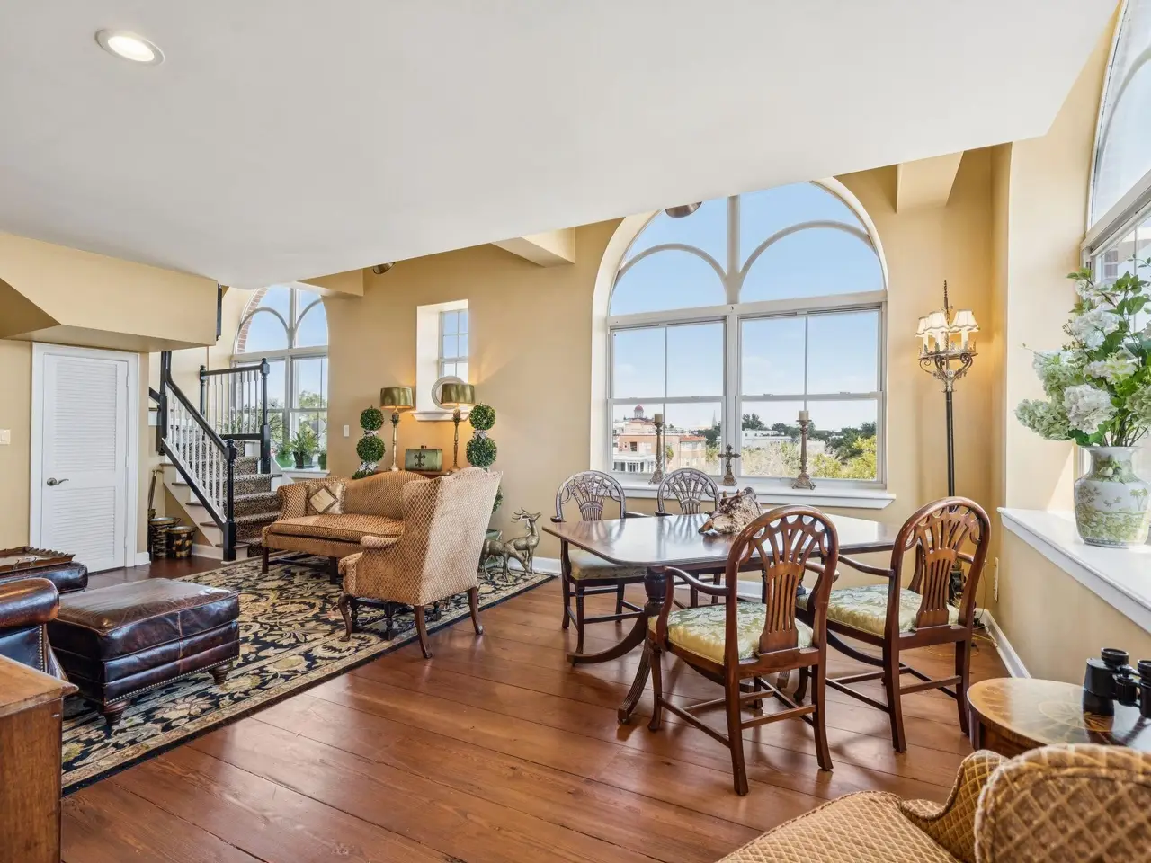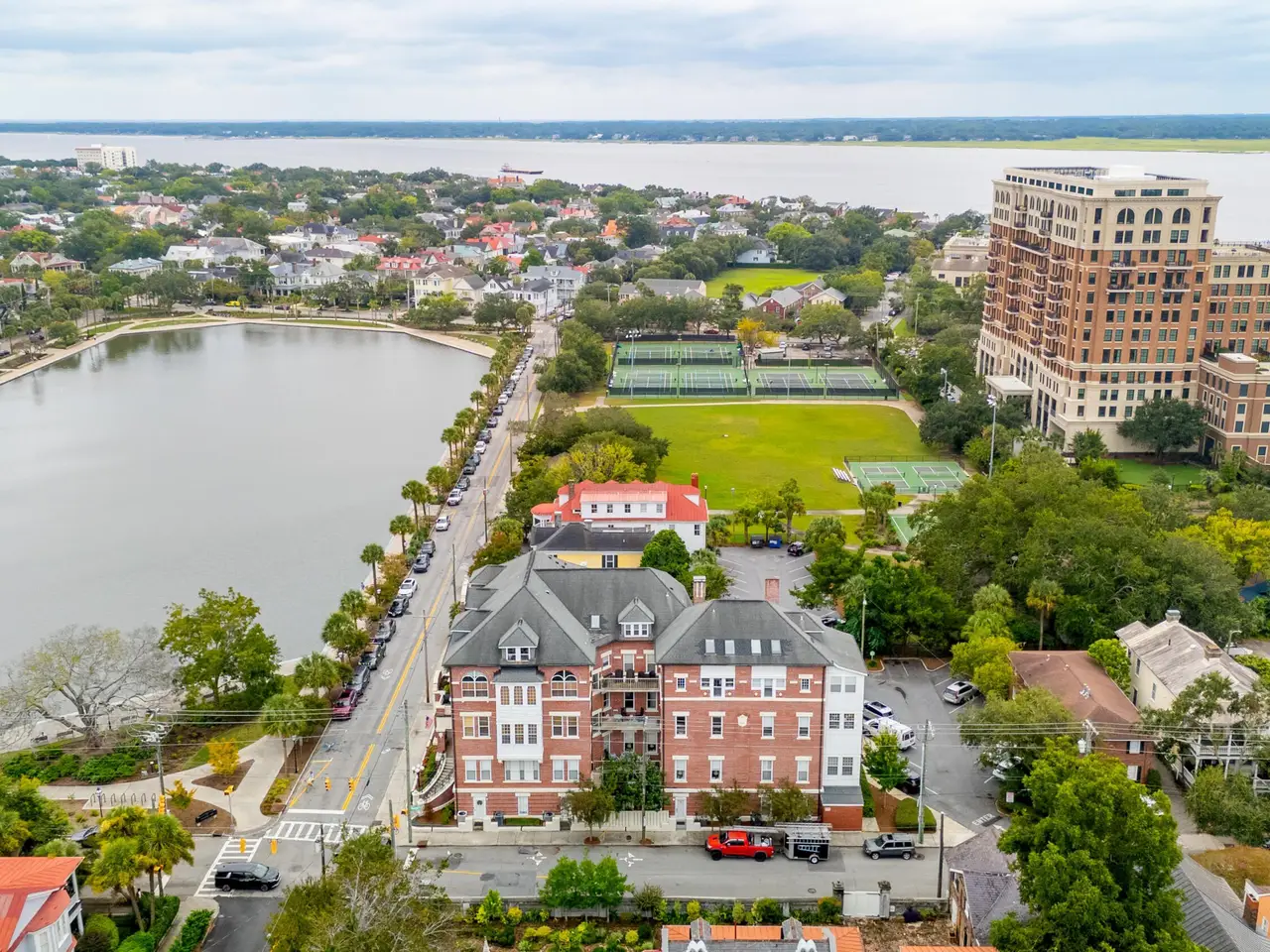 Experience breathtaking views stretching from the Ravenel Bridge to The Jasper on Broad Street from this unique, top floor, corner condominium at the historic Baker House overlooking Colonial Lake. Enjoy passive, park life and interesting wildlife, spectacular sunrises silhouetting the Charleston skyline in the mornings and colorful sunsets reflecting in the many windows of The Jasper and on the lake in the evenings. Built as a private hospital in the early 1900s, Baker House was converted into condominiums in the early eighties and Number 18 was renovated in 2021 and named ''Seven Spires''. The first level boasts three huge, Palladian style windows that showcase the panoramic vista from the living and dining area, beautiful wide plank flooring, a galley kitchen and half bath. This levelalso includes a large beverage bar with a wine cooler, coat closet and additional space separating the living area and kitchen for use as a media room, office or smaller dinette. Three bedrooms and two full bathrooms comprise the second level with unusually ample closets throughout. No storage issues here! The spacious, primary bedroom features a tiled, en-suite bathroom with a large shower and quartz countertop. The other two bedrooms are generously sized as well with skylights that enable one to sleep under the moon and the stars! A second, large, tiled bathroom with a combination tub and shower and quartz countertop is located off the hallway just a few steps from both bedrooms. Moultrie Park, a large, active park offering sports such as tennis, pickleball, and basketball, abuts the large, private parking lot for Baker House residents. Restaurants within close walking distance include The Alcove Market, Costa and Circa 1886. The Crosstown (Highway 17), connecting to all points north, east and west, is a three minute drive. This offering is an exceptional opportunity to live in an historic building, Baker House, in an historic neighborhood, Harleston Village, on the quiet, residential side of the peninsula and to enjoy fabulous views of Charleston above the tree tops! Chandeliers do not convey.