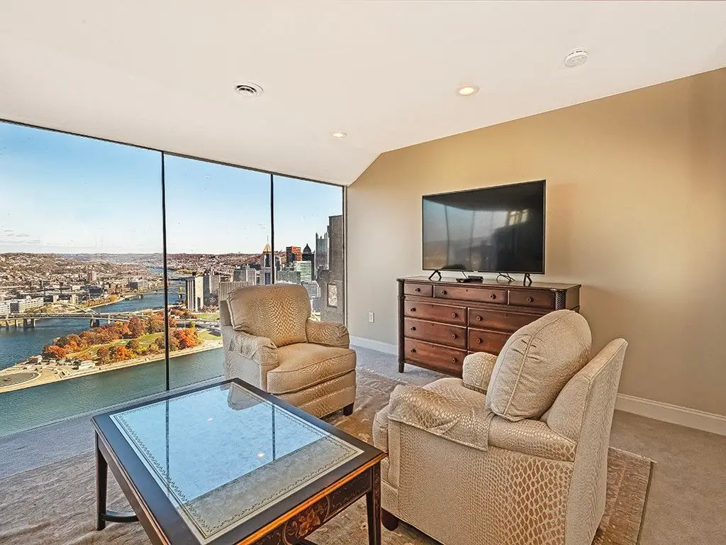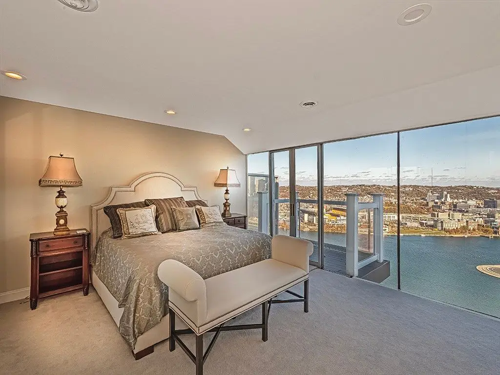 Experience luxury living in this stunning Mt. Washington condominium offering panoramic views of Pittsburgh's skyline, rivers, and stadiums. This spacious home features a sunken living room with floor-to-ceiling windows and balcony access, perfect for soaking in the cityscape. The open dining area flows into a fully equipped, step-saver kitchen. With three generously sized bedrooms - including a captive room ideal for a home office - and a luxurious primary suite with spa-like ensuite and private balcony, comfort meets elegance throughout. Enjoy the convenience of second-level laundry and an oversized car garage. Located just steps from the Incline, restaurants, and entertainment, this home offers a rare blend of peace, style, and city access. Wake up every day to million-dollar views and vacation-like living. Don't miss your chance to own this exceptional property on Grandview Avenue!
