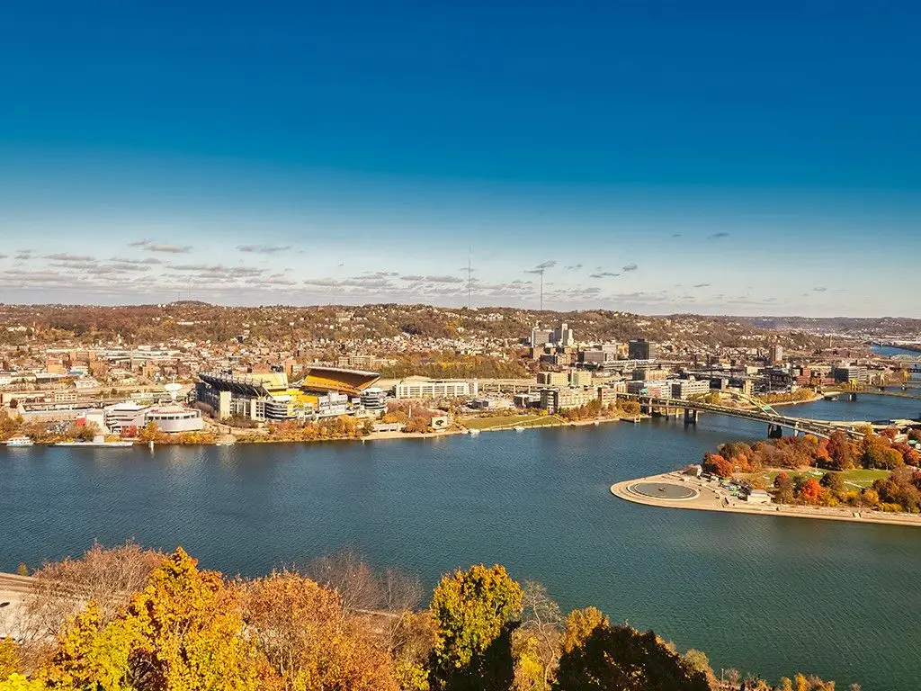 Panoramic views of Pittsburgh skyline, rivers, and stadiums