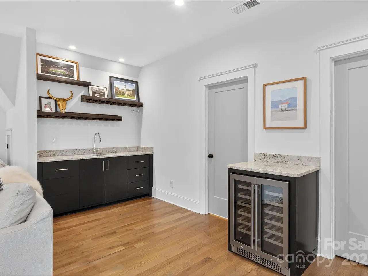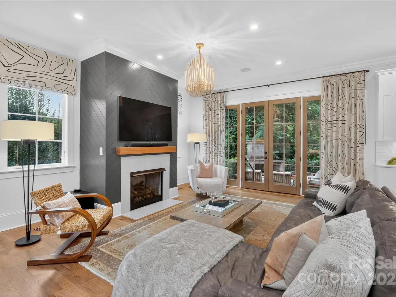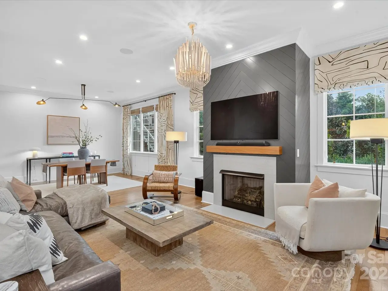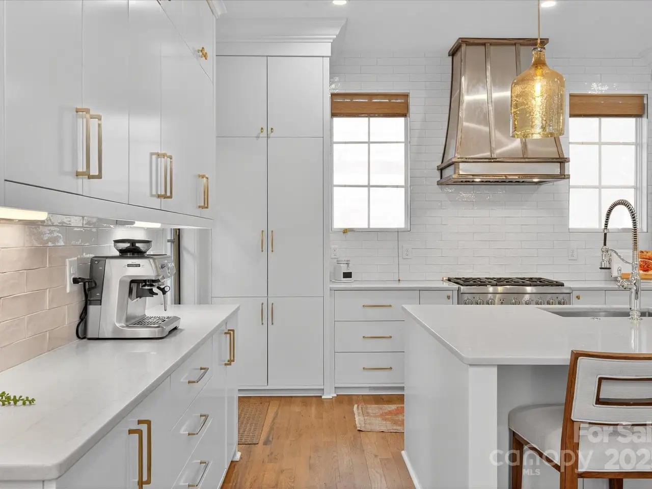 Sophisticated living meets prime walkable Dilworth in this 2019 Grandfather Homes masterpiece. Inspired by the English Farmhouse, this white brick duet lives like a single-family home, featuring white oak hardwoods, soaring ceilings, and sunlit open spaces. The chefs kitchen boasts a quartz-topped island, premium appliances, and seamless flow to the dining area and great room. French doors open to a private patio with a stone fireplace surrounded by lush greenery perfect for indoor/outdoor entertaining. The main floor guest suite offers a full bath and generous closet. Upstairs, the vaulted primary suite features a spa-like bath, expansive walk-in closet, and a wrap-around balcony overlooking serene green space. A secondary bedroom with ensuite bath and laundry complete the level. The third floor hosts a spacious bonus room with wet bar and full bath. This home blends timeless elegance w/modern comfort in one of Charlottes most coveted locations.