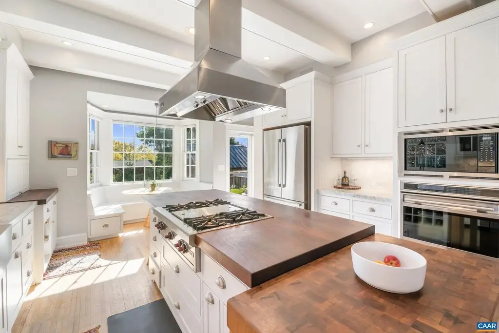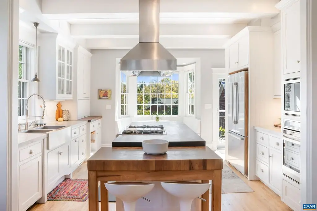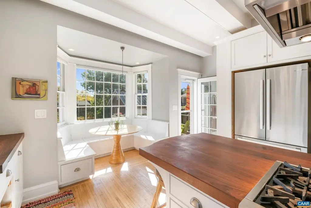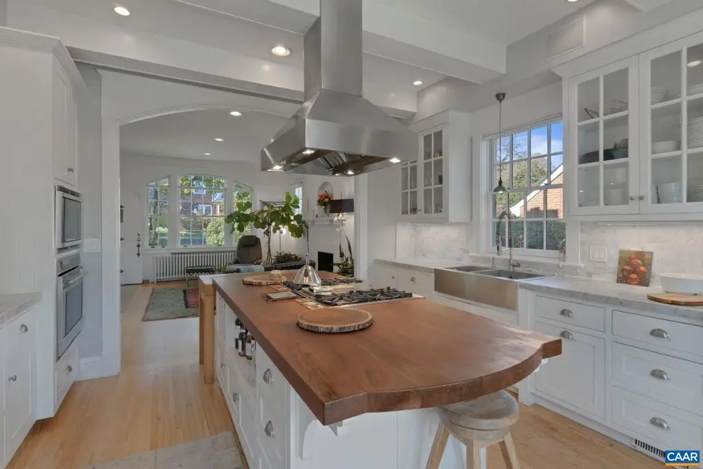OPEN SUNDAY, 11/2, 1-3! Open your next chapter in this storybook c. 1930 cottage perfectly situated on dogwood-lined Evergreen Ave-one of North Downtown's most beloved streets, along the 10-Miler route. A rare offering that blends timeless character w/ exquisite updates, this home delights at every turn. The inviting covered front porch and arched entry lead to a JEWEL BOX INTERIOR bathed in light streaming through architectural windows, 9.5' ceilings, handsome built-ins and white oak + southern yellow pine floors. The Karen Turner-designed kitchen is a SHOWSTOPPER, featuring Carrara marble counters, black walnut island, custom cabinetry, Bosch/Wolf appliances, built-in pantry + appliance storage + coffee bar. Sunny breakfast nook overlooks a peaceful backyard with IPE decking + built-in planters. MAIN LEVEL LIVING possible with 1st floor bedrooms and full bath. Upstairs offers a 3rd bedroom, 1/2 bath + flex space. Mountain views to the SE! Recent upgrades-NEW HVAC (2023) + NEW metal roof (2021) Potential for fabulous carriage house/studio in detached 2 car garage w/ electric panel + water/sewer access. An ENTERTAINER'S DREAM and idyllic retreat just steps from the Downtown Mall, boutique shopping, fine dining + farmer's markets.