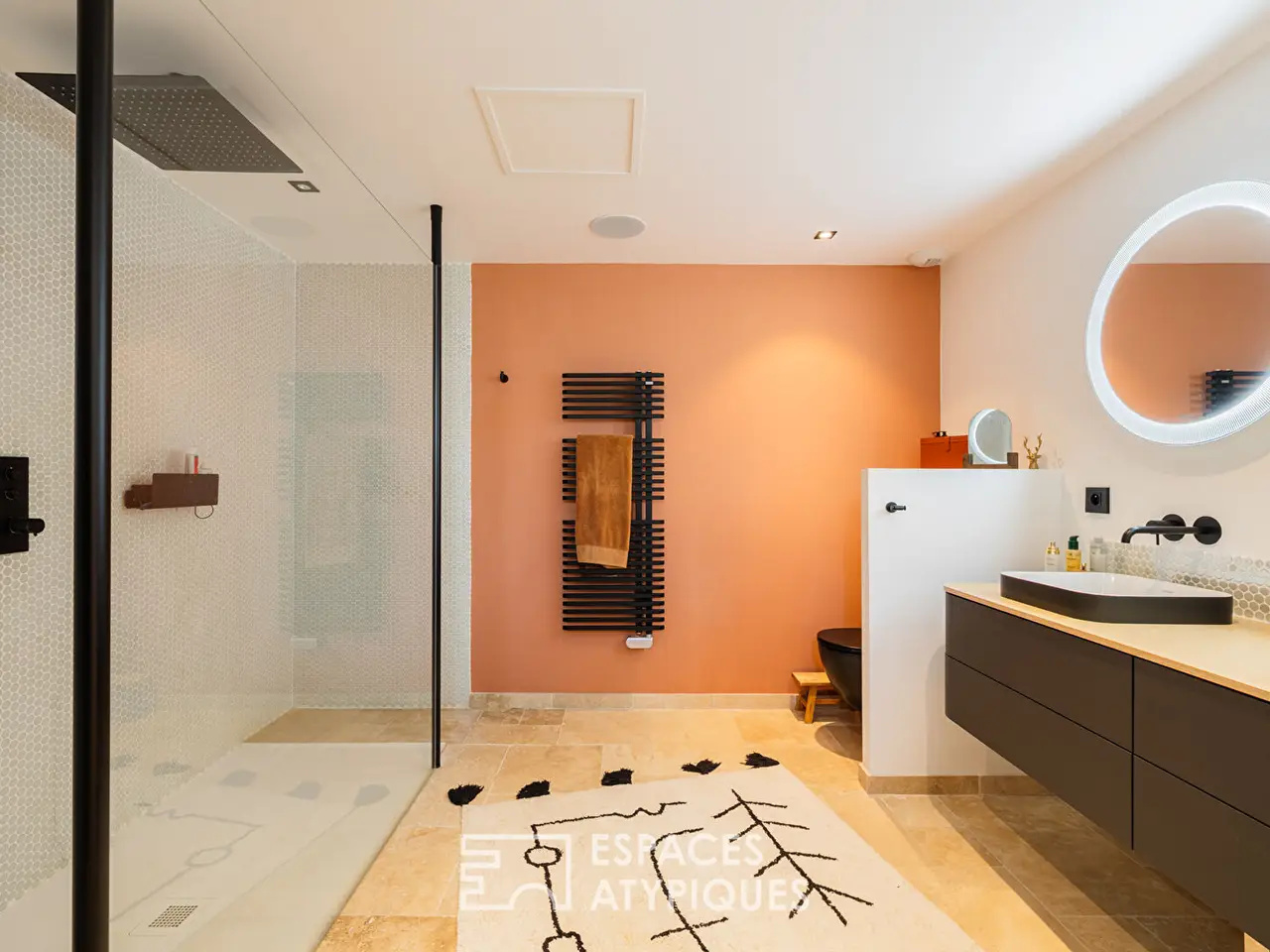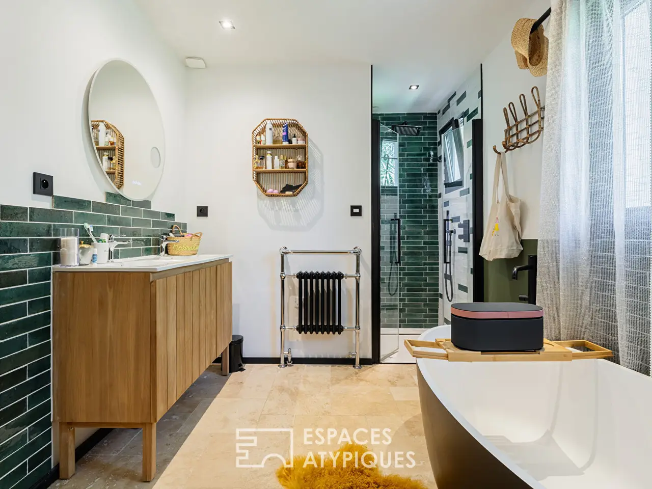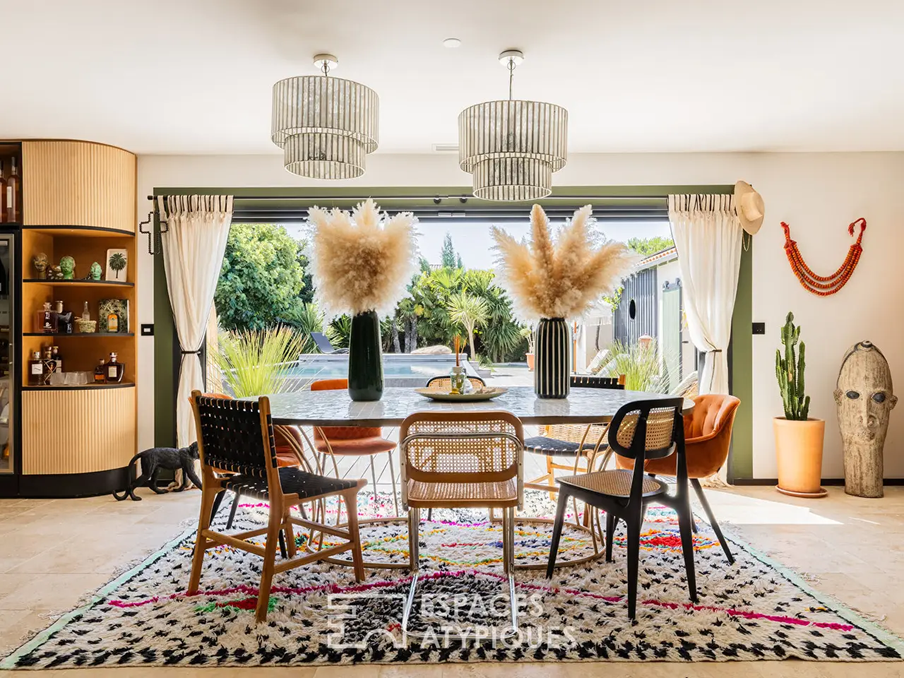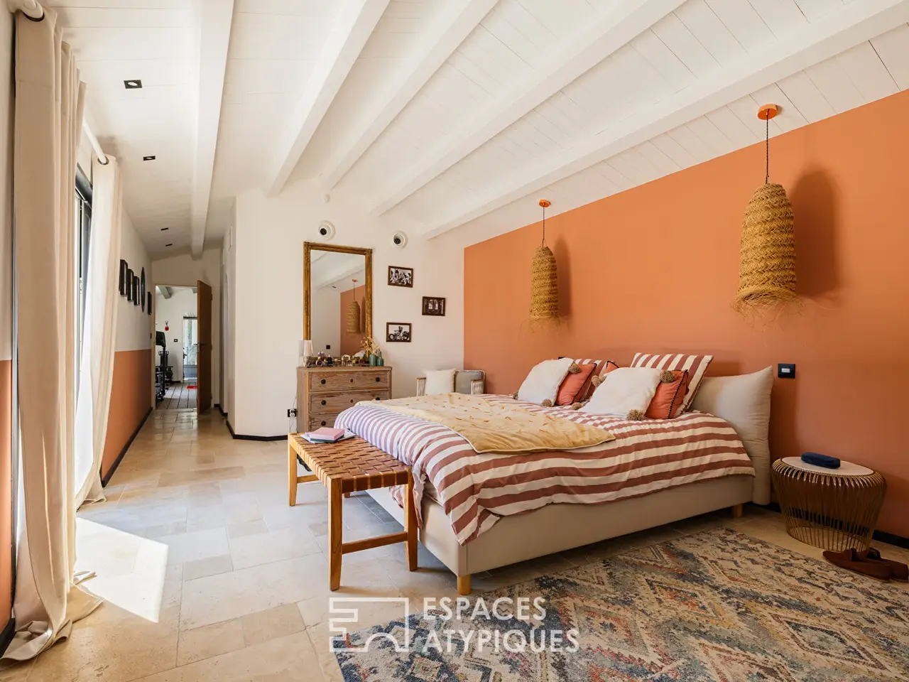 Located in a sought-after neighborhood in the commune of Chatelaillon-Plage, this exceptional villa offers a unique living environment, blending elegance and functionality. The entrance leads to a light-filled living room, where a welcoming lounge and dining room harmoniously blend together. A large bay window generously opens the space onto the terrace, creating a natural continuity with the outdoors. In its extension, an office area benefits from a soothing view of the garden. The modern and welcoming kitchen features a comfortable central island, optimizing circulation. The meticulous appointments and noble materials, such as the travertine flooring, give an undeniable cachet to the whole. In one wing, the intimate layout of a master suite with its private bathroom and dressing room reveals a breathtaking view of the pool and garden. In its continuation, a space benefiting from a swim spa allows you to enjoy a water feature year-round. On the same level, a second suite benefits from its own private bathroom. Upstairs, two bedrooms share a bathroom. The design of the house also allows for additional sleeping accommodations as needed. Outside, the landscaped and wooded grounds house various living spaces: a summer lounge, a fully equipped summer kitchen, and a heated swimming pool. The lush vegetation and the furnished pool house create a holiday atmosphere, ideal for entertaining. This villa is a rare find on the real estate market, distinguished by its interior and exterior layout, its careful decoration, and its privileged location. A true haven of peace combining comfort and style. ENERGY CLASS: 'B' / CLIMATE CLASS: 'A'. Estimated average annual energy expenditure for standard use, based on energy prices for the years 2021, 2022, and 2023: between EUR2,020 and EUR2,800. REF. EALR2149 Additional information * 9 rooms * 4 bedrooms * 3 shower rooms * Outdoor space : 1115 SQM * Parking : 5 parking spaces Energy Performance Certificate Primary energy consumption b : 96 kWh/m2.year High performance housing