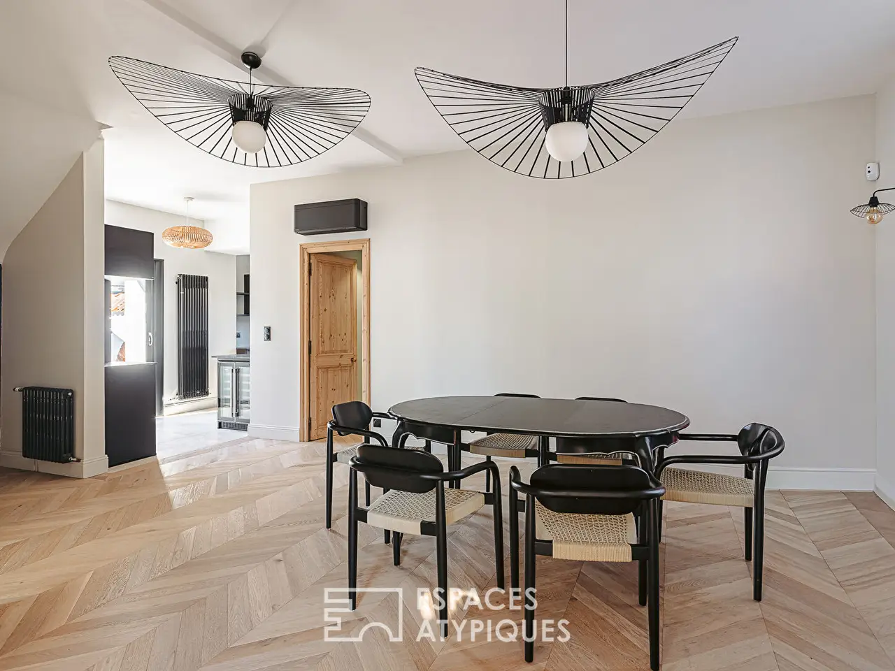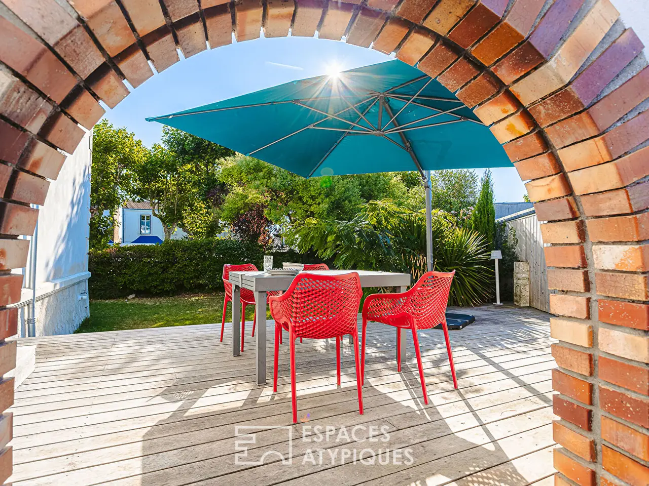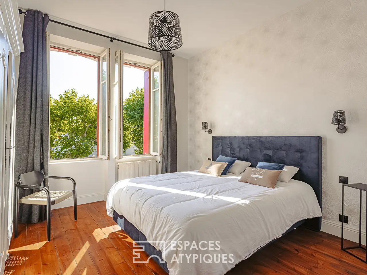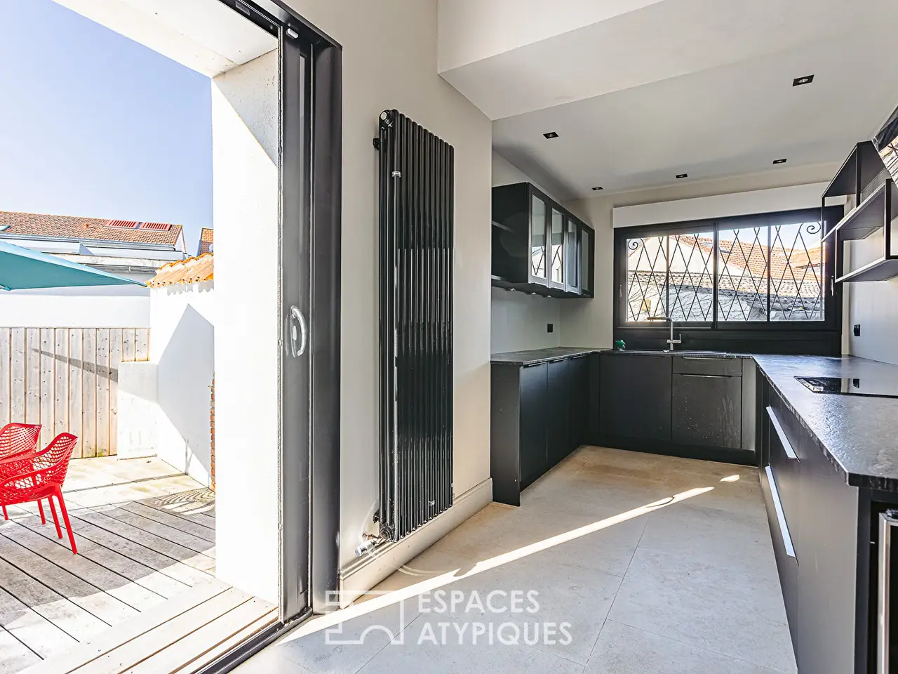 EXCLUSIVE ATYPICAL SPACES Nestled in the heart of the highly sought-after 'Golden Triangle' of Chatelaillon-Plage, one of the city's most iconic historic homes reveals its charms. Completely renovated in 2022, this exceptional family home offers modern comfort and high-end amenities, in close proximity to the market and only 250 meters from the beach. Spread over approximately 180 m2 of floor space and located on a plot of nearly 495 m2, it has five bedrooms and four bathrooms, including one located on the ground floor. The majestic entrance, highlighted by stone steps, opens onto a vast, bright living room. This open space, adorned with herringbone oak parquet flooring and generously high ceilings, is extended by a sliding bay window overlooking the terrace that merges the interior with the garden. The kitchen, perfectly integrated and equipped with quality equipment, fits naturally into this volume. For more privacy, a cozy living room, separate from the main room, reveals a reading or cinema corner. The ground floor is completed by a first suite with a bedroom and private bathroom. Upstairs, a landing leads to a second suite with its bathroom. The third bedroom has a large bathroom and a dressing room accessible from the landing. The second floor houses two additional bedrooms. The first is located under the highest roof, highlighting the remarkable exposed roof structure that soars several meters high. The second benefits from a large floor area of approximately 21 sqm (approximately 12 sqm Carrez). These two bedrooms share a large bathroom on this level. Outside, the landscaped garden is a green setting that surrounds the house. It features a pleasant lawn area shaded by vegetation, a sunny wooden terrace adjoining the living room-kitchen, and carefully landscaped paths around the house. This peaceful setting enhances the architecture of this residence, one of the first built in Chatelaillon. Located in the 'Golden Triangle', this property benefits from a privileged location allowing you to reach the market, shops and the beach on foot, combining the charm of a historic house with the comfort of a seaside daily life.ENERGY CLASS: C / CLIMATE CLASS: C. Estimated average amount of annual energy expenditure for standard use, established from energy prices for the years 2021, 2022 and 2023: between EUR2,200 and EUR3,500.REF. EALR2141Additional information* 8 rooms* 5 bedrooms* 1 bathroom* 3 shower rooms* Outdoor space : 495 SQM* Property tax : 2 499 €Energy Performance CertificatePrimary energy consumptionc : 152 kWh/m2.yearHigh performance housing*A*B*152kWh/m2.year24*kg CO2/m2.yearC*D*E*F*GExtremely poor housing performance* Of which greenhouse gas emissionsc : 24 kg CO2/m2.yearLow CO2 emissions*A*B*24kg CO2/m2.yearC*D*E*F*GVery high CO2 emissionsEstimated average annual energy costs for standard use, indexed to specific years 2021, 2022, 2023 : between 2200 € and 3050 € Subscription IncludedAgency feesThe fees include VAT and are payable by the vendorMediatorMediation Franchise-Consommateurswww.mediation-franchise.com29 Boulevard de Courcelles 75008 ParisInformation on the risks to which this property is exposed is available on the Geohazards website : www.georisques.gouv.fr