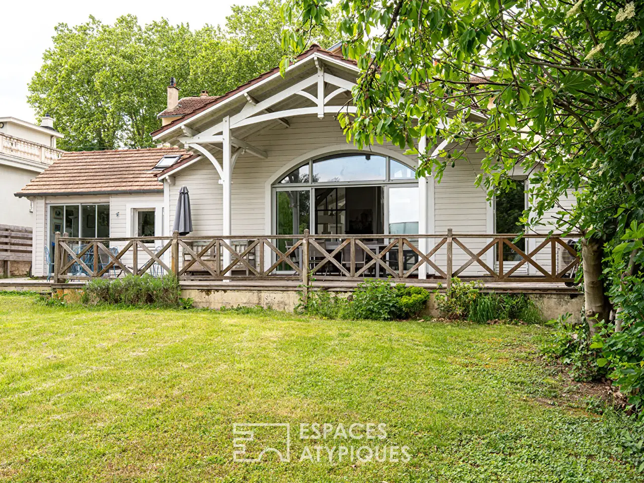 Located in a sought-after residential area of Chatou, this architect-designed house, built in 1995, offers 243 m2 of living space on a 270 m2 floor area with a 717 m2 garden. On one level with a mezzanine, it offers unobstructed views of the banks of the Seine and the dam, and is distinguished by its generous proportions, contemporary lines, and through windows. A private terrace, a separate workshop, and two parking spaces complete this property with its rare features. This unique living space blends a Californian feel with residential comfort. The entrance hall with a cloakroom opens onto a fully equipped kitchen under a glass roof, bathed in natural light. The 56 m2 cathedral-style living room (air-conditioned), featuring a fireplace, boasts remarkably high ceilings and direct access to the terrace (southeast-facing and not overlooked). The house comprises five bedrooms, including a master suite with a bathroom and shower, as well as an office. A second bathroom with a shower, a powder room, and a laundry room complete the layout. An adjoining artist's studio (air-conditioned), with independent access, offers a potential sixth bedroom or creative space. The fully enclosed garden, opposite the terrace, is an ideal place to relax and is a true extension of the house. The property is located less than a 20-minute walk from the Chatou/Croissy RER A station, schools, and shops, while benefiting from direct access to the towpath. This co-owned property (13 units with 3 owners, no pending proceedings) offers a unique living environment, combining architectural character, exceptional volumes, and a privileged natural setting. ENERGY CLASS: E / CLIMATE CLASS: D Estimated average annual expenditure based on average energy prices indexed for the years 2021, 2022, and 2023 (including subscriptions): between €5,070 and €6,910. REF. 10941 Additional information * 8 rooms * 5 bedrooms * 2 bathrooms * 1 bathroom * Outdoor space : 1342 SQM * Parking : 2 parking spaces * 3 co-ownership lots * Annual co-ownership fees : 1 300 € * Property tax : 2 703 € * Proceeding : Non Energy Performance Certificate Primary energy consumption e : 257 kWh/m2.year High performance housing