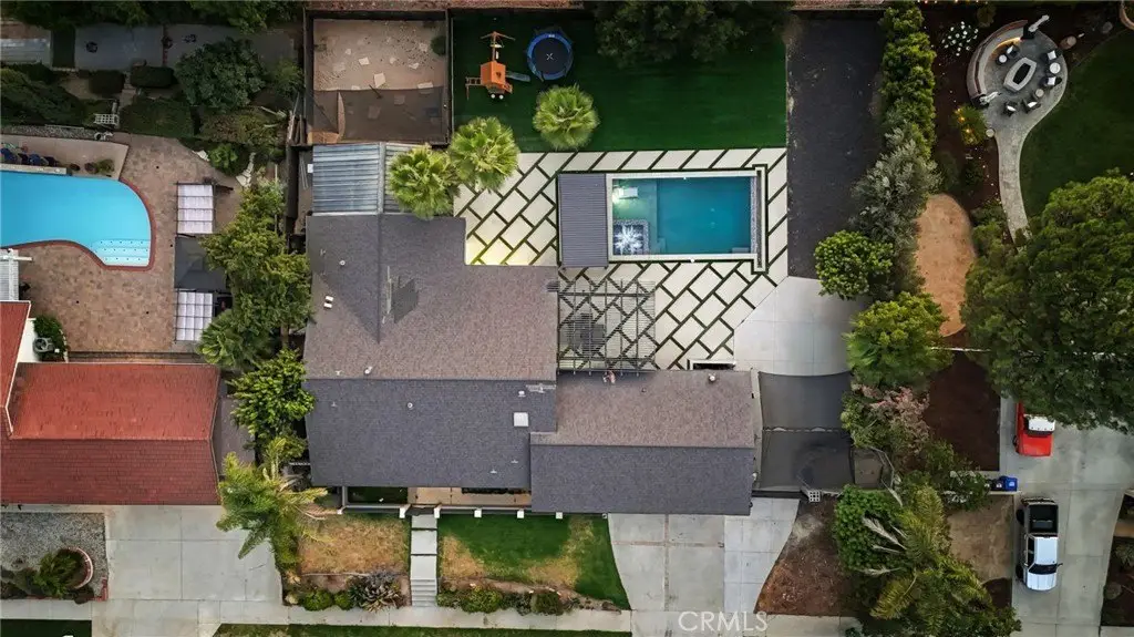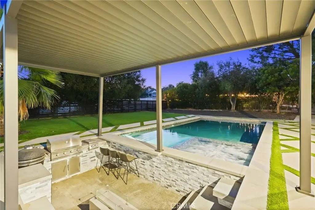 • Resort-style backyard with a sparkling pool, sunken fire pit, and built-in barbecue center