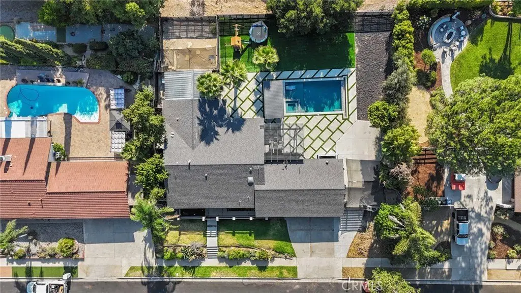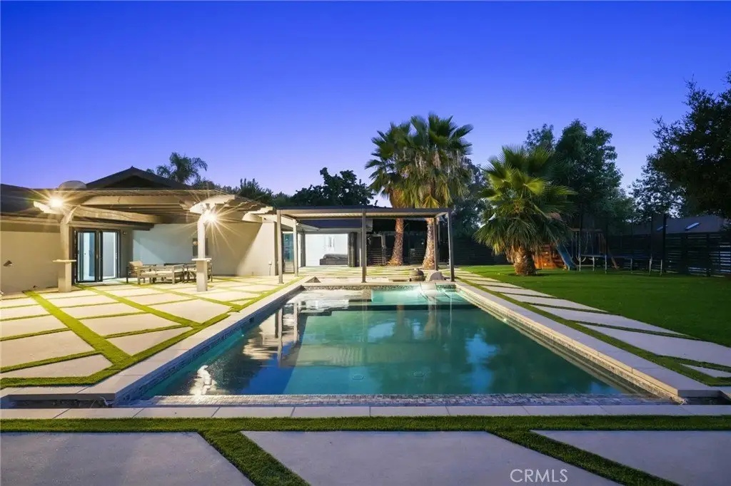 Picture-Perfect Modern Estate in Prime Chatsworth Neighborhood with ADU Potential! Welcome to this sprawling, single-story showpiece located in one of Chatsworth's most sought-after neighborhoods. Designed with a sleek, modern aesthetic, this dark contemporary residence showcases minimalist interior finishes and exceptional craftsmanship throughout. Step into a seamless open floor plan where the living room impresses with a custom TV wall featuring built-in cabinetry, a slab backdrop, and an elegant electric fireplace. The space flows effortlessly into a chef’s dream kitchen outfitted with a massive waterfall island, two-tone matte lacquer cabinetry, quartz countertops, and top-of-the-line Thermador appliances, including a built-in fridge and open shelving. Accordion-style glass pivot doors blur the lines between indoor and outdoor living, opening wide to reveal a resort-style backyard. Set on a massive, usable lot, the outdoor space is your private oasis, complete with modern landscaping, a sparkling pool and spa, sunken fire pit, built-in barbecue center with a Big Green Egg, and expansive turf and concrete areas perfect for entertaining or relaxing. The lot also includes RV access and ample space for an ADU. A dedicated pet-friendly area with privacy fencing ensures your furry friends have their own secure sanctuary. This 4-bedroom, 2.5-bathroom home features a luxurious primary suite reminiscent of a five-star resort. Enjoy serene backyard views through retractable accordion doors, and unwind in the spa-inspired en-suite bathroom adorned with 24”x48” porcelain tiles, black-veined accents, a massive walk-in shower with dual rain showers, and his-and-hers vanities. A spacious walk-in closet completes this dream retreat. Additional highlights include: Designer ocean-blue tiled guest bathroom with floating vanity and tub/shower combo. A private half bath in the fourth bedroom, perfect for guests or office use. Bonus family/media room adjacent to the kitchen, ideal for movie nights. 3-car garage with window views into the home and direct access to the living area. Whether you’re entertaining, relaxing, or envisioning future expansion with an ADU, this home delivers on every level. Don’t miss the opportunity to own this exceptional property in one of the Valley’s most desirable communities!