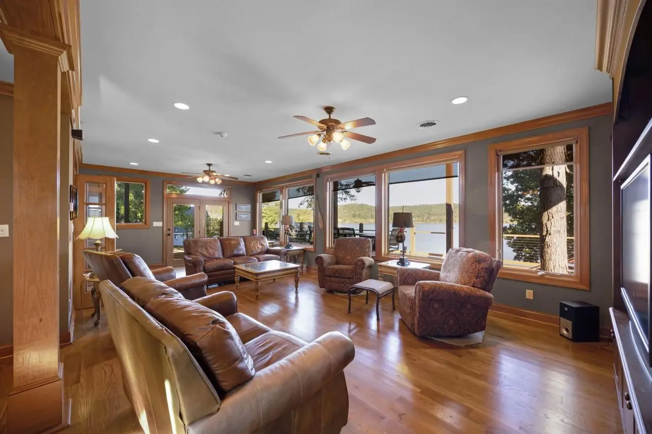 This stunning custom built home has a 4 BR, 3.5 BA waterfront main house and 3 BR, 2.5 BA Guest House . Located on a point with 157' of year round deep water. Guest house sits over a 40x42 boat house with 2 marine railway systems capable of loading two 30' boats into Climate Control dry storage. Kitchens have granite counters, custom built cabinets and stainless steel appliances. Boat Storage includes a 10X20 Concrete Safe Rm. Guest house has a separate entrance with extra parking. Main House has a 3 car garage. Has an excellent location for an inground Pool by the Waters Edge. Selling fully Furnished.