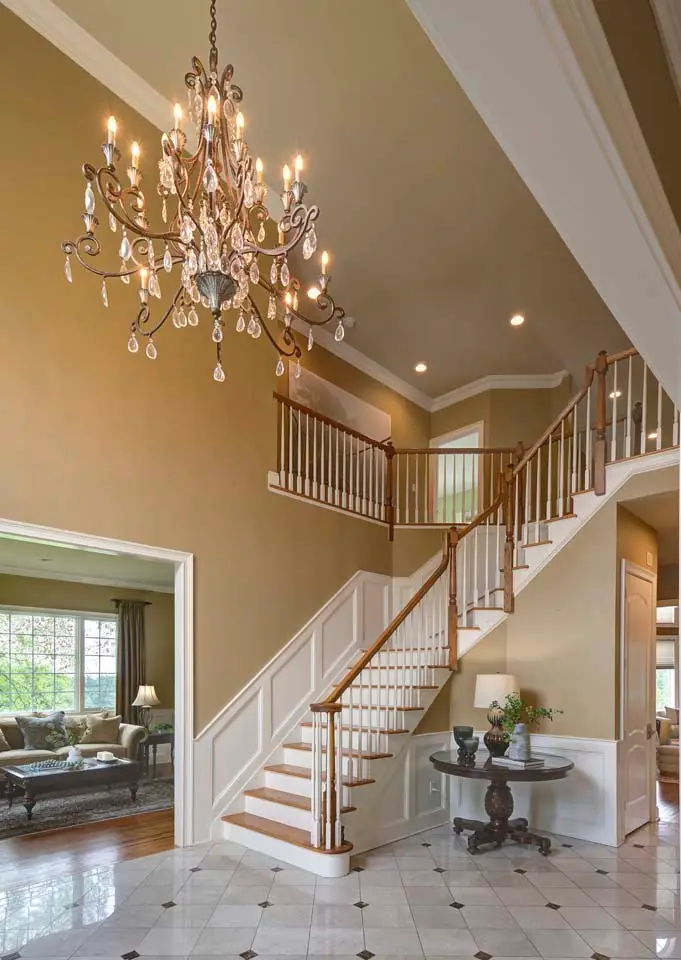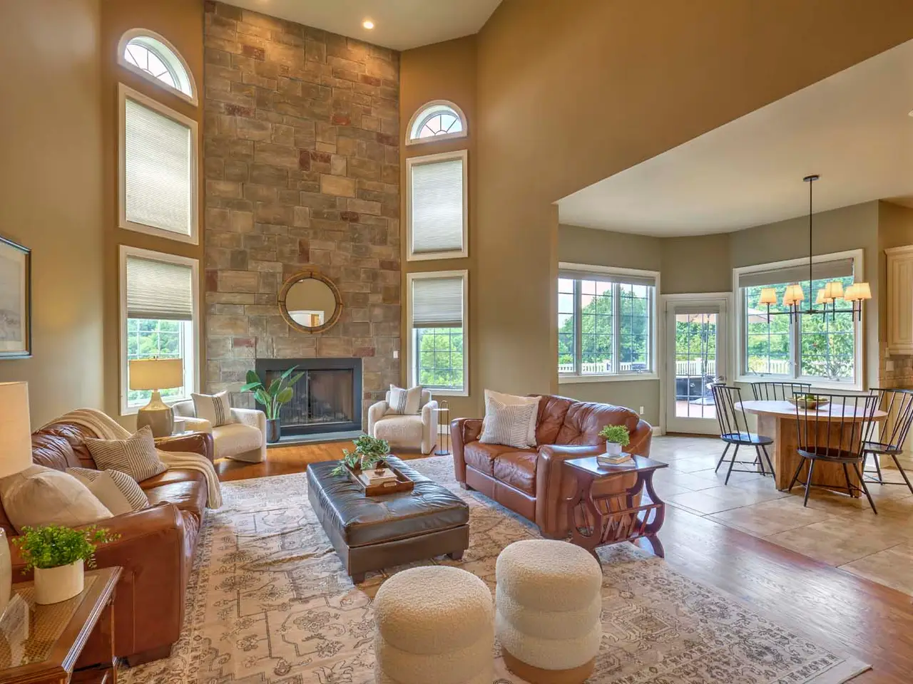 Two-story family room with floor-to-ceiling stone fireplace