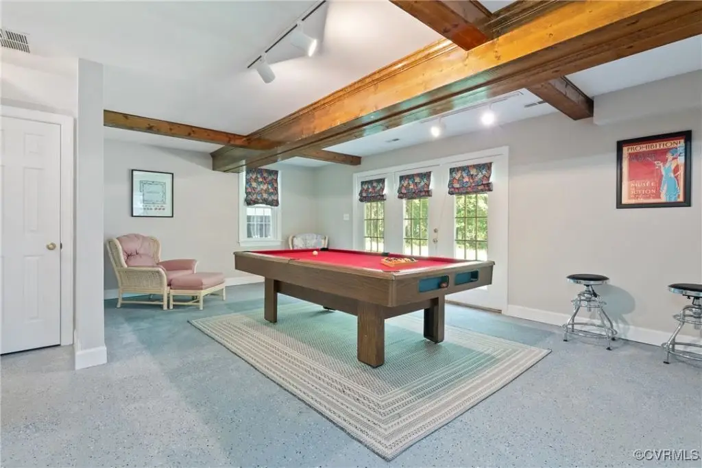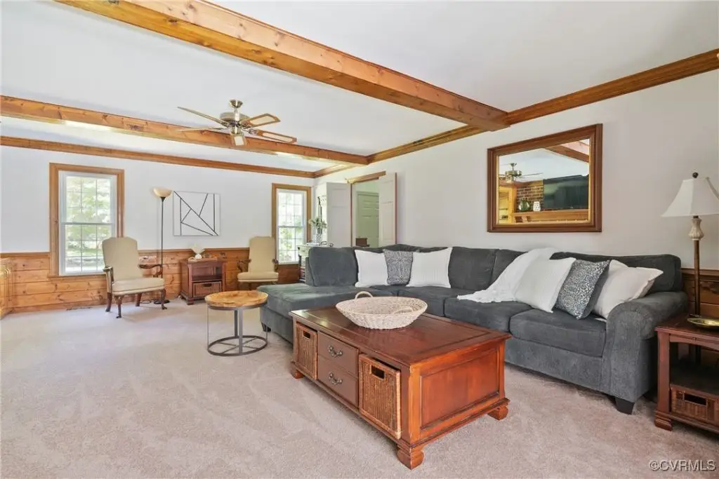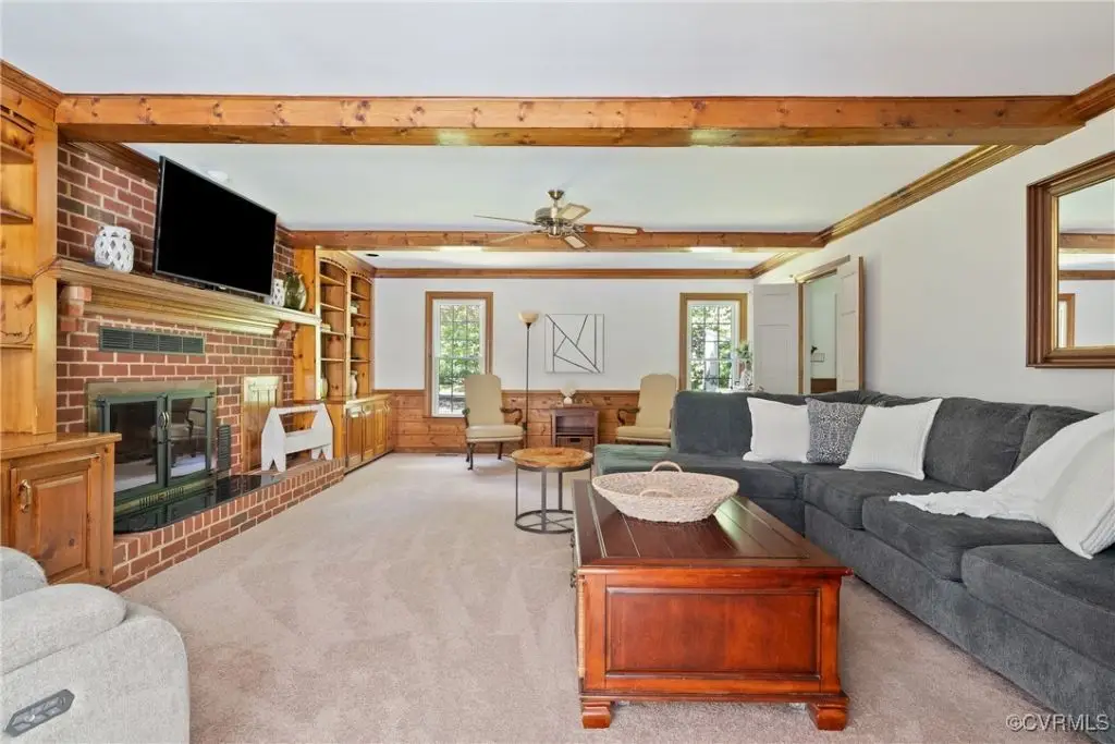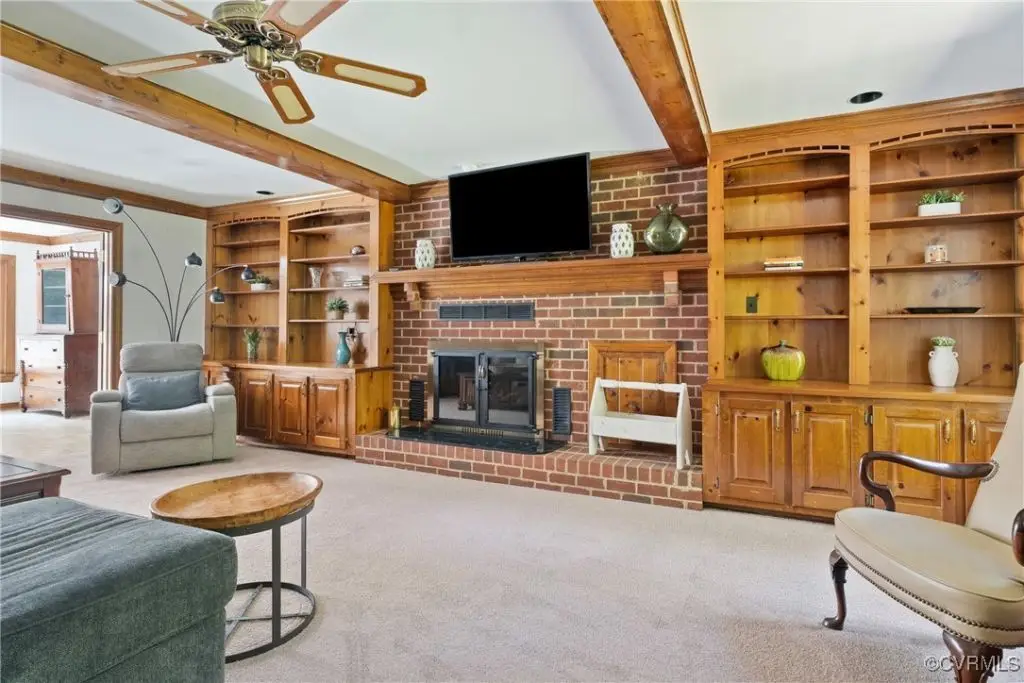 Brick fireplace with beamed ceiling