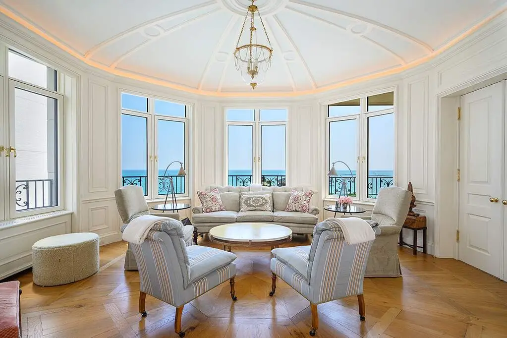 This is an exceptional opportunity for a completely custom home in one of the most desirable Gold Coast buildings. Spanning nearly 12,000 square feet across two levels with three beautiful exposures, this estate-like property is the perfect city home. Enjoy boutique style living in a building with first class service. Designed by the late David Easton in collaboration with Eric J. Smith, this home was built to easily host large gatherings while still enjoying the comforts of day-to-day living. The gracious limestone foyer is a most beautiful receiving area, with gorgeous and intricately designed moldings and lighting all which leads to an amazingly sunny gallery and rotunda. The professional grade kitchen features the highest quality appliances, ample prep space, plus a separate butler pantry and catering space. Flanking either side of the kitchen are a breakfast room to the east for everyday dining, and an oversized dining room to the west for hosting more formal gatherings. The breakfast room features a custom, dual sided aquarium for living art and opens into the family room with rounded windows overlooking Lake Michigan. The formal living and library spaces are clad in Nordic pine and face east for spectacular lake views. Two exceptional bedroom suites, a well outfitted mudroom/family entrance, an art studio/project room, and an extra-large laundry room complete the east side of the home. A private fitness center, a media room, multiple wet bars/kitchenettes, and an extensive wine cellar all add to the main level of the home. Each room has details that one only finds in the most custom and detailed of properties. A classic staircase leads to the second level of the home, which is dedicated solely to bedroom suites, allowing for the utmost in privacy. The expansive primary suite offers a generously sized east-facing bedroom with privacy sound glass, dual baths and dressing rooms, as well as a separate study or sitting room. Three additional bedroom suites all offer wonderful closet space and nicely appointed incredibly detailed ensuite bathrooms. Enjoy six private terraces, state-of-the-art audio visual, and sensational storage throughout in addition to seven premium garage parking spaces and three storage spaces. This is truly a one-of-a-kind home with too many details to list! 65 E Goethe features 24-hour door-staff and a beautifully designed rooftop terrace with spectacular city views.