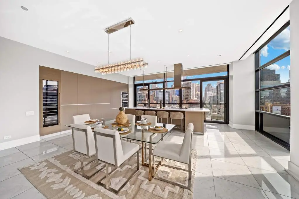Step into a world of refined luxury where every detail has been curated for those who demand more than just a place to live-they demand a lifestyle. This exquisite residence in a boutique River North building is a symphony of marble, light, and modern design. The sprawling floor plan, featuring 3 bedrooms plus home office and 2.5 baths, truly offers an escape above the city yet firmly anchored in its energy. Enter through a marble-clad foyer with custom storage that sets the tone for a home designed with both elegance and ease in mind. The expansive living and dining spaces flow effortlessly, wrapped in floor-to-ceiling south-facing glass that drenches the interiors in light while framing Chicago's skyline in cinematic fashion. An electric fireplace adds warmth and intimacy, while the dining area opens onto an east-facing balcony-perfect for morning coffee with the sunrise. The custom designed Valcucine kitchen is a study in sleek functionality: quartz-clad island seating four, integrated Miele appliances including a five-burner cooktop, convection microwave, and beverage refrigerator, all framed by polished chrome fixtures and a powerful Max Fire hood. Retreat to a primary suite that redefines indulgence-two balconies with both south and east exposures, a walk-in closet plus three additional closets with organizers, and a spa-caliber bath featuring a soaking tub, dual vanities, rainfall shower with bench seating, and a separate marble-clad water closet. Two additional bedrooms provide sanctuary for guests or family, each with floor-to-ceiling windows and customized storage; one enjoys a marble ensuite bath, the other easily pairs with an elegant sitting room/office anchored by marble floors. A powder room, full laundry room with Samsung washer/dryer and cabinetry, and thoughtful built-ins throughout underscore the commitment to both beauty and function. Private 2 car heated garage, temperature-controlled wine storage, and spacious storage closet complete this home. All of this in a sought after building complete with 24/7 concierge, covered & heated dog run, bicycle storage, elite-level fitness facility, security team, and more! Extraordinary location offers easy proximity to all that the area has to offer; world class dining, retail and culture, as well as transportation, river access, Ogden Elementary, and so much more! Set within an intimate building known for privacy, this residence is not just another River North condo-it's a stage for a life well lived, where boutique luxury meets world-class city living.
