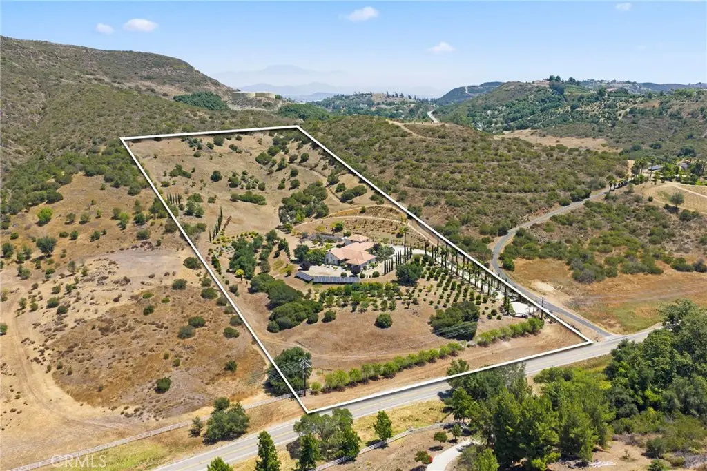 This Magnificent Mediterranean Estate is located in the prestigious are of De Luz - often called Millionaire's Row - Adjacent to the Santa Rosa Plateau and just 10 minutes from Interstate 15! Very Private - Located on approximately 11 acres of gentle land, with numerous fruit trees and flowers, fenced garden areas, chicken coop, and perfect to plant additional vineyards, citrus, or for Equestrian uses. Entering the elegant property through the gated entrance, up the gently curving driveway lined by roses, you will be happy to be home! The open floor plan has approximately 7,445 square feet, with 5 bedrooms and 4 baths on the main floor, plus a large office/gym/theatre room upstairs, with a bathroom & shower upstairs! The over sized 1,800 sf - 4 car garage plus workshop area, offers room for any vehicle, and plenty of storage - plus there are 2 separate 200 amp, 3 phase electrical panels with 220 v. outlets throughout the garage. The newer Solar system will reduce your electric costs substantially! The gourmet kitchen offers double granite islands, Profession Chef's appliances equipped with built-in Thermador and GE Monogram stainless appliances, huge walk-in pantry, separate breakfast nook with views, and is open to the Family Room with vaulted ceilings and fireplace. The Handmade tumbled marble mural backsplash and cast stone moldings accentuate the vineyard theme! The Primary Bedroom includes two walk-in closets, large vanity, Jacuzzi tub, and large walk-in shower. and the other bedrooms offer large closets and adjacent bathroons. The outdoor kitchen/BBQ is a perfect area for enjoying the evening sunsets. There is an oversized Laundry Room plus Utility Room which offer so much extra storage! Additional features: Whole house central vacuum, completely wired for Cat 5 high speed networking.
