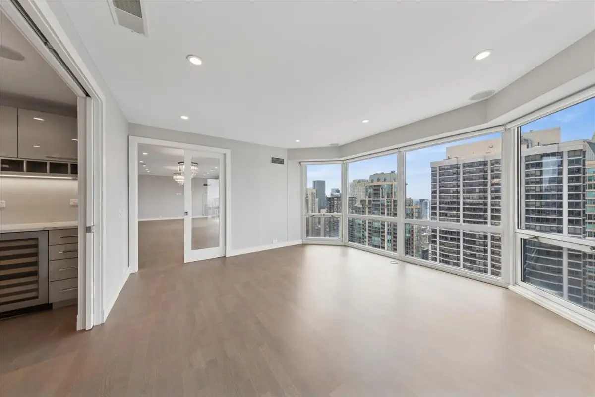 STUNNING RENOVATION has an open, harmonious layout with well-proportioned rooms designed for everyday living and entertaining! Spacious and sun-drenched on a high floor with sweeping west, north, and south views from every floor-to-ceiling window, this beautifully designed 3 bedroom, 2.5 bath residence (3rd BR currently used as Family Room/Office) exudes modern elegance and meticulous attention to detail. Wide plank flooring, custom glass pocket doors, designer lighting, and premium finishes create a seamless blend of sophistication and livability. The gourmet kitchen impresses with island seating, abundant custom cabinetry, high-end appliances, and a wine refrigerator - perfect for entertaining. Distinctive bath materials, integrated sound system, in-unit washer/dryer, and whole-home humidification add comfort and convenience. Heat and air conditioning included (electric for blower). Luxury building in an ideal location - steps from Michigan Avenue's Magnificent Mile shopping, dining, and transportation, this building offers superb service, fitness center, indoor pool, on-site dry cleaners, and valet or self parking for a fee. Don't miss this opportunity to enjoy this impeccable residence offering outstanding value in Chicago's most desirable neighborhoods! ***(NOTE: This floorplan (2100sf) is larger than the ""01"" tier units above the 39th floor).