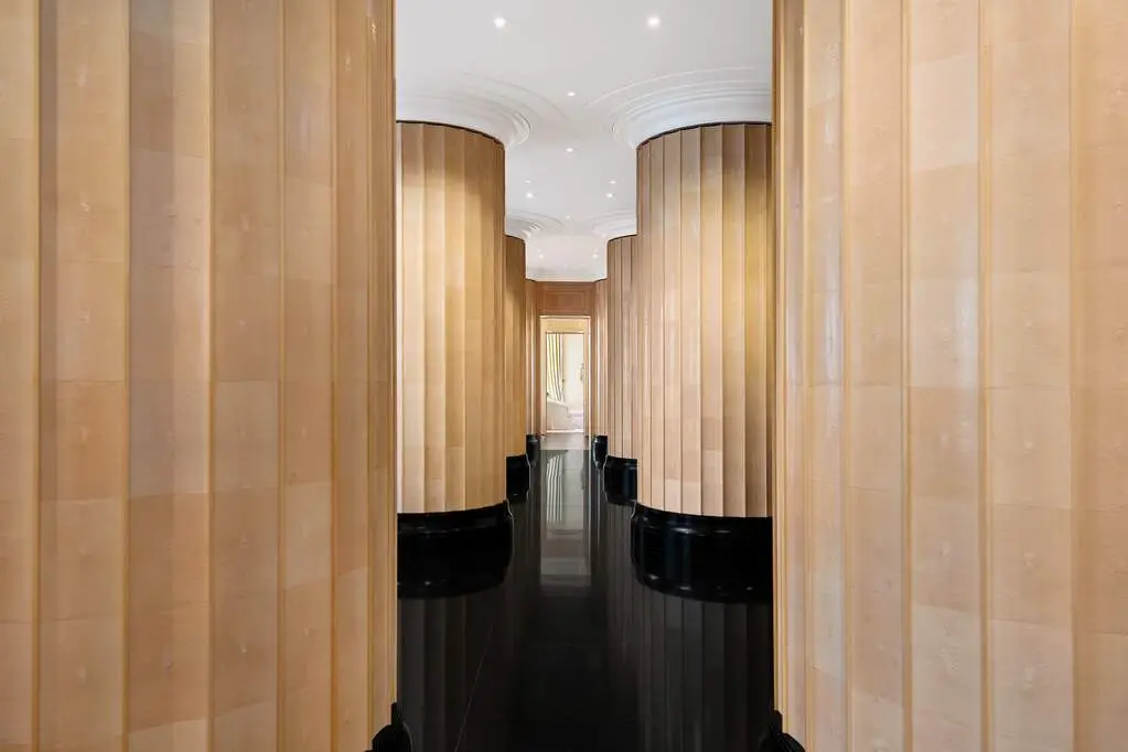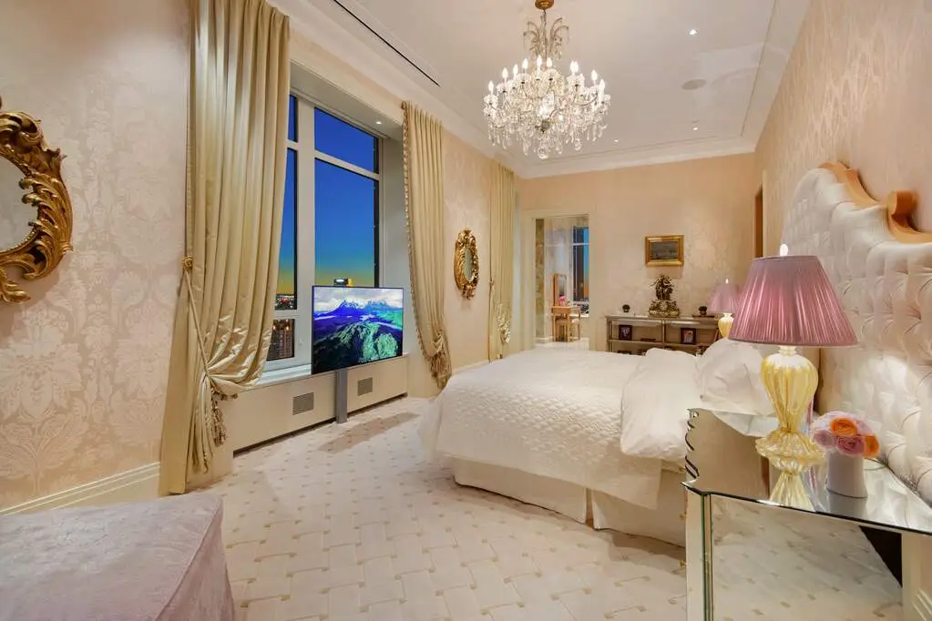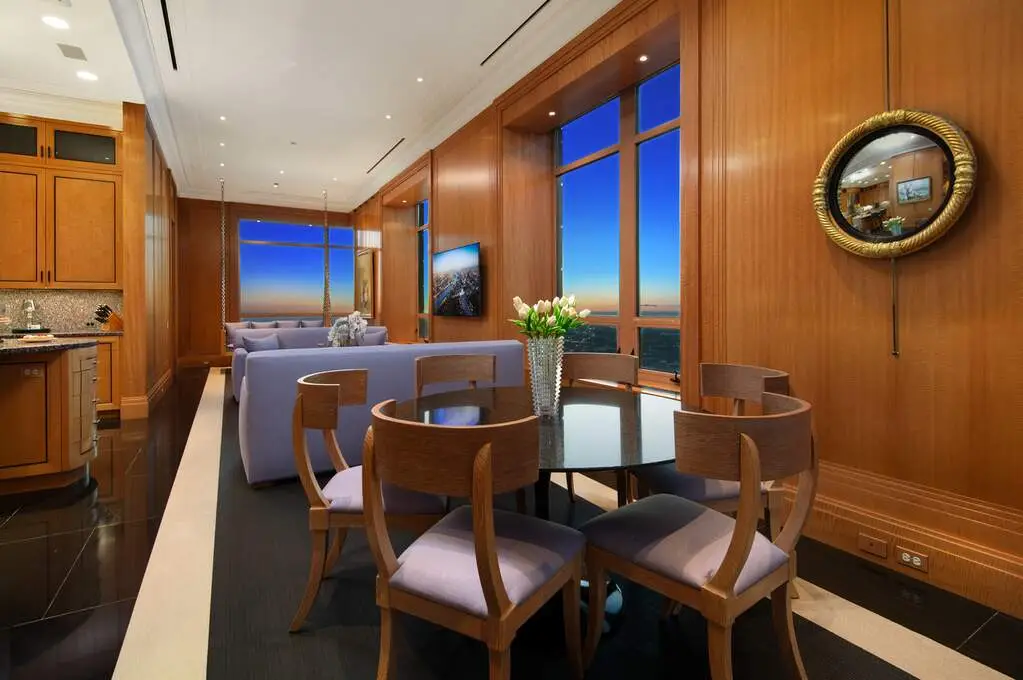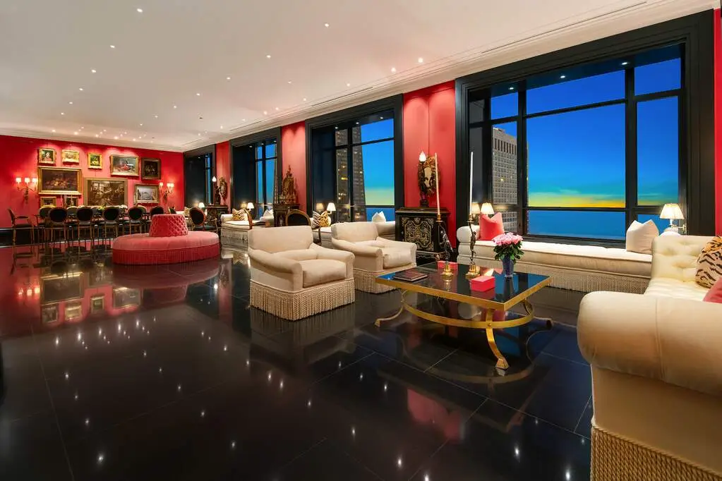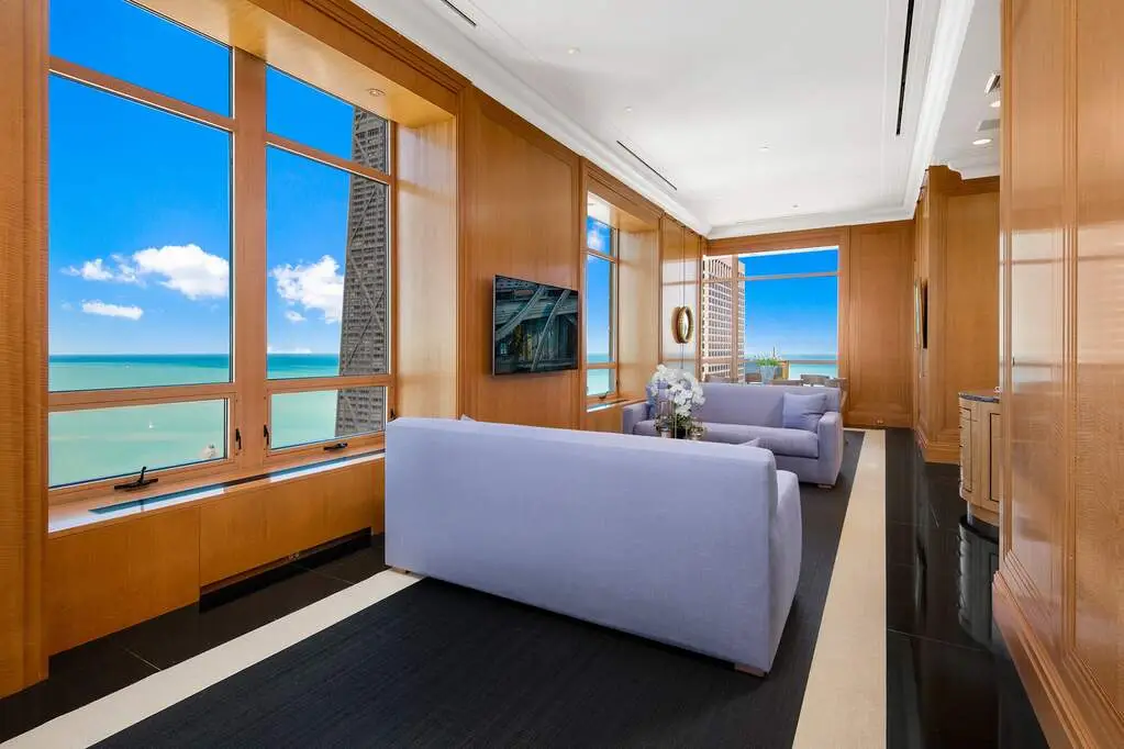 An oasis above the clouds, this one-of-a-kind penthouse comprises the entire 64th floor at the prestigious Park Tower on North Michigan Avenue. Spanning 8,500 SQFT, this 15-room apartment was meticulously crafted by the renowned architectural firm Marvin Herman & Associates and Interior Designer, Mitchell Turnbough. With a 360-degree view of the city, this unique residence is designed to provide an unobstructed panorama of Chicago's skyline. Access this penthouse via one of three elevators and a private elevator foyer, secured with custom designed filigree metal doors and state-of-the-art controls. Herman and Turnbough created a bold sense of exhilaration and drama as you step into the home. The entrance introduces the apartment's 12' ceiling grandeur with an allee of elegant, fluted columns wrapped in cream shagreen. Each space within the home has been purposefully designed to create a sense of majesty without traditional barriers, offering a fluid, uninterrupted walk around the apartment. The living spaces are open and conducive to modern family living, featuring high-level, durable finishes, and bespoke anegre wood paneling. The custom plaster cornice and walls were crafted by hand. Inspired by a vivid Ferragamo scarf, Turnbough enveloped the 2,400 SQFT grand living room and dining room walls in salmon-pink velvet. The space is further enriched with polished black granite floors and lacquered baseboards. The choice of red hues throughout the room enhances the natural light, creating a dynamic interplay of colors that shift with the day's arc, adding a sense of luxury and softness. This ensures the space is equally suited for stately celebrations and intimate gatherings, maintaining a sense of warmth and inclusion regardless of the event size. The dream kitchen features sprawling granite counterspace, top-of-the-line appliances, and is clad in impressive quarter cut figured anegre custom cabinets and wall paneling. A butler's pantry, a unique ovular island, and abundant storage complete the space. The kitchen opens to a great room showcasing spectacular lake and city views with north, east, and west exposures. This gracious space accommodates a breakfast room, a large family room, and a playful 8-person "porch swing," at the west corner of the family room, which floats gracefully from the 12 ft ceilings. The corner primary suite occupies the entire south wing and enjoys abundant sun from southeast exposures and views of the lake and the city down Michigan Avenue. Clad in quarter cut figured English sycamore paneling, no expense was spared in the custom closet & dressing room where you will find copious hanging space, a three-way mirror and a center island. The closet also doubles as a panic room. A luxurious ensuite bathroom, accoutered entirely in a soft golden-green onyx with book matched creamy marbling and gilded gold fittings, enjoys southwest corner views & features heated floors, a steam shower & tub with west-facing views. A sizeable home office paneled in quarter cut figured English sycamore flanks one side of the primary suite while a large exercise room flanks the other side and leads to the west wing of the residence, which is dedicated entirely to four ensuite guest rooms. The owner paid special attention to structural integrity and sound insulation, ensuring a reposeful living environment amidst the bustling city. From an aesthetic perspective, even the door hardware was exclusively designed by Marvin Herman for this penthouse, creating a high level of customization. The home is equipped with automated shades, smart Control 4 integrated surround sound & TV system. This residence offers a rare opportunity to own a significant piece of Chicago's architectural innovation, where every detail has been crafted to ensure unparalleled elegance & comfort. Enjoy Renowned Park Hyatt Hotel amenities at your disposal - 24 hour fitness center, indoor pool, spa, in-room dining, and the acclaimed NoMi restaurant