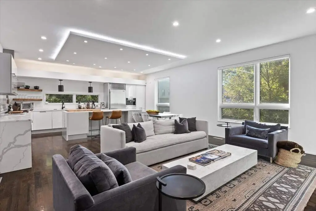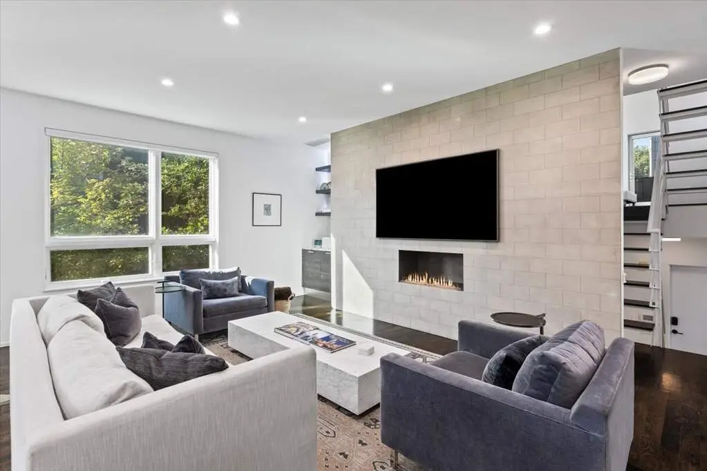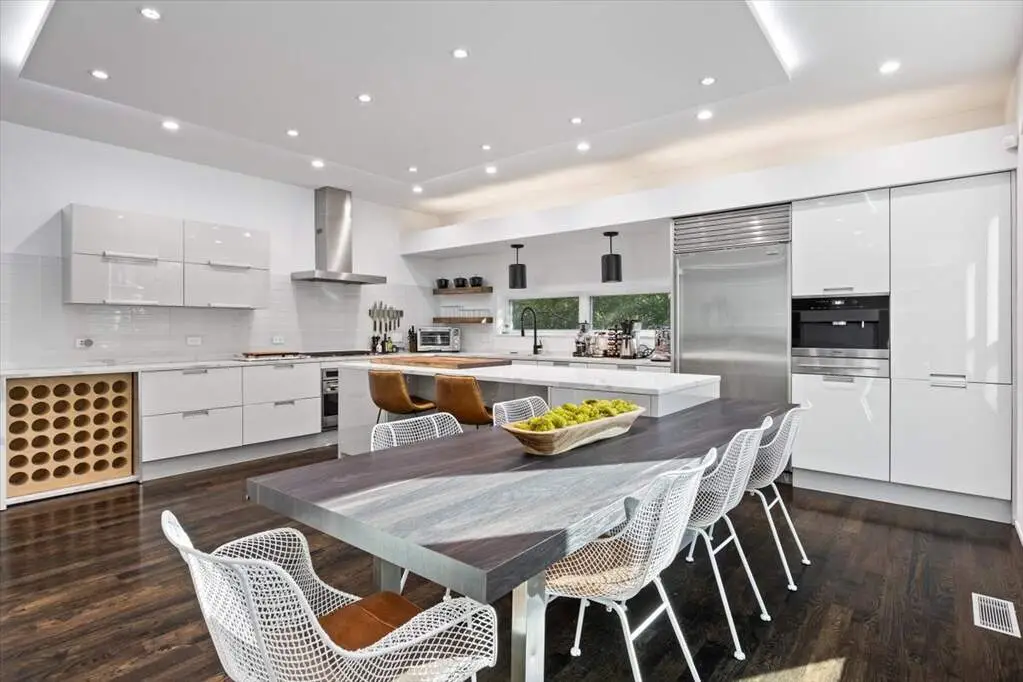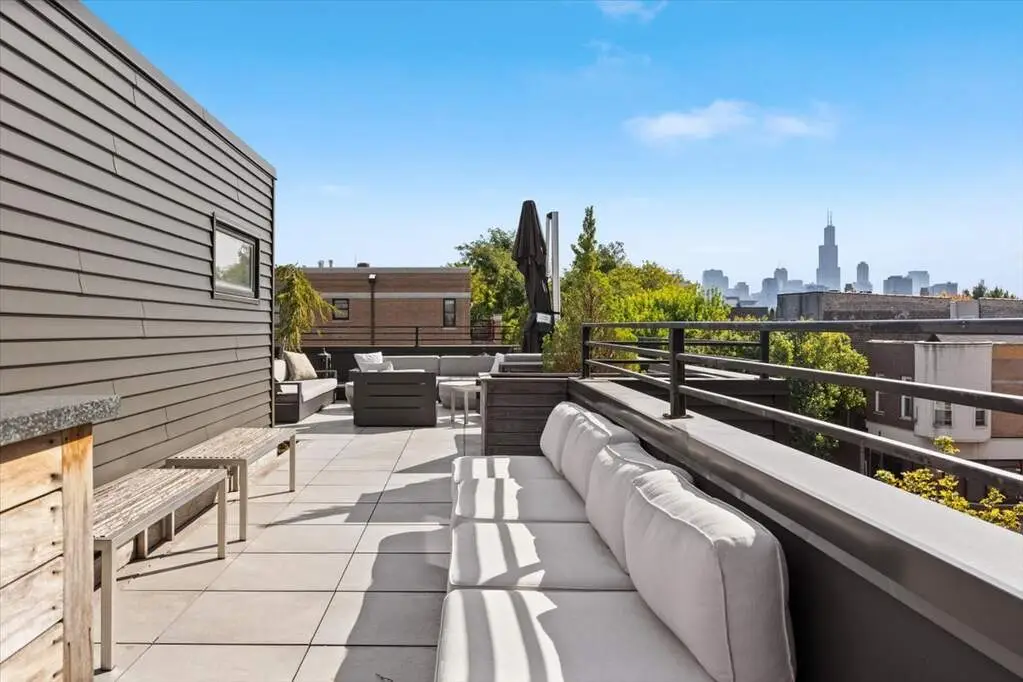 Beautifully modern and architecturally unique single family home in a prime West Town location. This unique floorplan lives extremely gracefully, with large room sizes due to the sculptural steel staircase in the center of the home. The loft-like main level is bright and airy with east and south facing windows. The kitchen is massive with a huge island and built-in dining table. Enjoy high end appliances with abundant counter and storage space. The kitchen overlooks the large family room with a striking tile fireplace wall and dry bar. The primary suite features custom built-in closets, and a large attached bathroom. The bathroom was recently updated with a double vanity and body sprays + rain head shower. The secondary bedrooms share a beautiful Jack and Jill bathroom. All upstairs bedrooms open directly to outdoor spaces. The rooftop deck is stunning with porcelain paver tiles, multiple seating areas, and a full outdoor kitchen with skyline views! The lower level features a media room with a built in projector screen and another bedroom and full bathroom. The cork floors add a modern flair. The attached 2 car garage with a curb cut offers extra parking and opens directly inside to the entryway. Walkable to dining and bars along Chicago Ave and with easy access to downtown and the highway and more, this location is incredibly convenient!