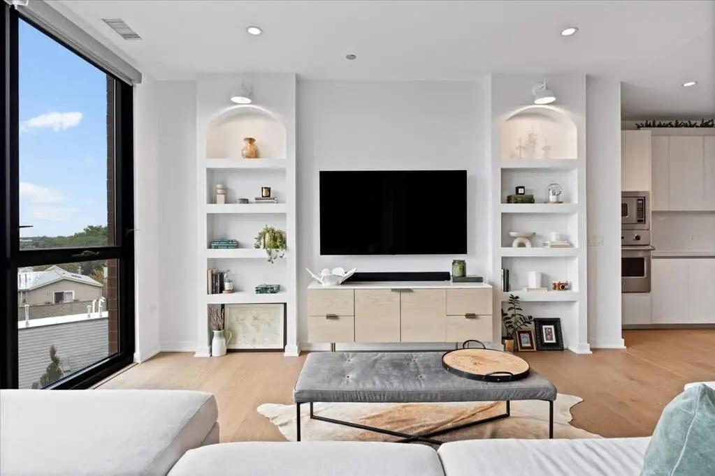Set within Alcove, a boutique all-brick elevator building tucked behind a private courtyard, this luxurious 4-bedroom, 3.5-bath home offers the perfect blend of vibrant city living and serene privacy. Just steps from the Blue Line, acclaimed restaurants and shopping, this spacious 2,365-SF corner unit features a large private balcony and access to a common rooftop deck with skyline views. Every detail of this home has been elevated with thoughtful, high-end customizations. A stunning fluted marble dry bar framed by a custom archway serves as a show-stopping centerpiece, while composite decking transforms the private balcony into a polished outdoor retreat. Inside, bespoke living room built-ins, designer lighting, and custom window treatments throughout. The chef's kitchen boasts Viking stainless steel appliances, Italian cabinetry, and quartz countertops, seamlessly connecting to the expansive open concept living and dining areas. Primary suite with two closets, large ensuite bathroom with free standing soaking tub. Additional guest suite with ensuite bathroom and walk-in closet. Two additional large bedrooms with custom chair rail molding and third full bath. All closets finished with custom buildouts. Additional highlights include wide-plank wood flooring, large, fully organized, walk-in pantry, smart home capabilities, and a fully finished laundry room with built-in cabinetry and folding counter. This residence isn't just move-in ready, it's meticulously designed for the way you live, offering unmatched comfort, style, and location in one of Chicago's most sought-after neighborhoods. Garage parking and addl' storage included.