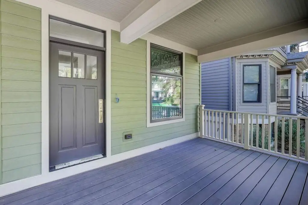 Farrow & Ball paint palette Wide, deep front porch overlooking tree-lined streets Wolf/SubZero/Cove professional appliances in spectacular custom kitchen Floor-to-ceiling walnut and limestone fireplace Restored art glass and imaginative reuse of original features