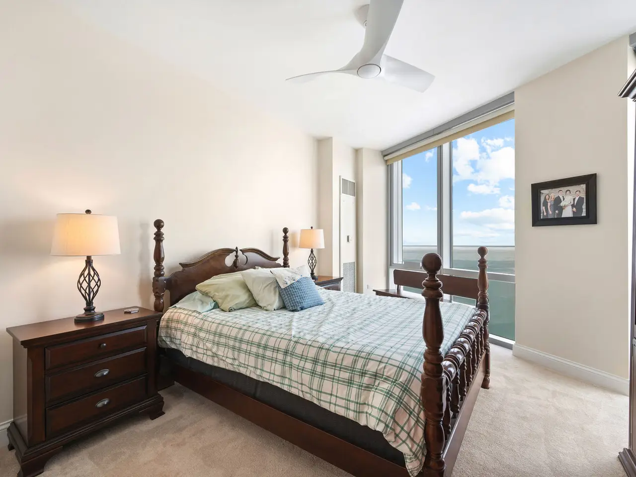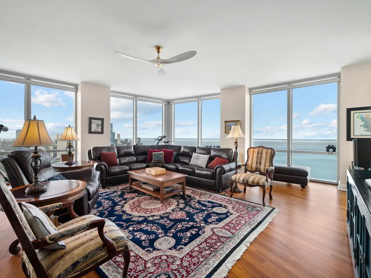 Floor-to-ceiling windows with panoramic city and lake views